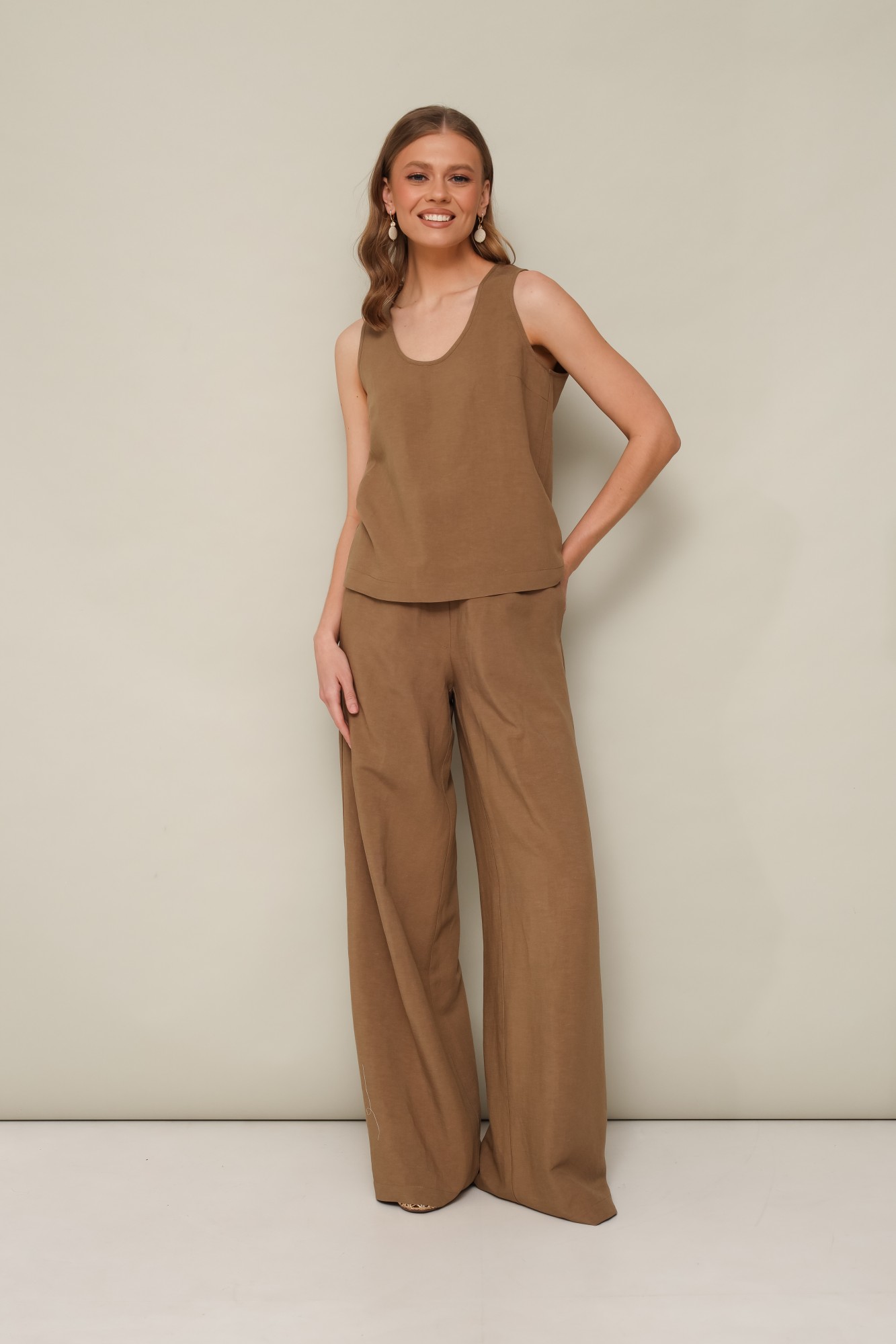 Расслабленный 2-предметный комплект актуального кроя, состоящий из топа и брюк. Топ прямого силуэта, в боковых швах по низу обработаны разрезы. Брюки с притачным, отстроченным поясом на резинке и с боковыми наклонными карманами. Спереди брюк - имитация гульфика.