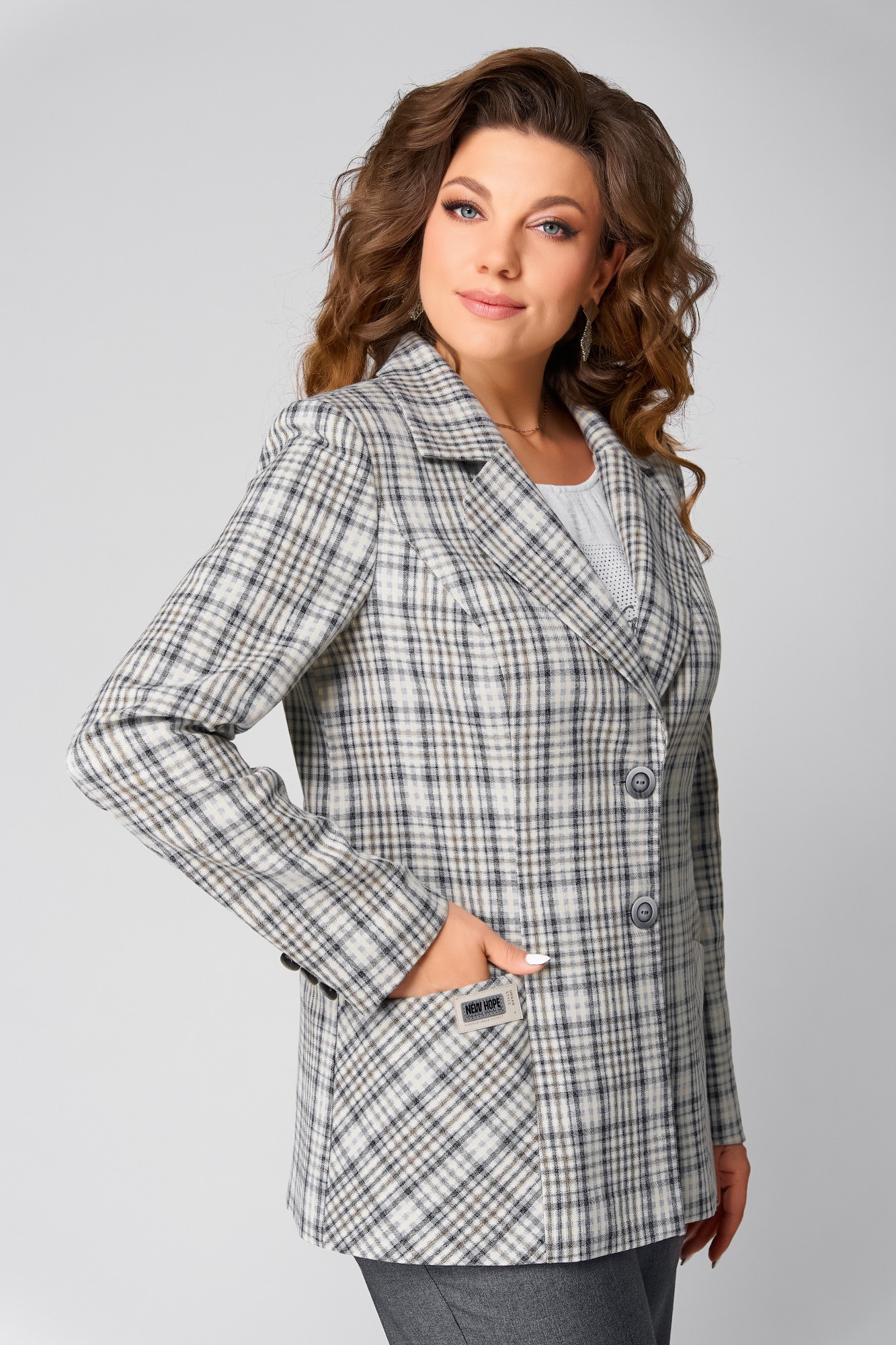 жакет: 60% вискоза, 36% полиамид 4% спандекс; брюки и блузка: 70% полиэстер, 30% вискоза.