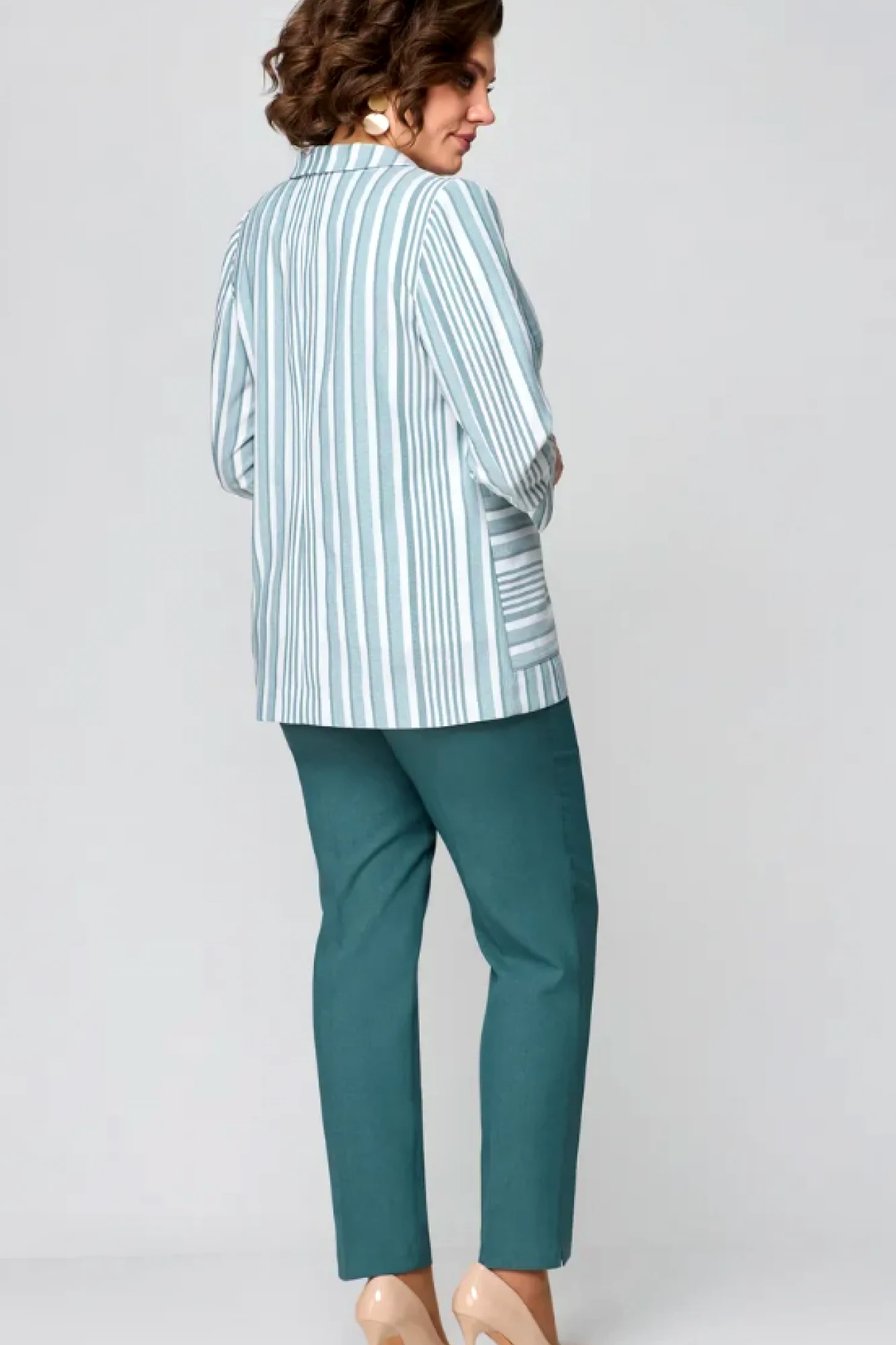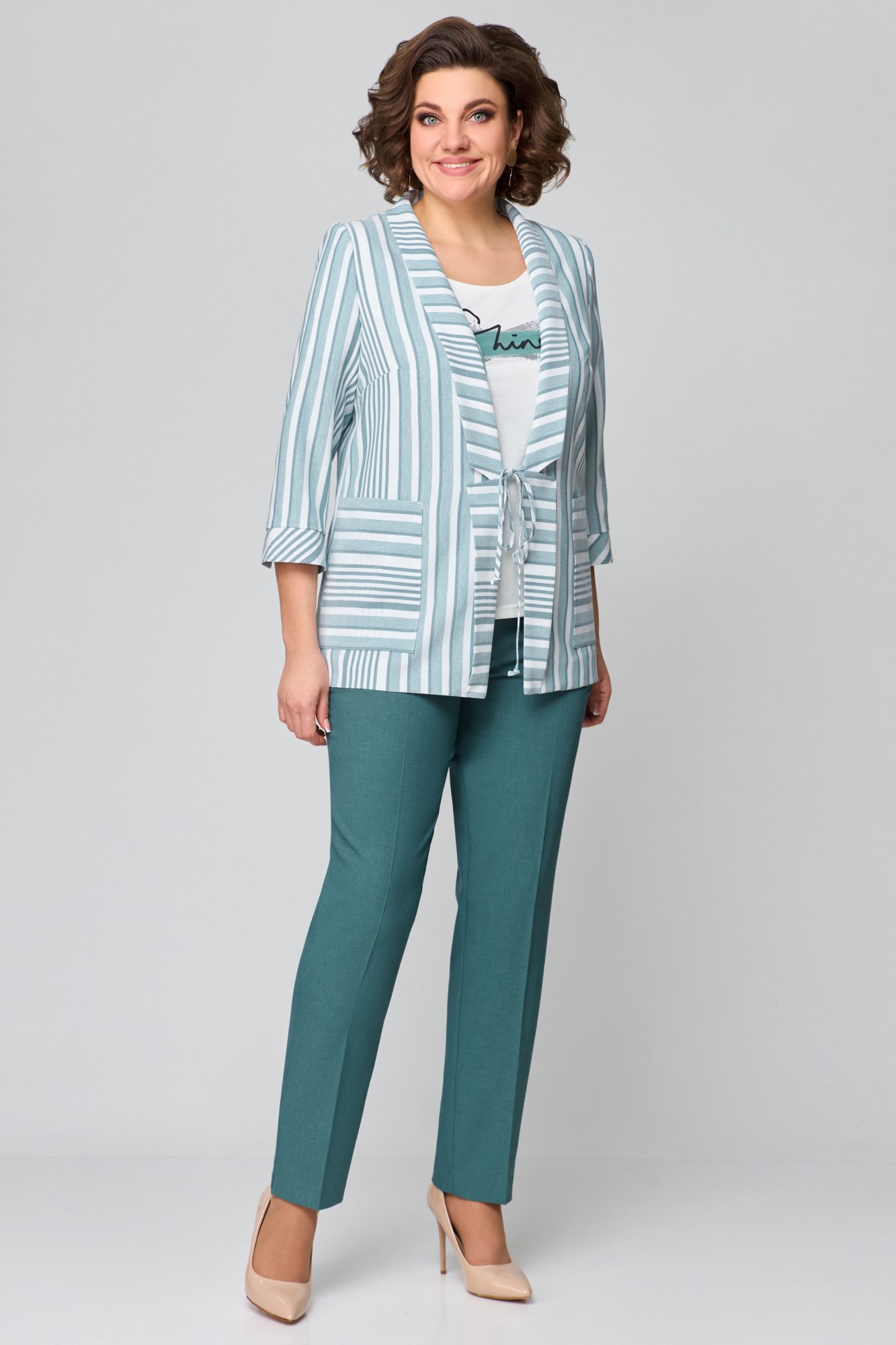 Жакет – полиэстер 44%, вискоза 39%, лен 17%. Топ – хлопок 94%, лайкра 6%. Брюки – полиэстер 44%, вискоза 39%, лен 17%