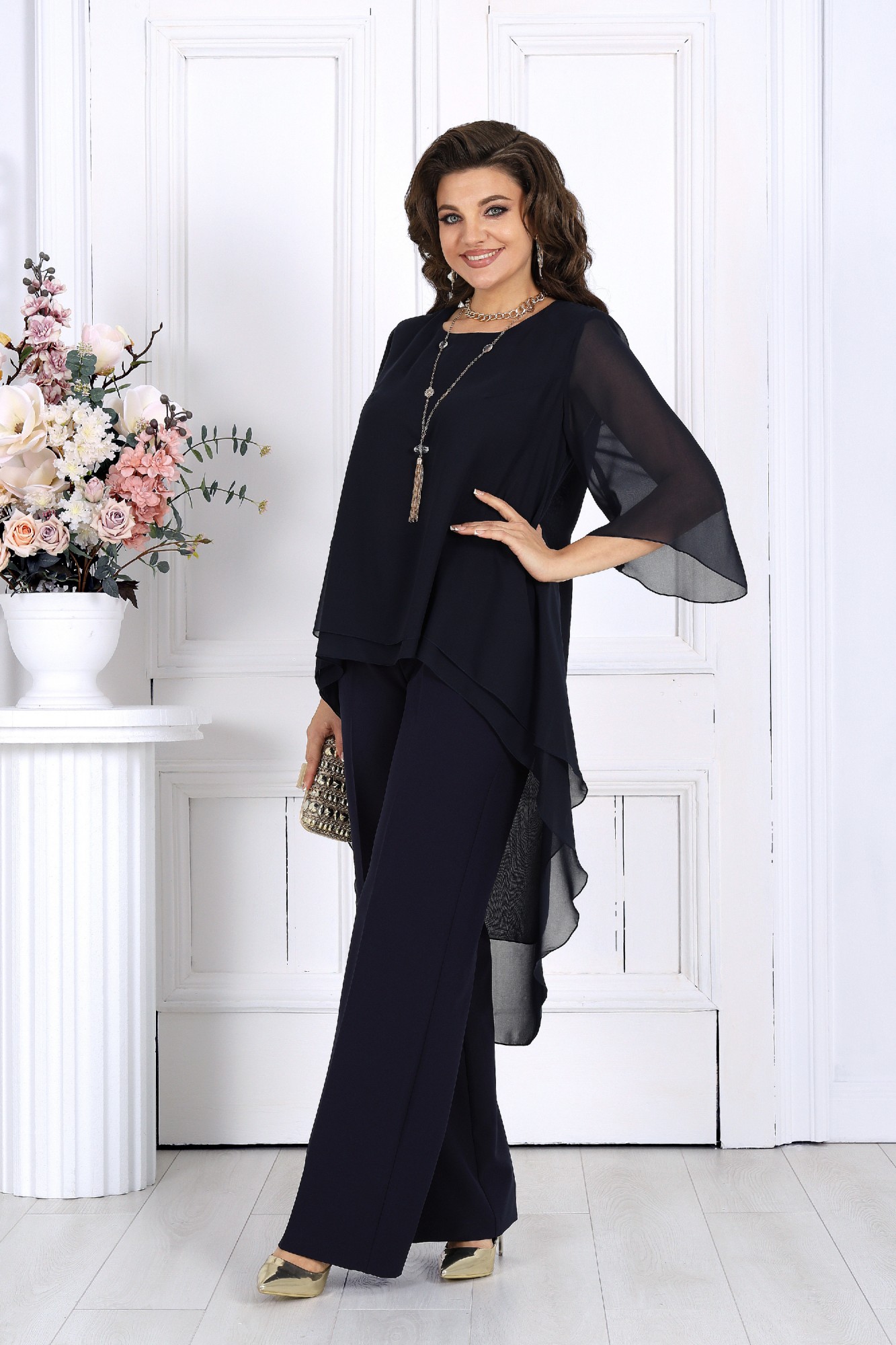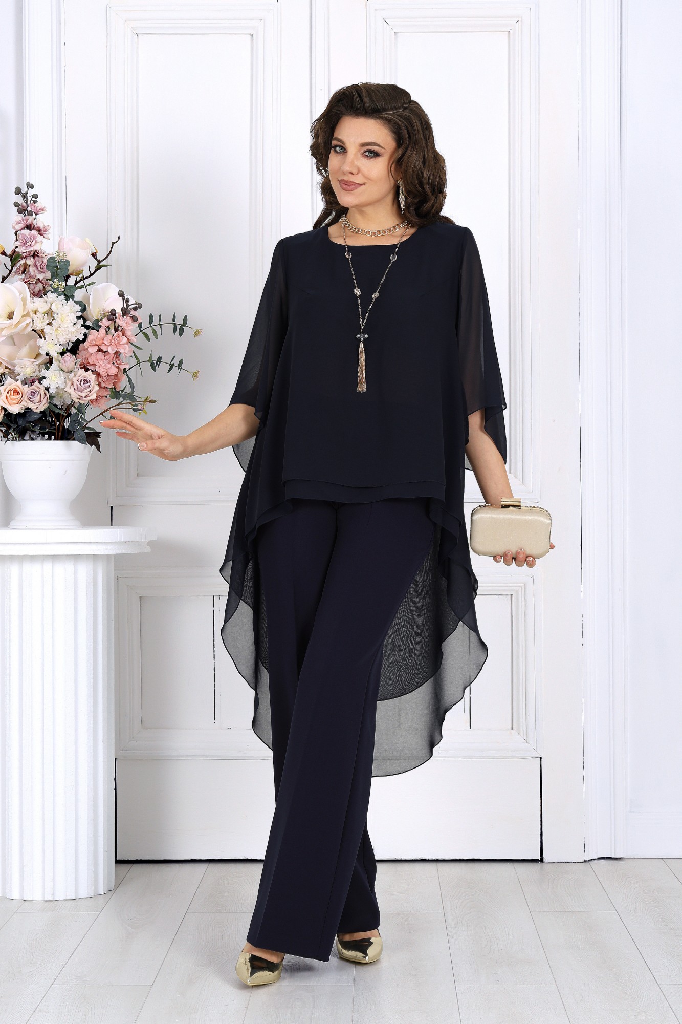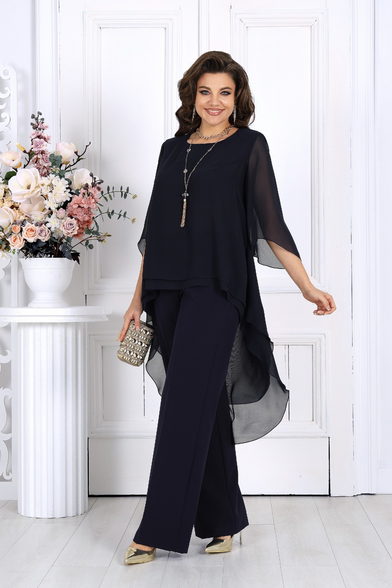 Элегантный брючный костюм – идеальный выбор для вечернего выхода, торжества или особого случая. Легкая шифоновая туника с асимметричным кроем и струящимися рукавами добавляет образу воздушности и утонченности. Удлиненная спинка делает силуэт элегантным и зрительно вытягивает фигуру. Прямые классические брюки из костюмной ткани великолепно садятся по фигуре, обеспечивая комфорт на протяжении всего дня. Идеально подойдет для вечернего выхода, праздников и торжественных мероприятий. Легкий и женственный образ для любого типа фигуры. Комплект брючный 2-х предметный, состоящий из туники и брюк. Туника А-образного силуэта, выполнена из шифона. Модель без подкладки и застежки, с плечевыми накладками. Низ туники асимметричной формы: укороченный спереди и удлиненный к центру спинки. Перед и спинка состоят из двух разных по длине слоев: верхний спереди короче нижнего на 4 см, а по спинке на 16 см. Горловина переда и спинки округлая, по переду слегка углубленная. Рукав, втачной, расширенный, с фигурным низом. Длина туники (по середине спинки) – 118 см (46-50 р-р), 119 см (52-60 р-р); длина рукава – 41 см (46-50 р-р), 42 см (52-60 р-р). Брюки классические длинные, прямого силуэта, с посадкой на талии, выполнены из костюмно-плательного ткани. Модель с центральной застёжкой на тесьму-«молнию», на притачном поясе, застегивающемся на петлю и пуговицу. Передние и задние половинки брюк с таллиевыми вытачками, направленными от пояса вниз. Спереди обработаны боковые наклонные карманы. Для лучшего прилегания брюк в области талии в поясе, по задним половинкам вставлена эластичная лента. Длина брюк по боковому (с поясом) – 107 см (46-50 р-р.), 108 см (52-54 р-р), 109 см (56-60 р-р).