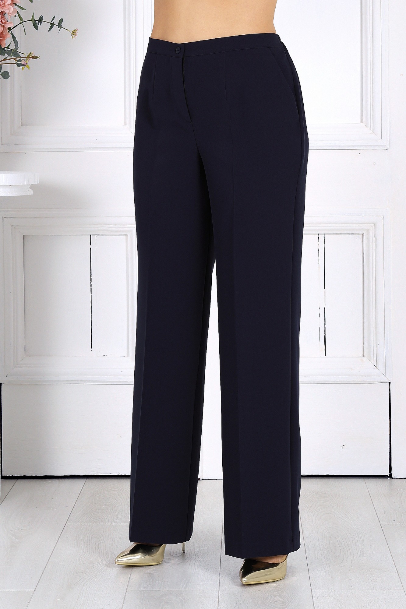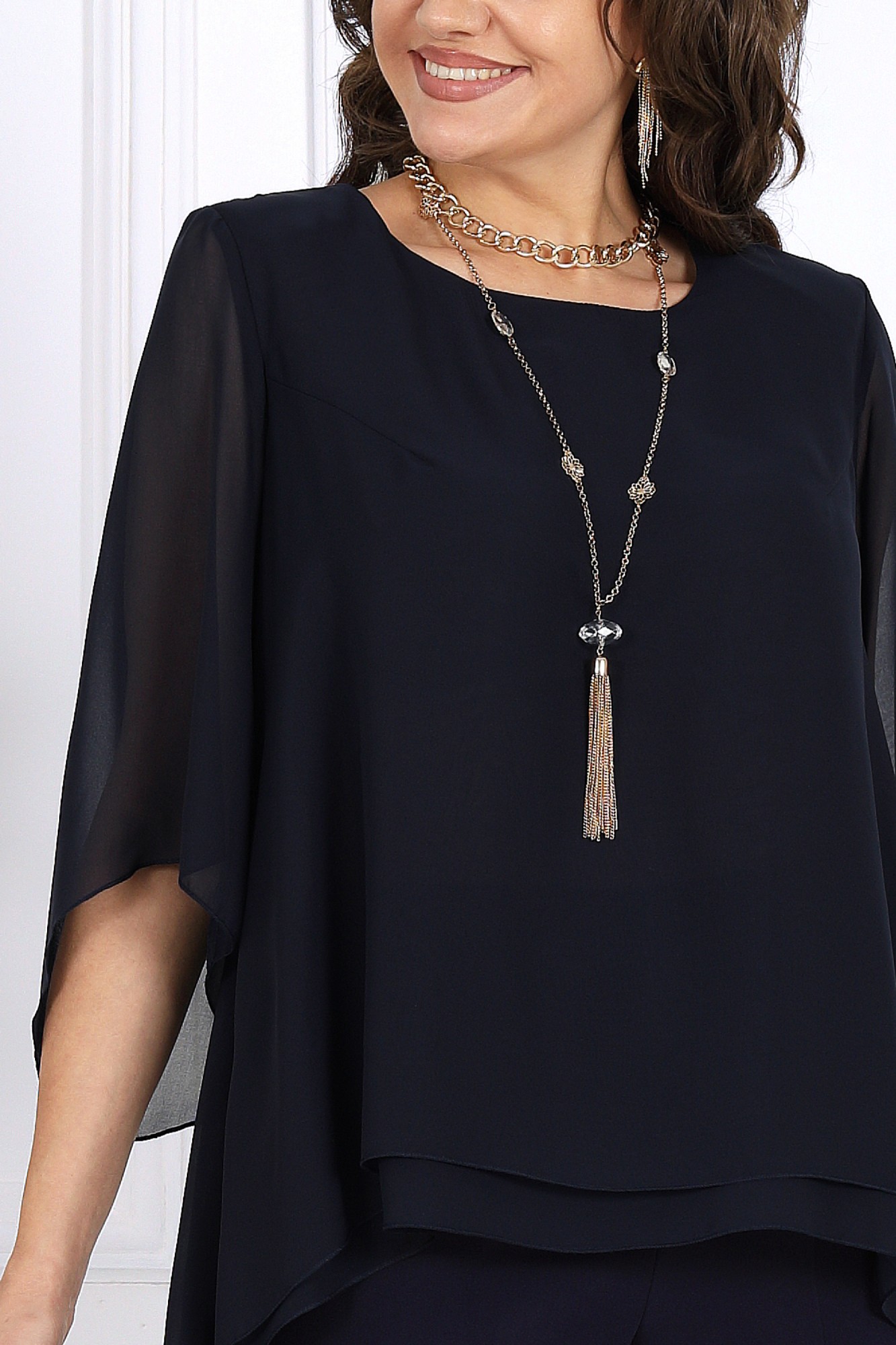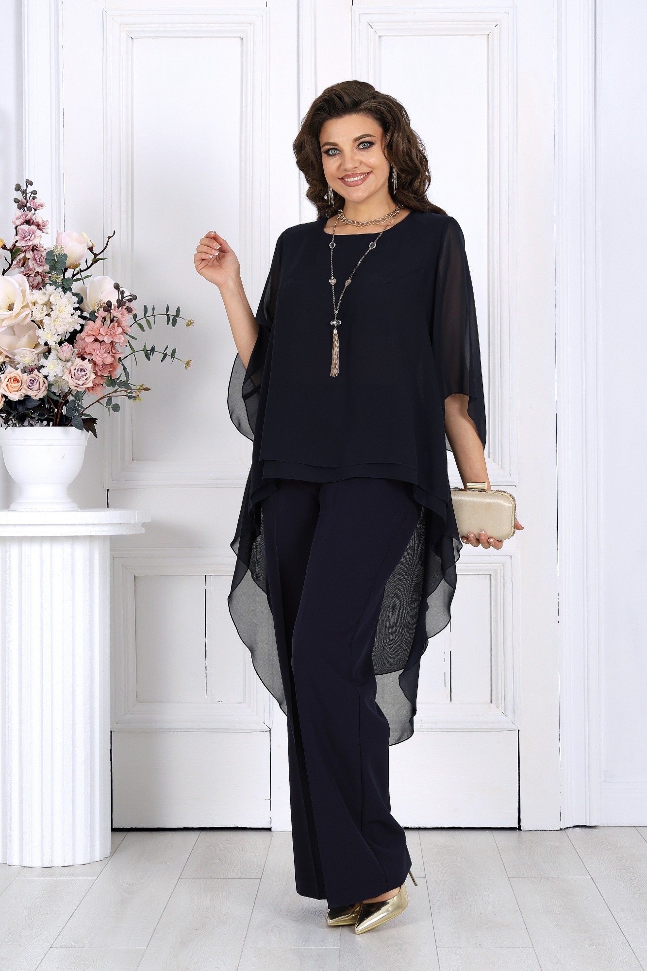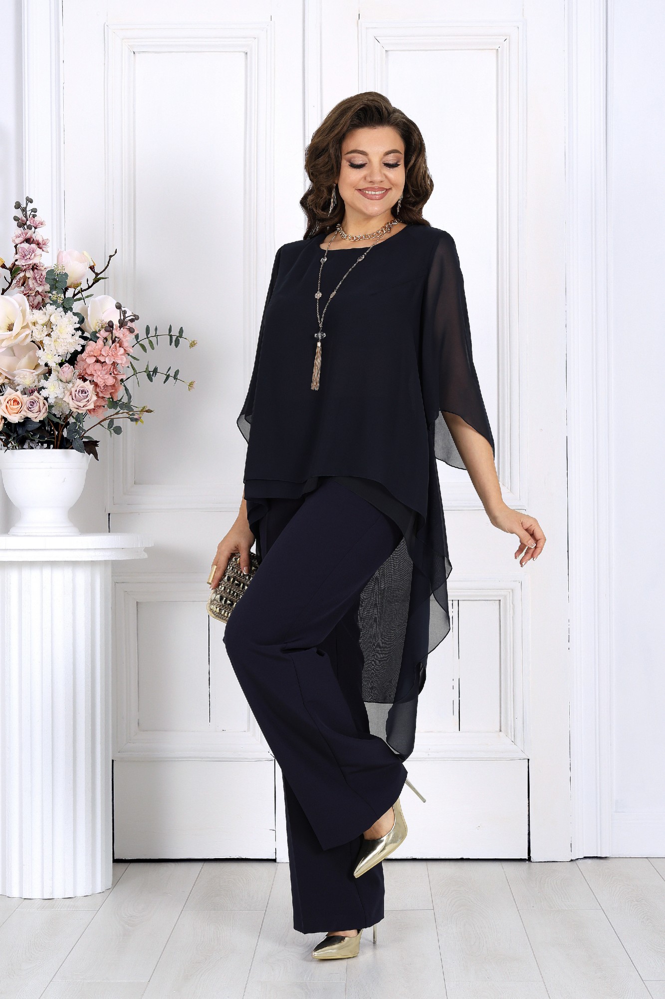 Элегантный брючный костюм – идеальный выбор для вечернего выхода, торжества или особого случая. Легкая шифоновая туника с асимметричным кроем и струящимися рукавами добавляет образу воздушности и утонченности. Удлиненная спинка делает силуэт элегантным и зрительно вытягивает фигуру. Прямые классические брюки из костюмной ткани великолепно садятся по фигуре, обеспечивая комфорт на протяжении всего дня. Идеально подойдет для вечернего выхода, праздников и торжественных мероприятий. Легкий и женственный образ для любого типа фигуры. Комплект брючный 2-х предметный, состоящий из туники и брюк. Туника А-образного силуэта, выполнена из шифона. Модель без подкладки и застежки, с плечевыми накладками. Низ туники асимметричной формы: укороченный спереди и удлиненный к центру спинки. Перед и спинка состоят из двух разных по длине слоев: верхний спереди короче нижнего на 4 см, а по спинке на 16 см. Горловина переда и спинки округлая, по переду слегка углубленная. Рукав, втачной, расширенный, с фигурным низом. Длина туники (по середине спинки) – 118 см (46-50 р-р), 119 см (52-60 р-р); длина рукава – 41 см (46-50 р-р), 42 см (52-60 р-р). Брюки классические длинные, прямого силуэта, с посадкой на талии, выполнены из костюмно-плательного ткани. Модель с центральной застёжкой на тесьму-«молнию», на притачном поясе, застегивающемся на петлю и пуговицу. Передние и задние половинки брюк с таллиевыми вытачками, направленными от пояса вниз. Спереди обработаны боковые наклонные карманы. Для лучшего прилегания брюк в области талии в поясе, по задним половинкам вставлена эластичная лента. Длина брюк по боковому (с поясом) – 107 см (46-50 р-р.), 108 см (52-54 р-р), 109 см (56-60 р-р).
