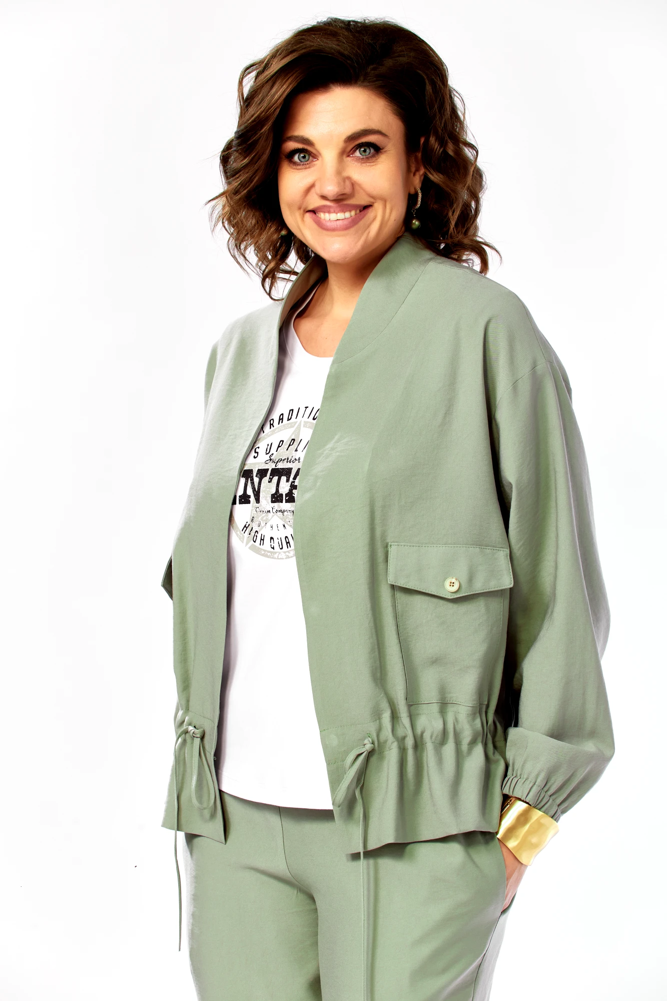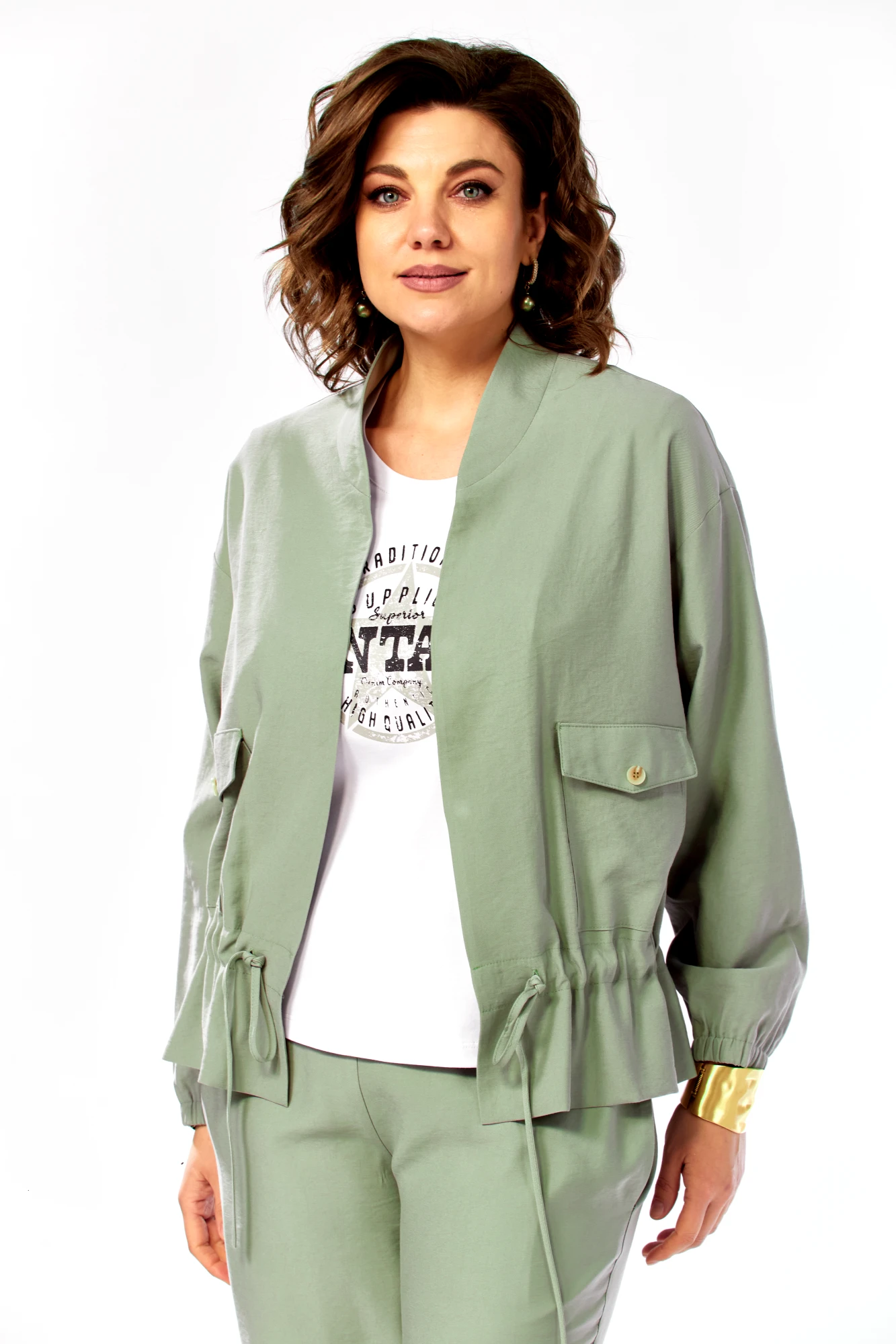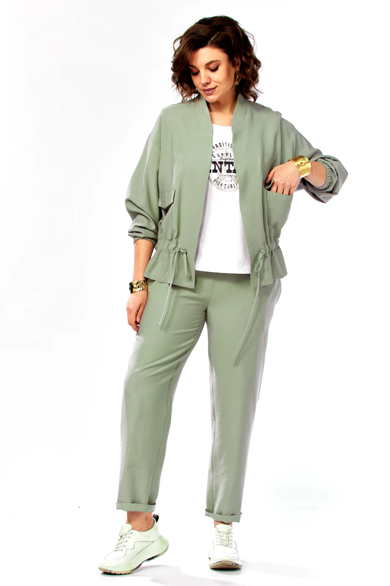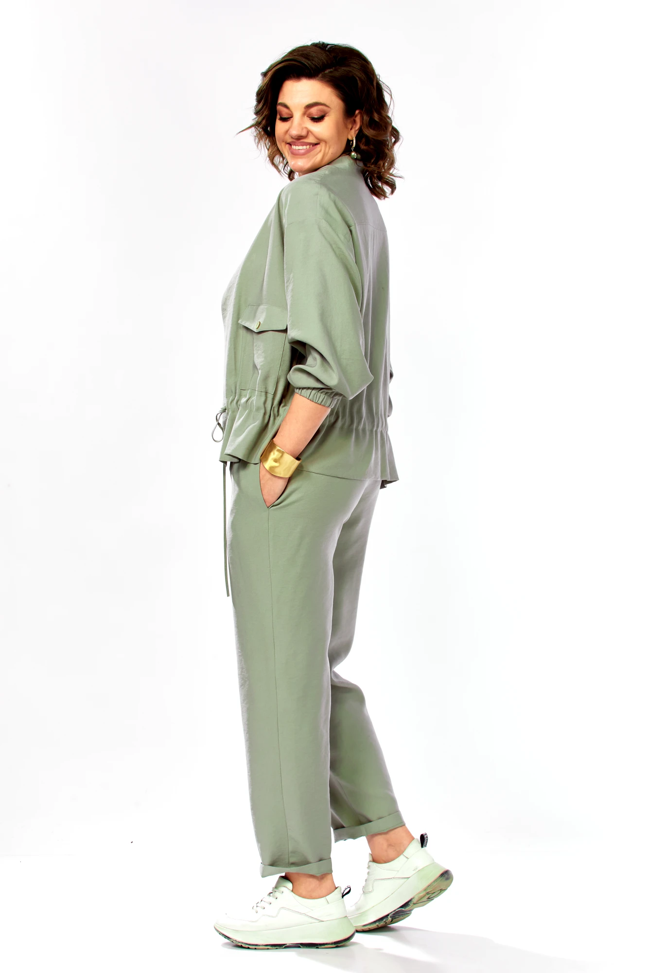 Брючный костюм Ольга Стиль С1011 тройка серо-зеленый