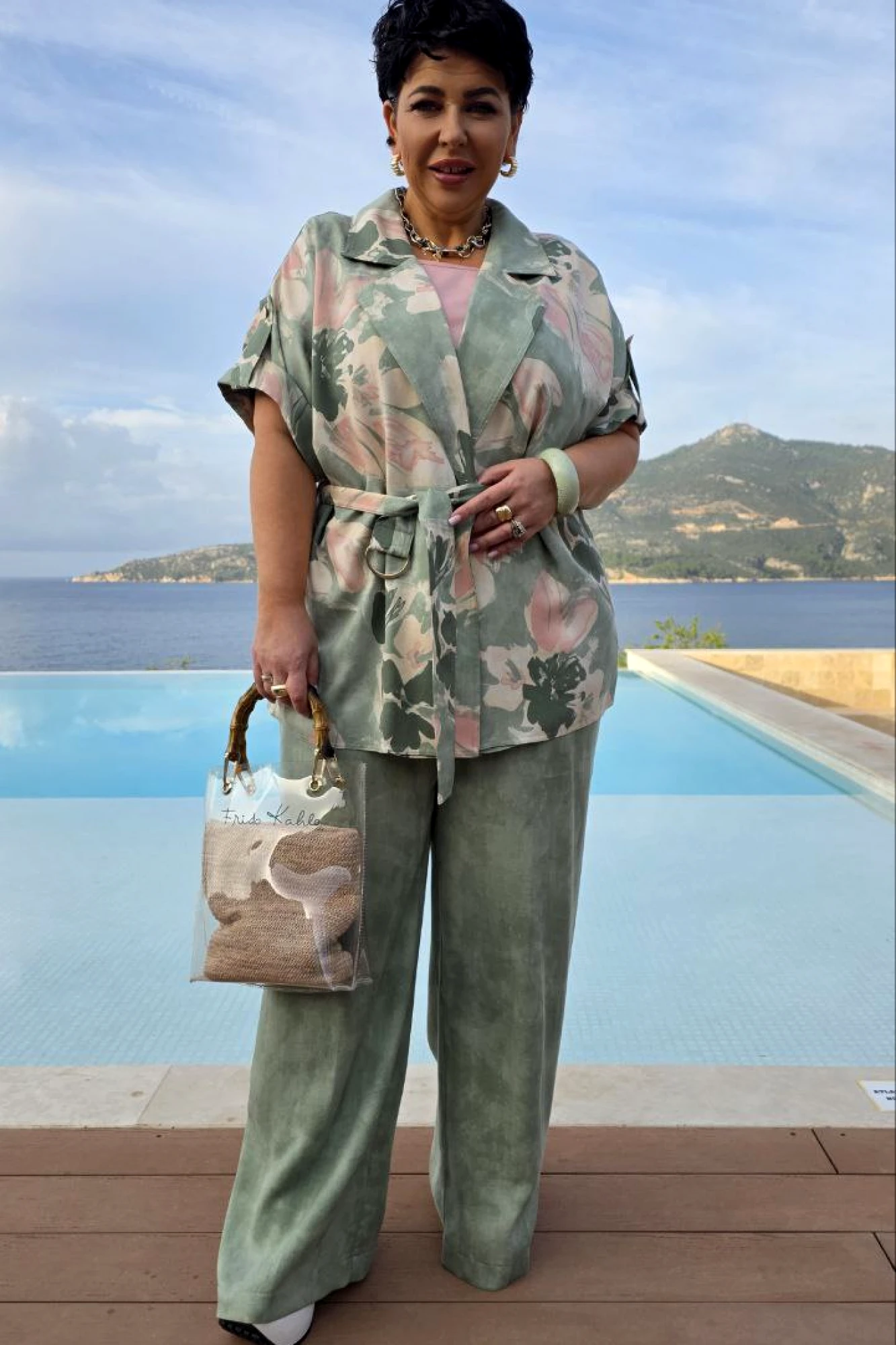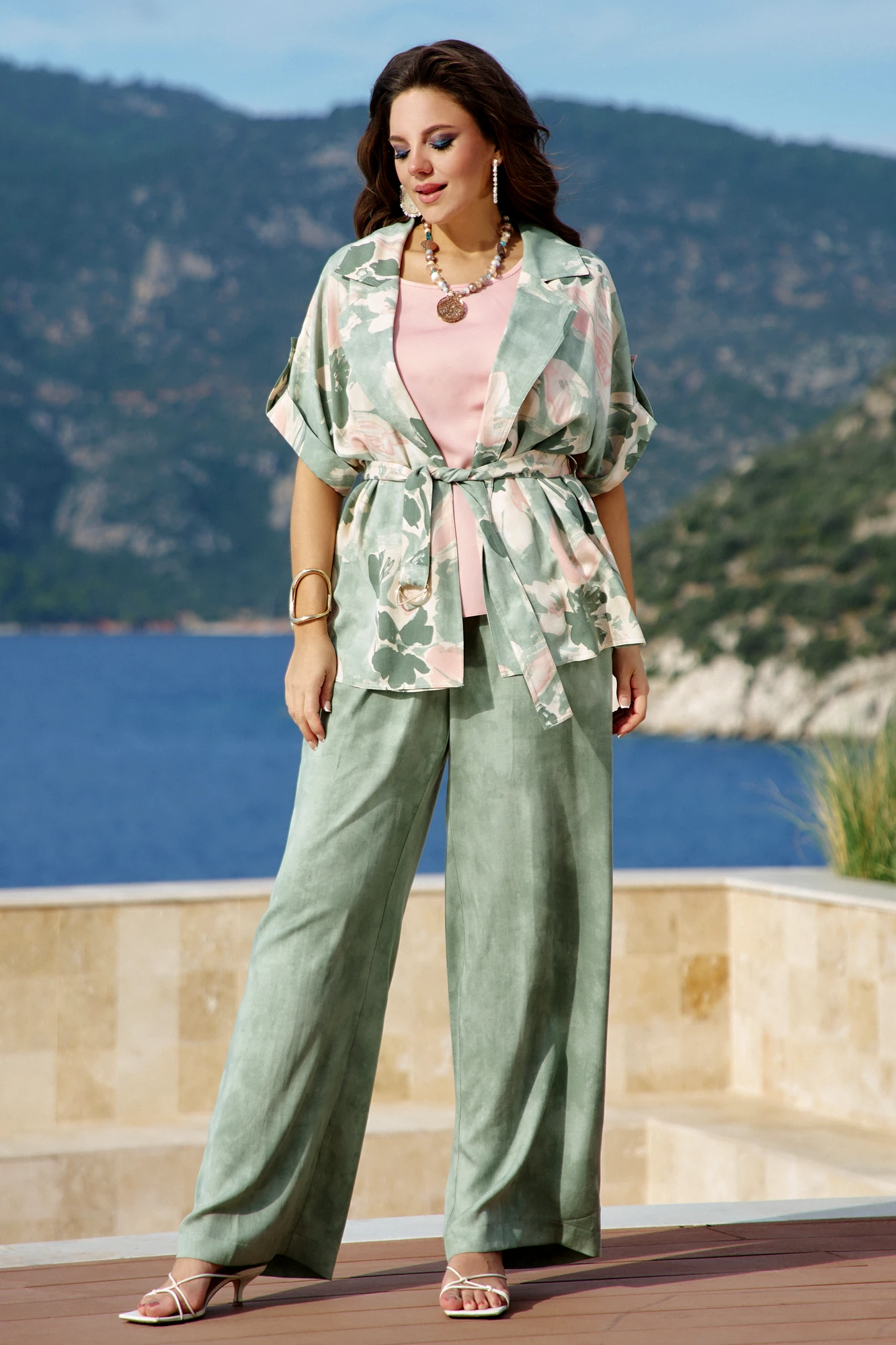 Брючный костюм Vittoria Queen 27913 тройка зеленый меланж, принт