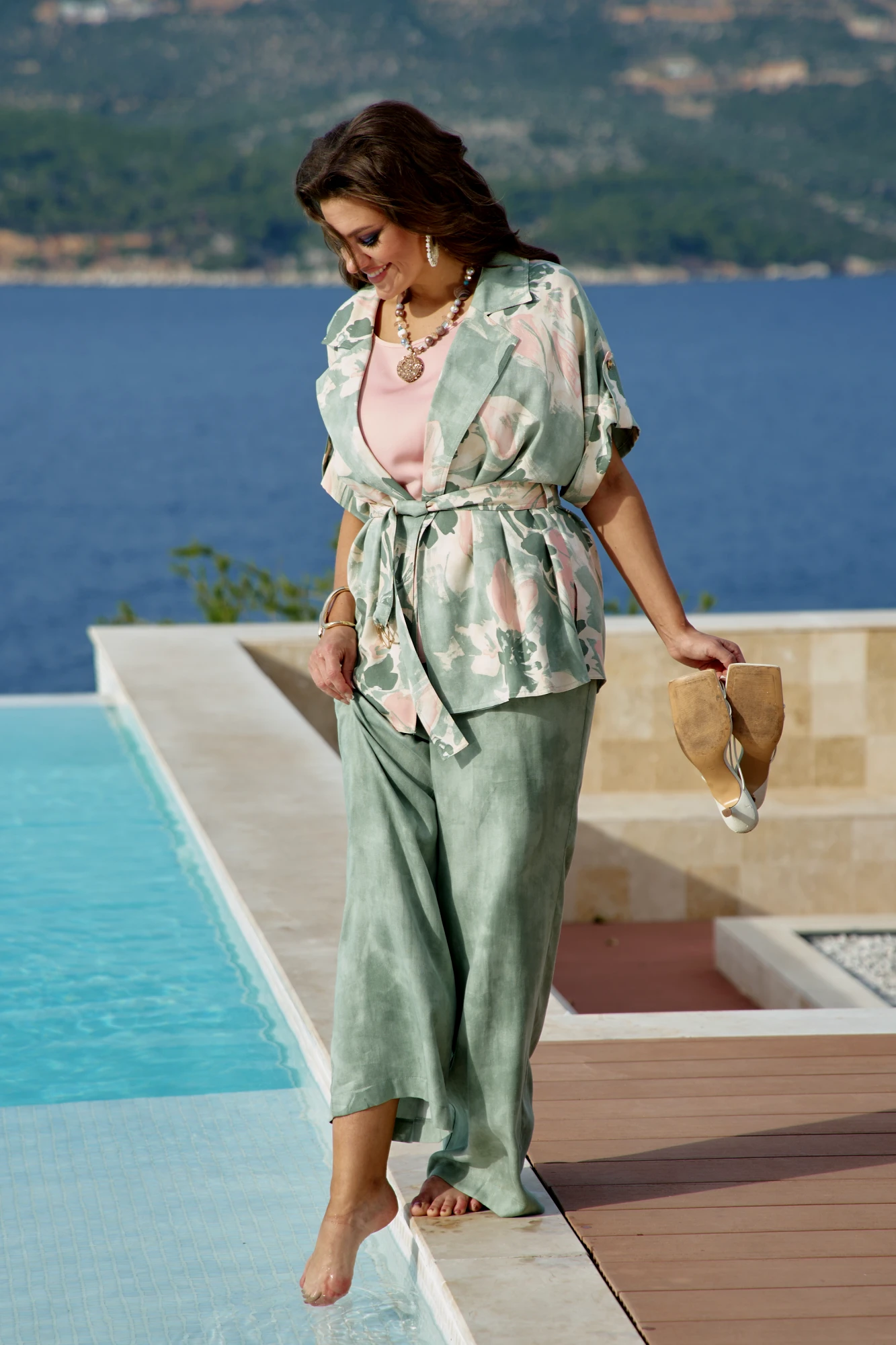 Состав: брюки и жакет 100% тенсел, блуза 100% полиэстер.