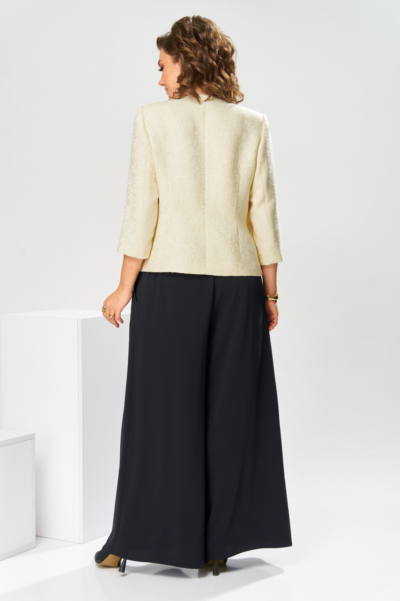 Костюм женский относится к нарядной торжественной одежде. Костюм женский 2-х предметный жакет и брюки. Жакет женский полуприлегающего силуэта, длиной до линии бёдер. Перед с 2-мя нагрудными вытачками с притачными планками по горловине, декорированными надстрочной отделочной тесьмой, с 2-мя надстрочными вертикальными планками, с 2-мя прорезными карманами с клапаном с закруглёнными концами и листочкой, клапан декорирован надстрочной отделочной тесьмой, карманы расположены ниже линии талии на 2 см. Спинка с 2-мя таллиевыми вытачками и средним швом. Горловина круглая, обточная, без воротника. Застёжка центральная бортовая на 6-ть вертикально обмётанных петель и 6-ть пришивных пуговиц. Рукав 2-х шовный втачной, длиной 3/4. Жакет на притачной подкладке. Брюки женские, широкие, длинные. Передние половинки со встречными складками с карманами в боковых швах. Задние половинки без конструктивных особенностей. Брюки с притачным поясом, собранным на эластичную тесьму, закреплённую 2-мя отделочными строчками.