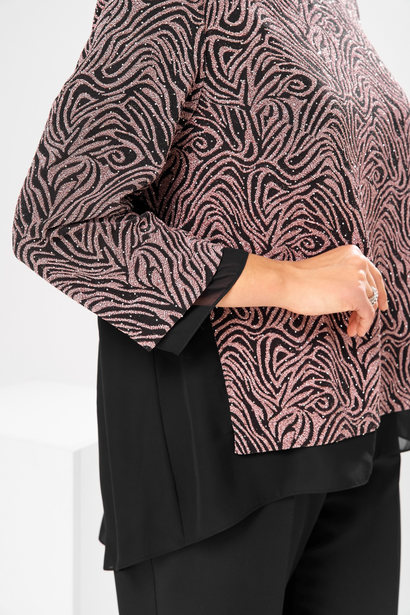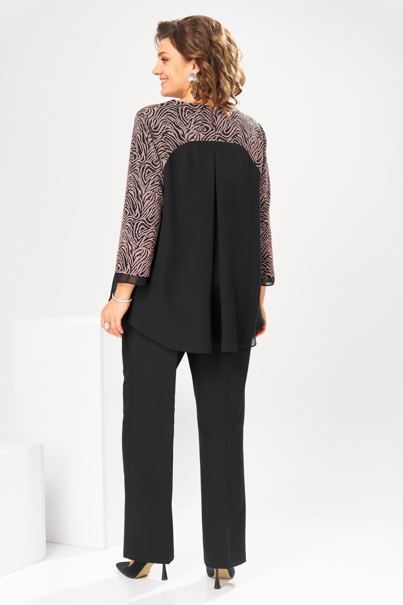 Костюм женский предназначен для торжественной носки: блузон и брюки. Блузон прямого силуэта, длиной до линии бедер с фигурным низом. Перед с двумя нагрудными вытачками. Спинка с отрезной кокеткой со средним швом, с бантовой складкой, переходящая на перед. Горловина круглая, обтачная, без воротника. Застежка на среднем шве кокетки спинки на одну навесную петлю и одну пришивную пуговицу. Рукав одношовный, длиной 7/8 с притачной отделочной деталью. Блузон с плечевыми накладками. Брюки прямые, слегка заужены книзу. Передние и задние половинки с талиевыми вытачками. Застежка на тесьму-молнию в среднем шве брюк. Верхний срез с притачным поясом, застегивающийся на одну обметанную петли и одну пришивную пуговицу.