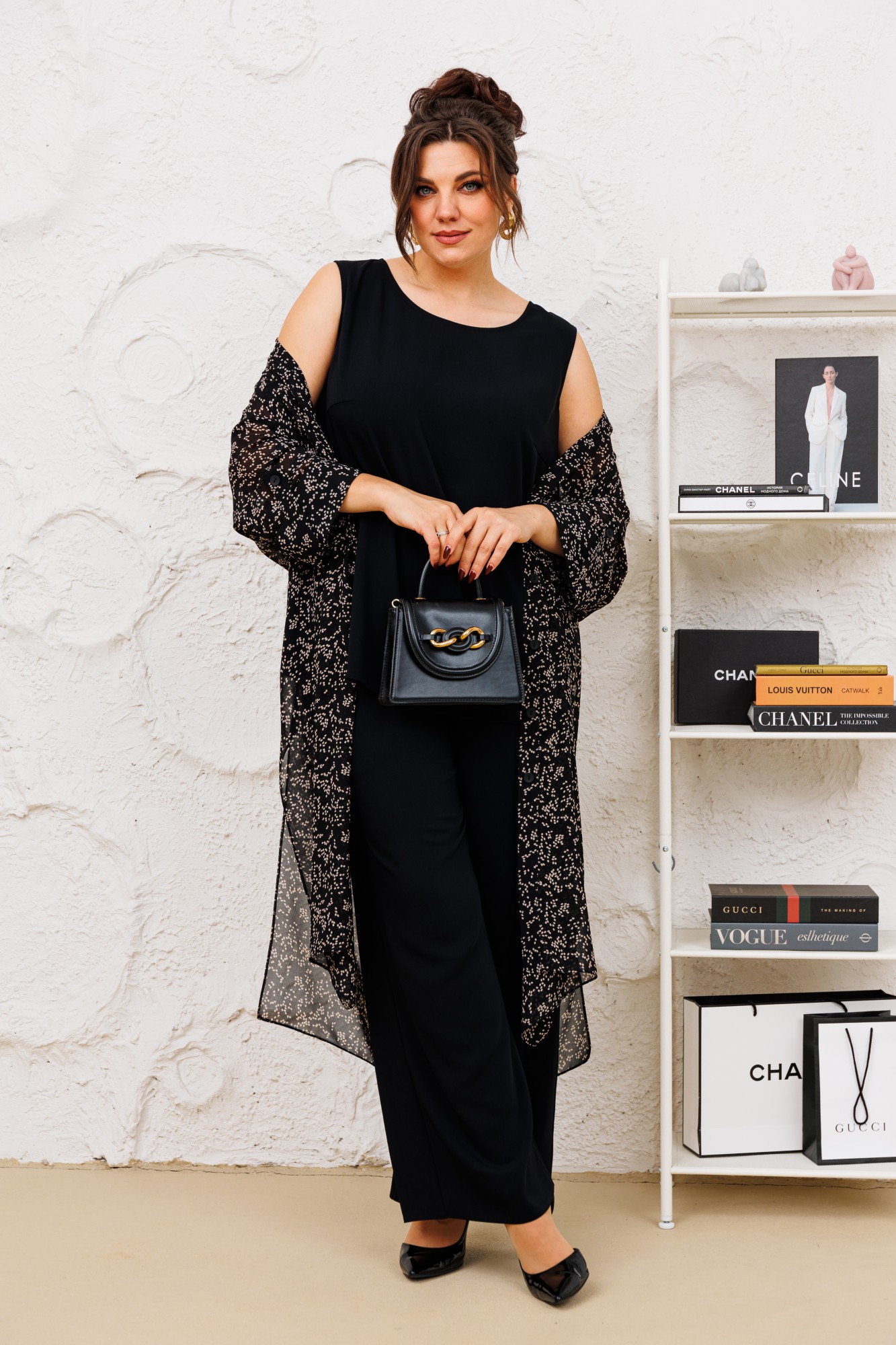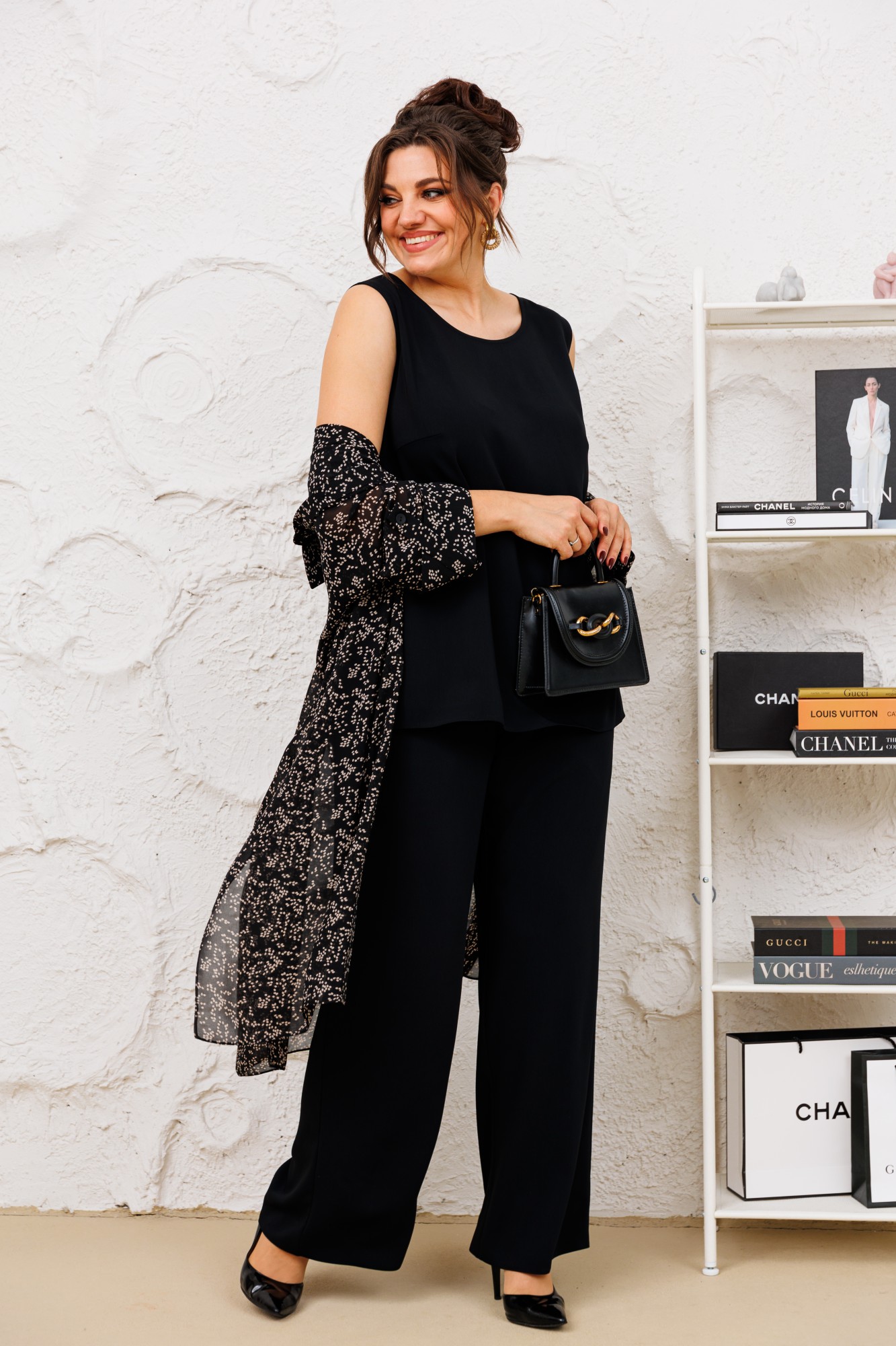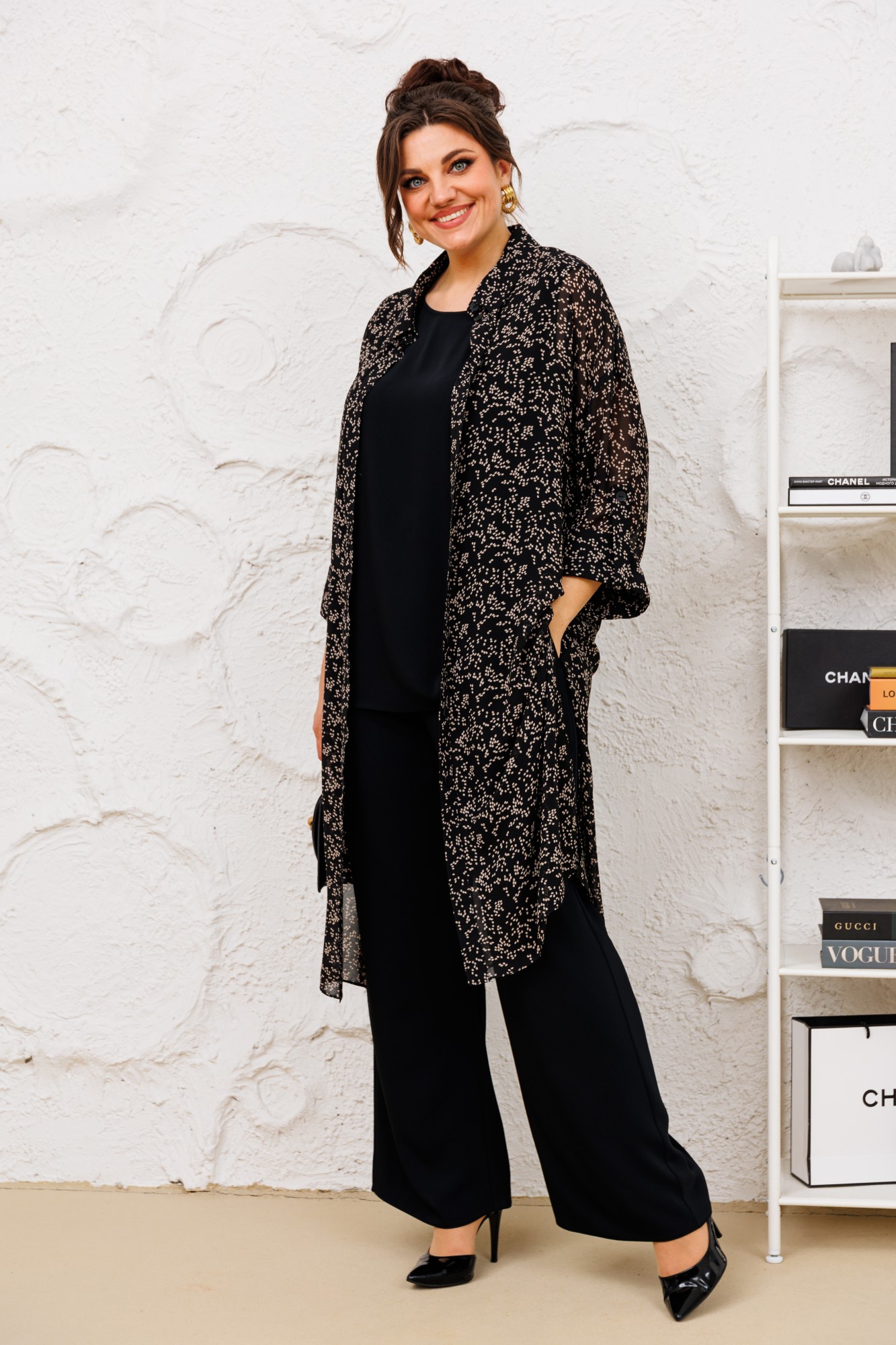 Комплект женский 3-х предметный кардиган, топ и брюки. Кардиган женский прямого силуэта, длиной ниже колена на 5 см. Перед с 2-мя притачными вертикальными планками. Спинка цельнокроеная. Горловина круглая с втачным воротником рубашечного типа с отрезной стойкой. Застёжка центральная на 9-тьпроьивных металлических кнопки. Боковые швы с разрезами. Кардиган со спущенным плечом. Рукав втачной, одно шовный, длиной 3/4 с притачной манжетой и хлястиком, поддерживающим манжету и фиксирующимся к рукаву на 1-ну пробивную кнопку. Кардиган без плечевых накладок. Топ женский прямого силуэта, длиной до линии бёдер. Перед с 2-мя нагрудными вытачками. Спинка цельнокроеная. Горловина круглая, обточная, без воротника. Проймы обточные. Брюки длинные прямые. Передние половинки с карманами в боковых швах. Задние половинки с таллиевыми вытачками. Брюки на притачном поясе, собранным на эластичную тесьму, закреплённую 2-мя отделочными строчками.