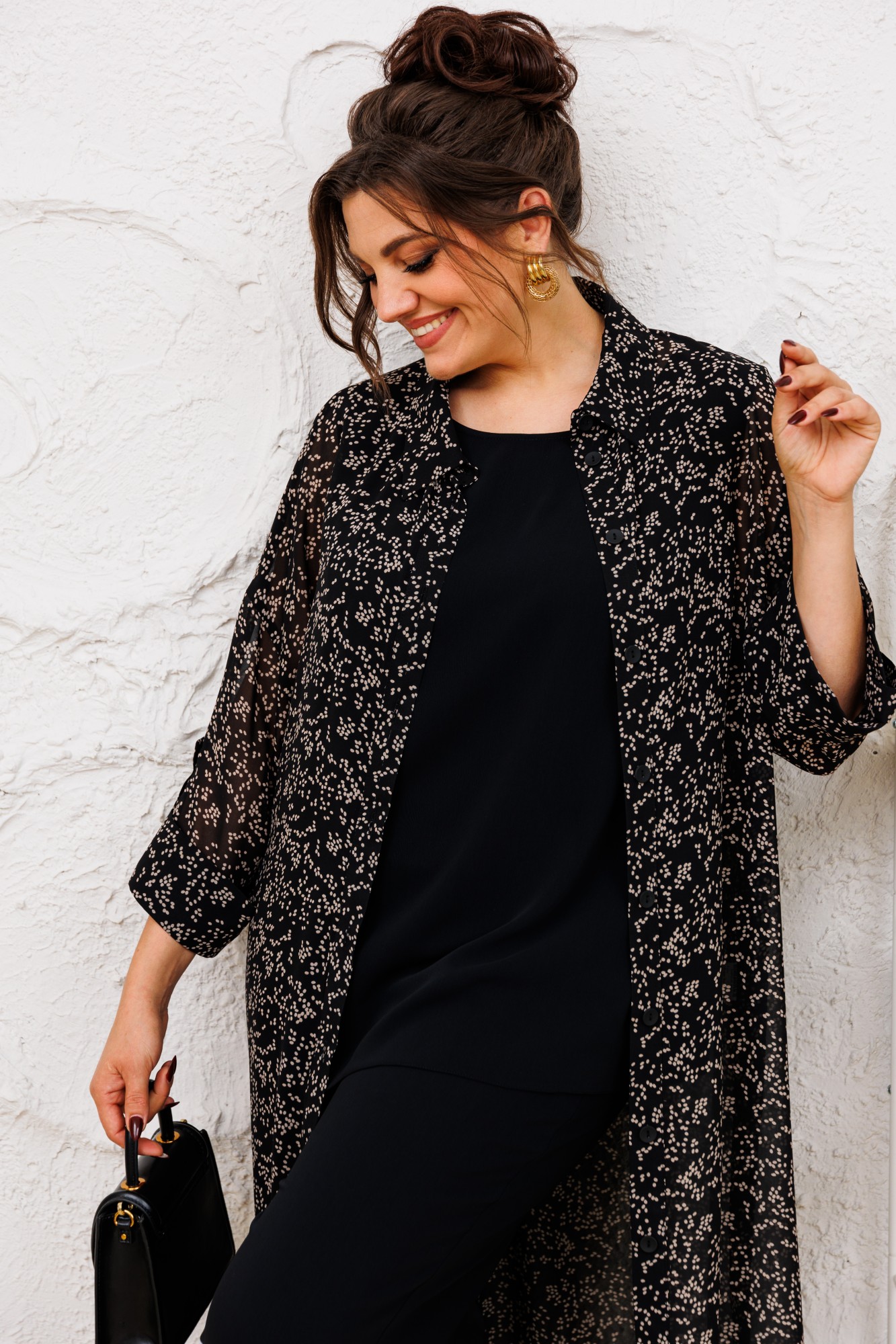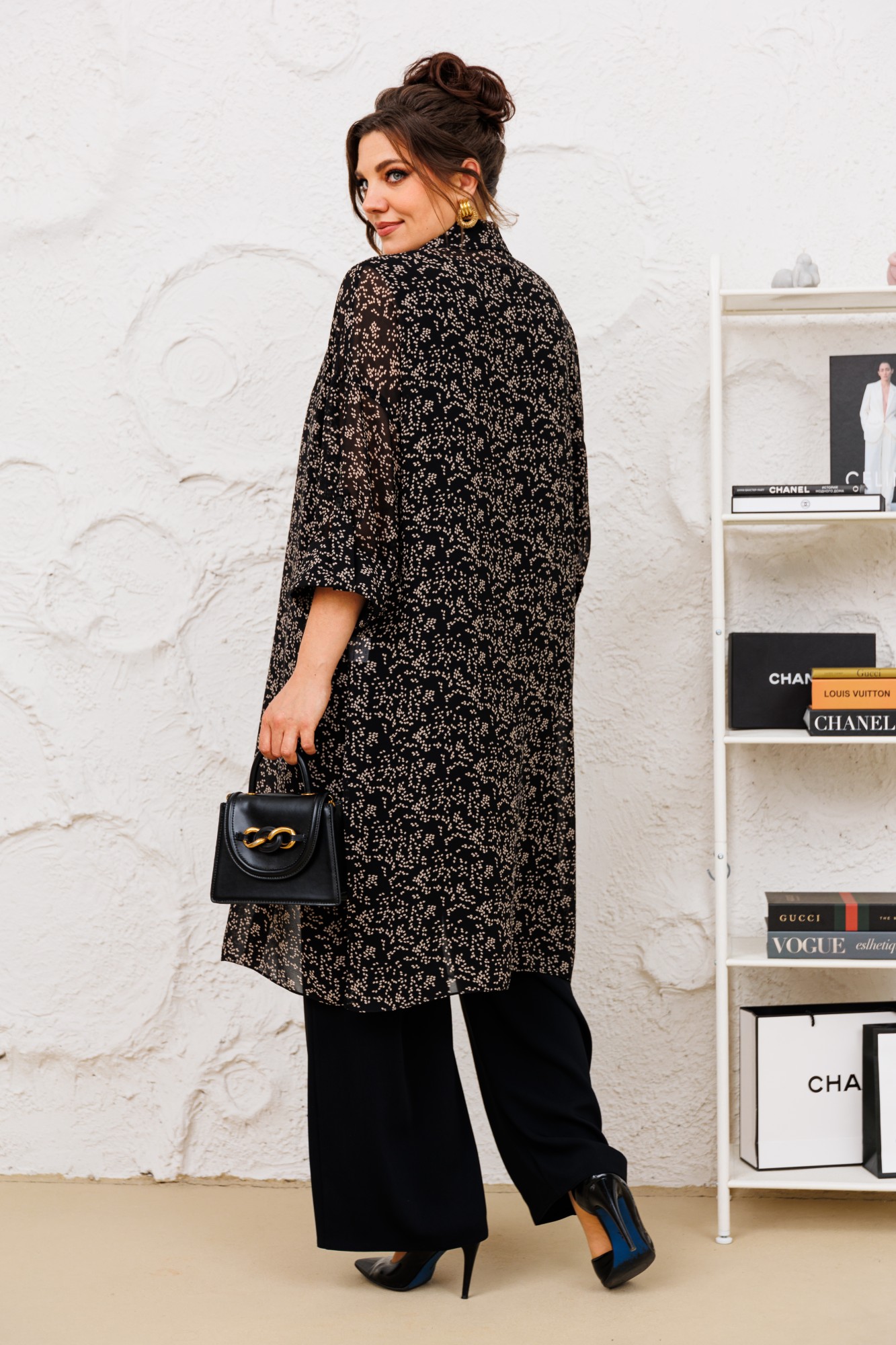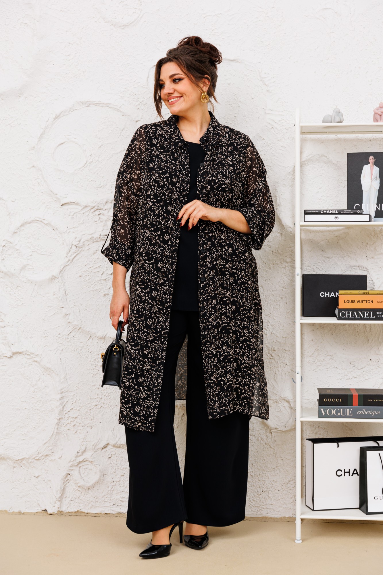 Длина спинки кардигана 106 см, длина рукава 28 см, длина рукава от горловины 55 см. Длина брюк по боковому срезу 102 см. Длина спинки топа 62 см.