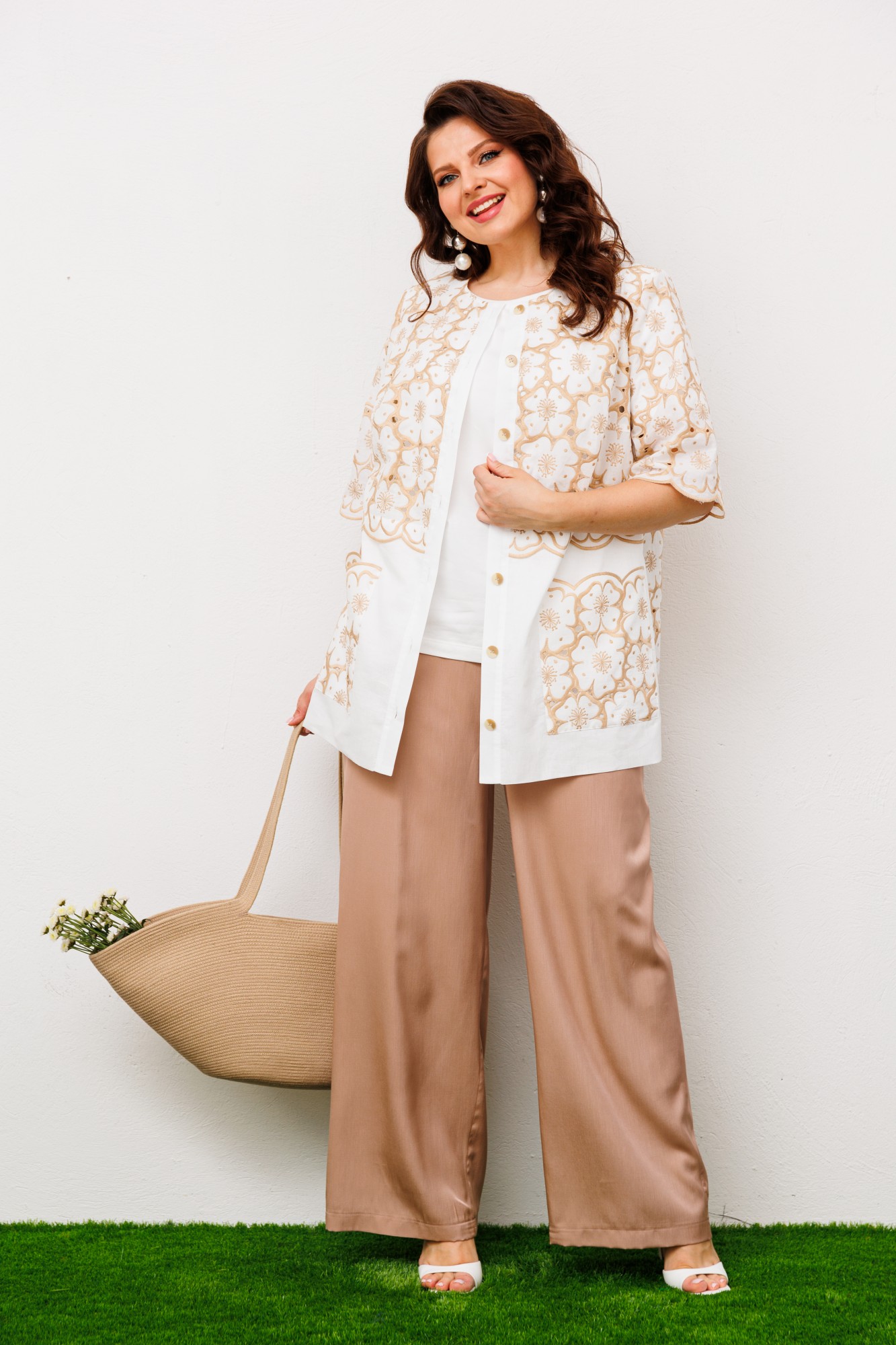 Блузка: 70% хлопок, 26% ПЭ, 4% спандекс. Кардиган: 100% хлопок. Брюки: 100% ПЭ.
