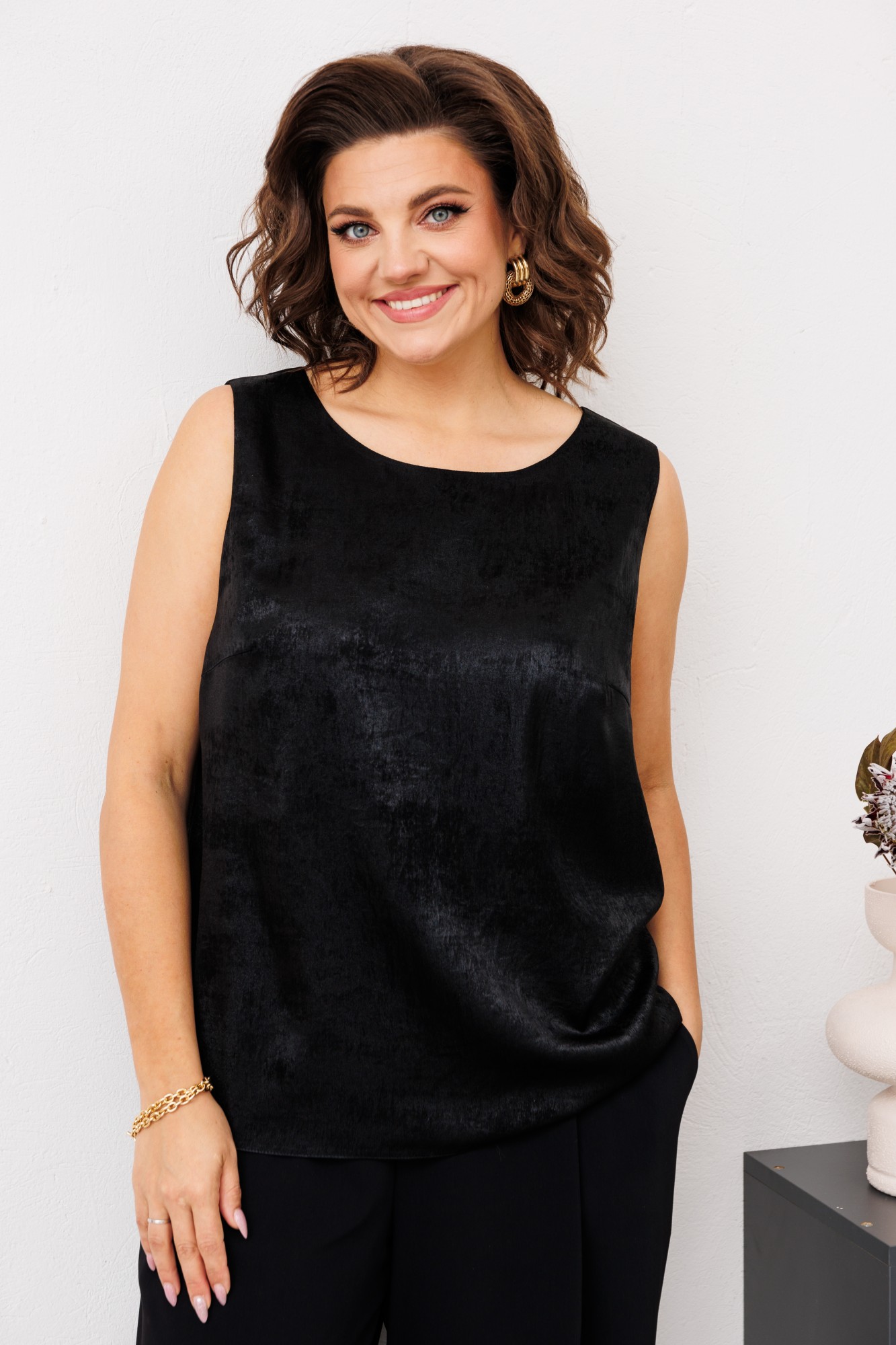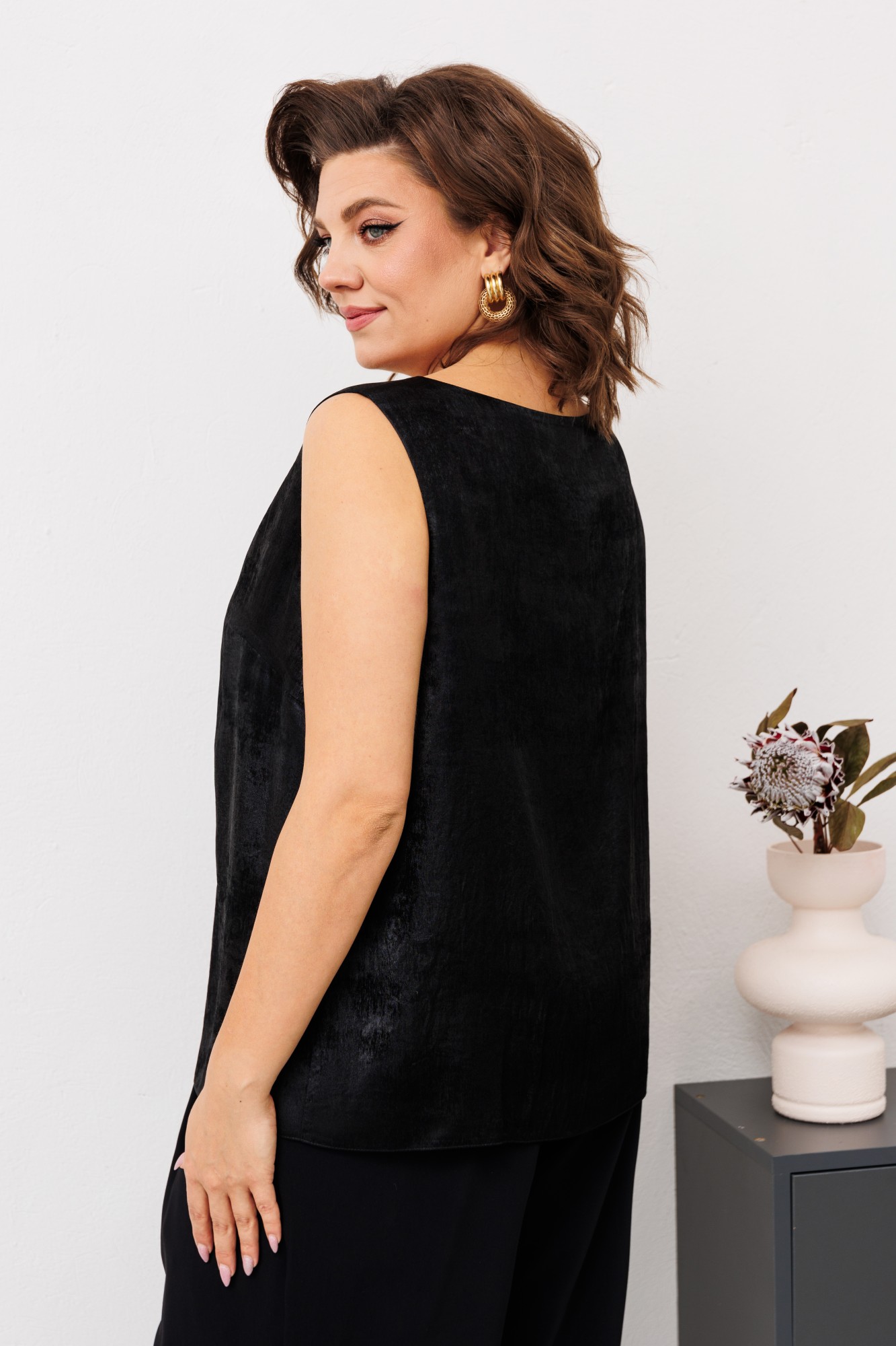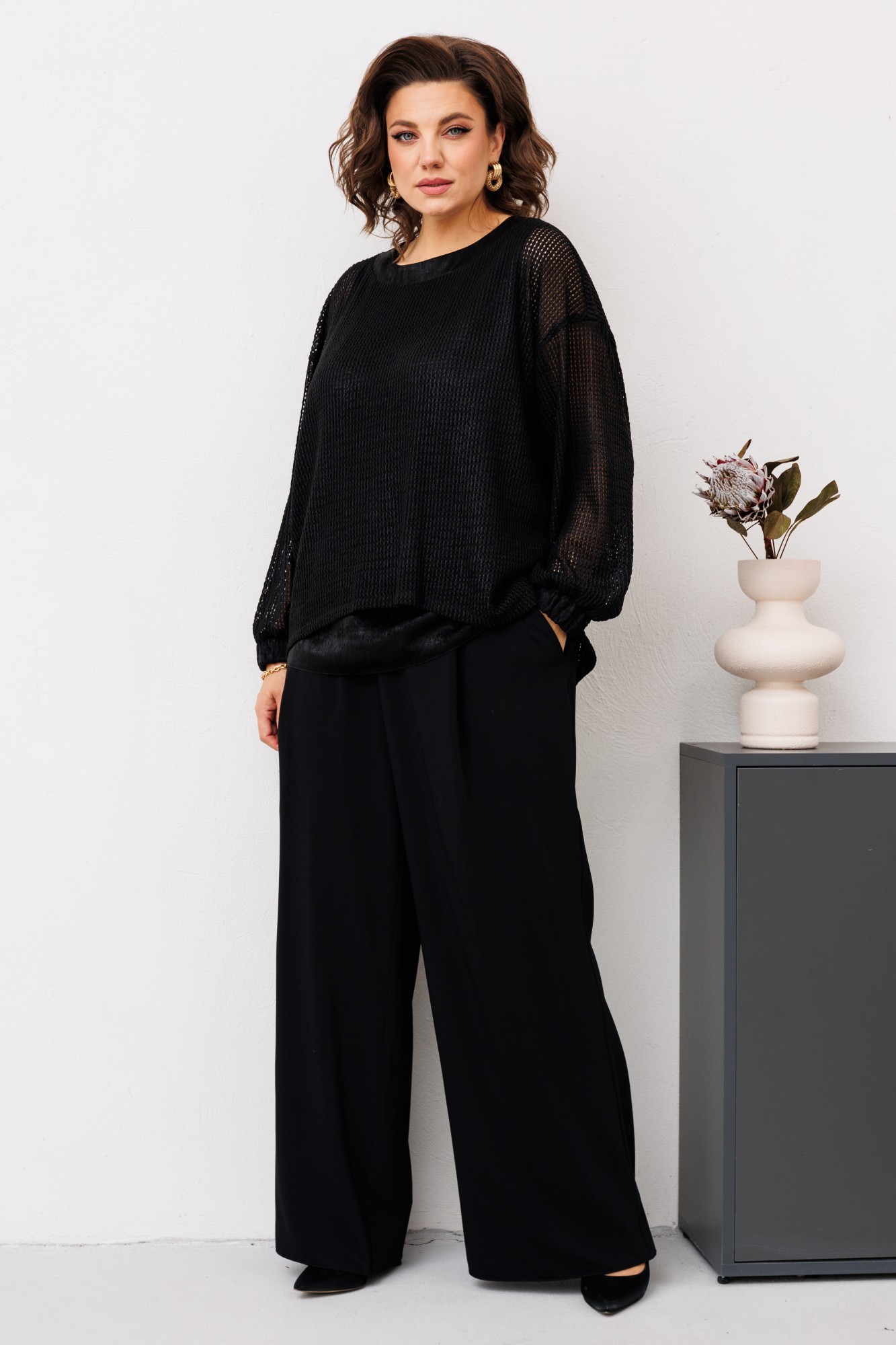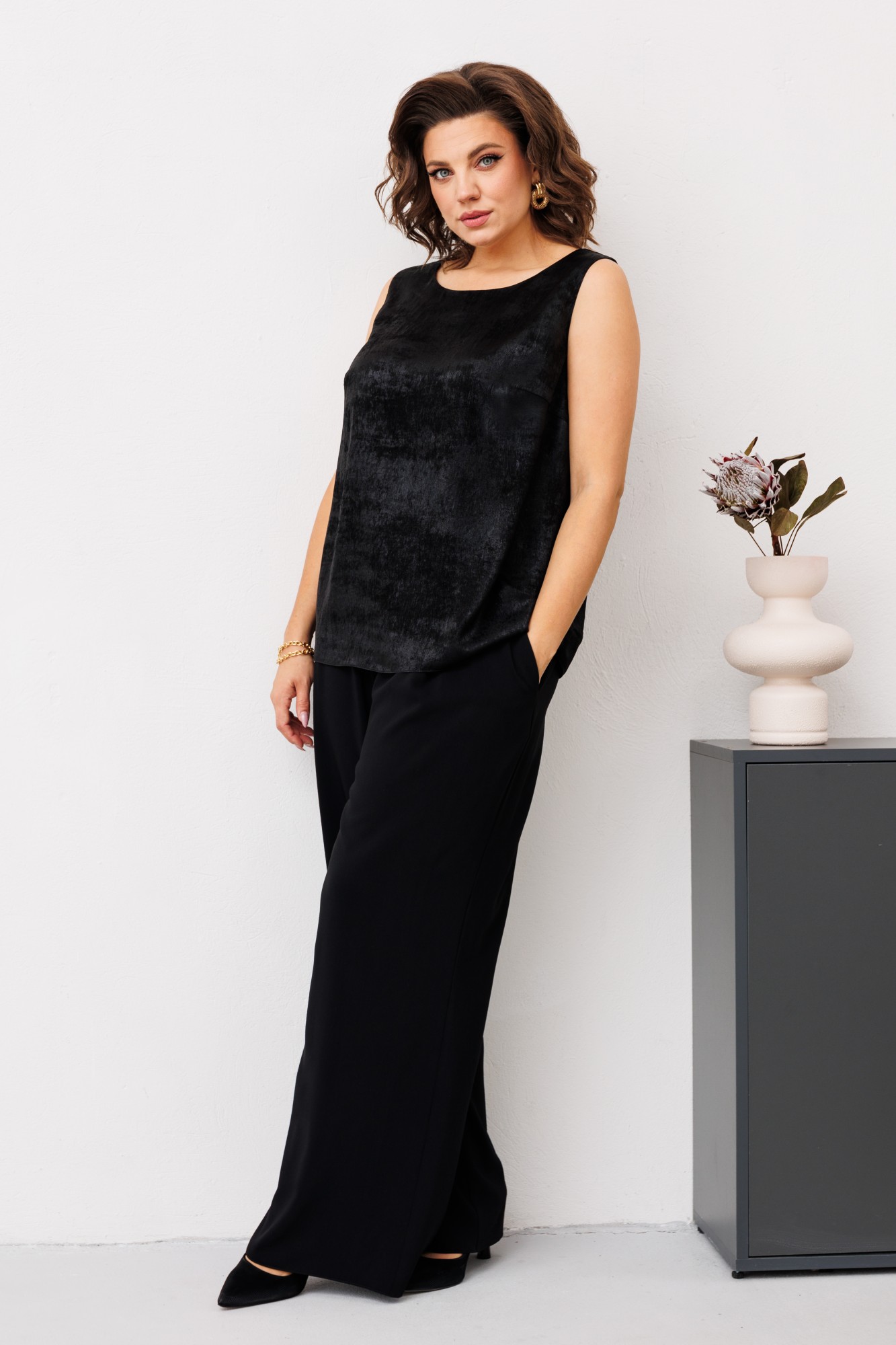 Комплект женский относится к торжественной одежде. Комплект женский 3-х предметный джемпер, топ и брюки. Джемпер прямого силуэта, с фигурным низом. Перед и спинка цельнокроеные, с притачной планкой из отделочной ткани по горловине. Джемпер со спущенным плечом. Рукав втачной, одно шовный, длинный, с притачной манжетой, собранной на эластичную тесьму. Джемпер без плечевых накладок. Топ женский прямого силуэта, длиной до линии бёдер. Перед с 2-мя нагрудными вытачками. Спинка цельнокроеная. Горловина круглая, без воротника. Проймы обтачные. Топ на подкладке. Брюки женские прямые широкие, длинные. Передние половинки с односторонними складками и карманами в боковых швах. Задние половинки с таллиевыми вытачками. Брюки с притачным поясом, собранным на эластичную тесьму, закреплённую 2-мя отделочными строчками.