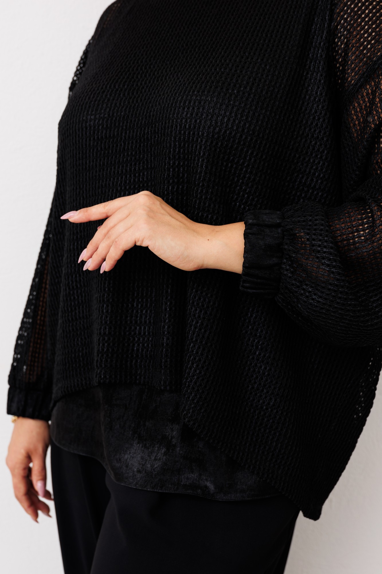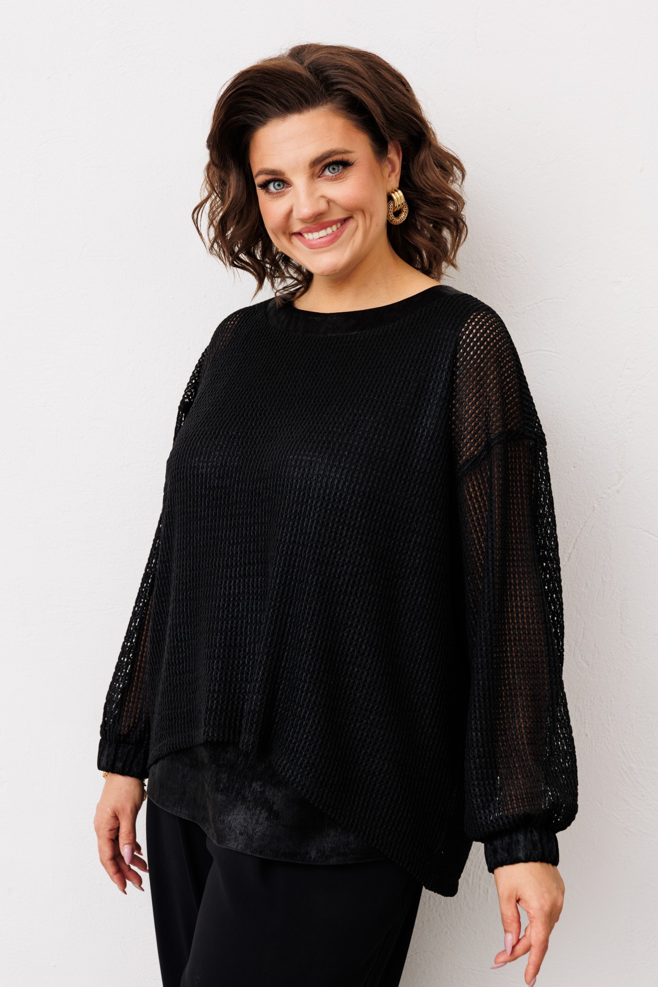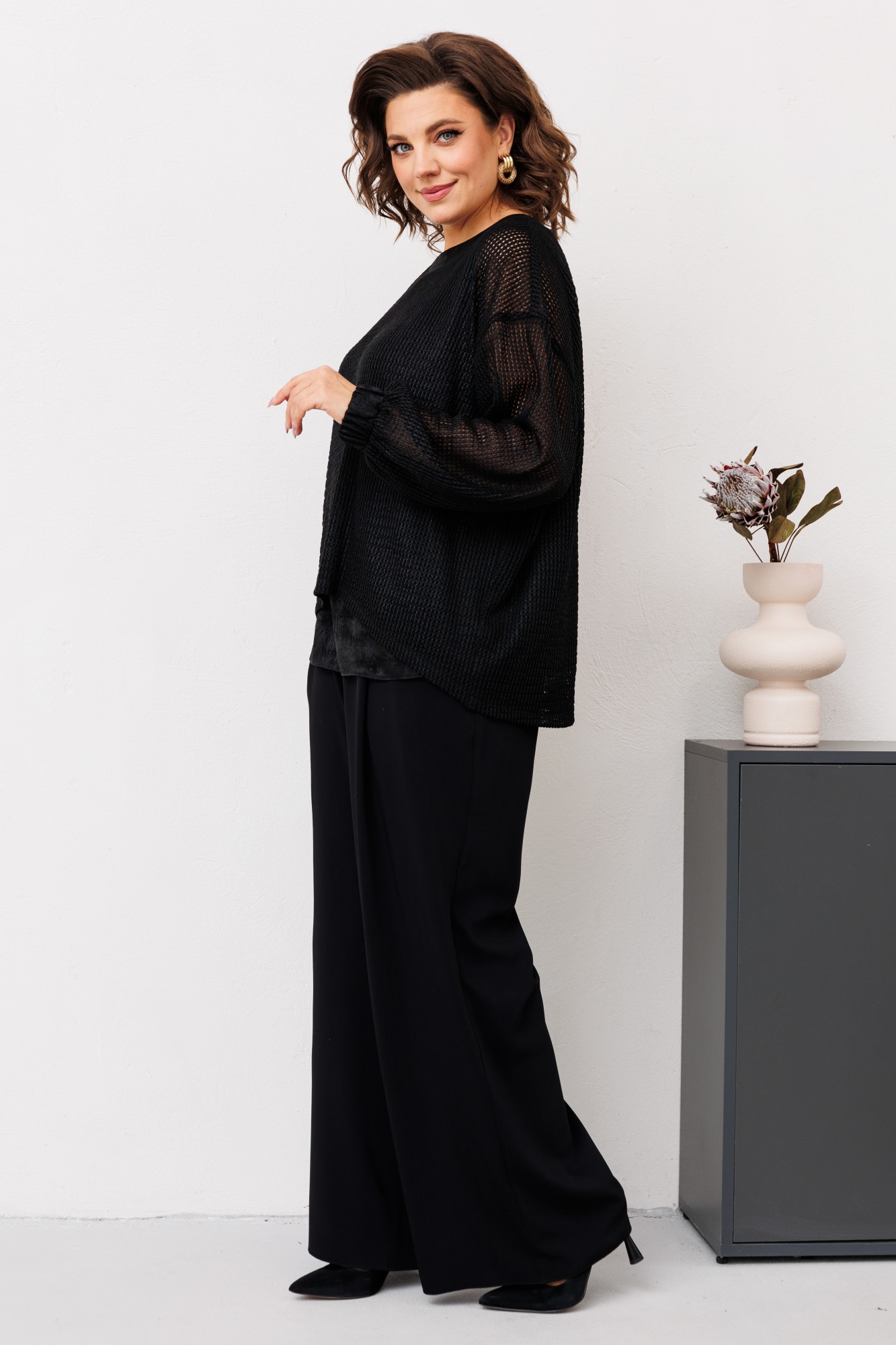 Джемпер: 85% ПЭ, 10% хлопок, 5% спандекс. Топ: 100% ПЭ. Брюки: 85% ПЭ, 15% вискоза.