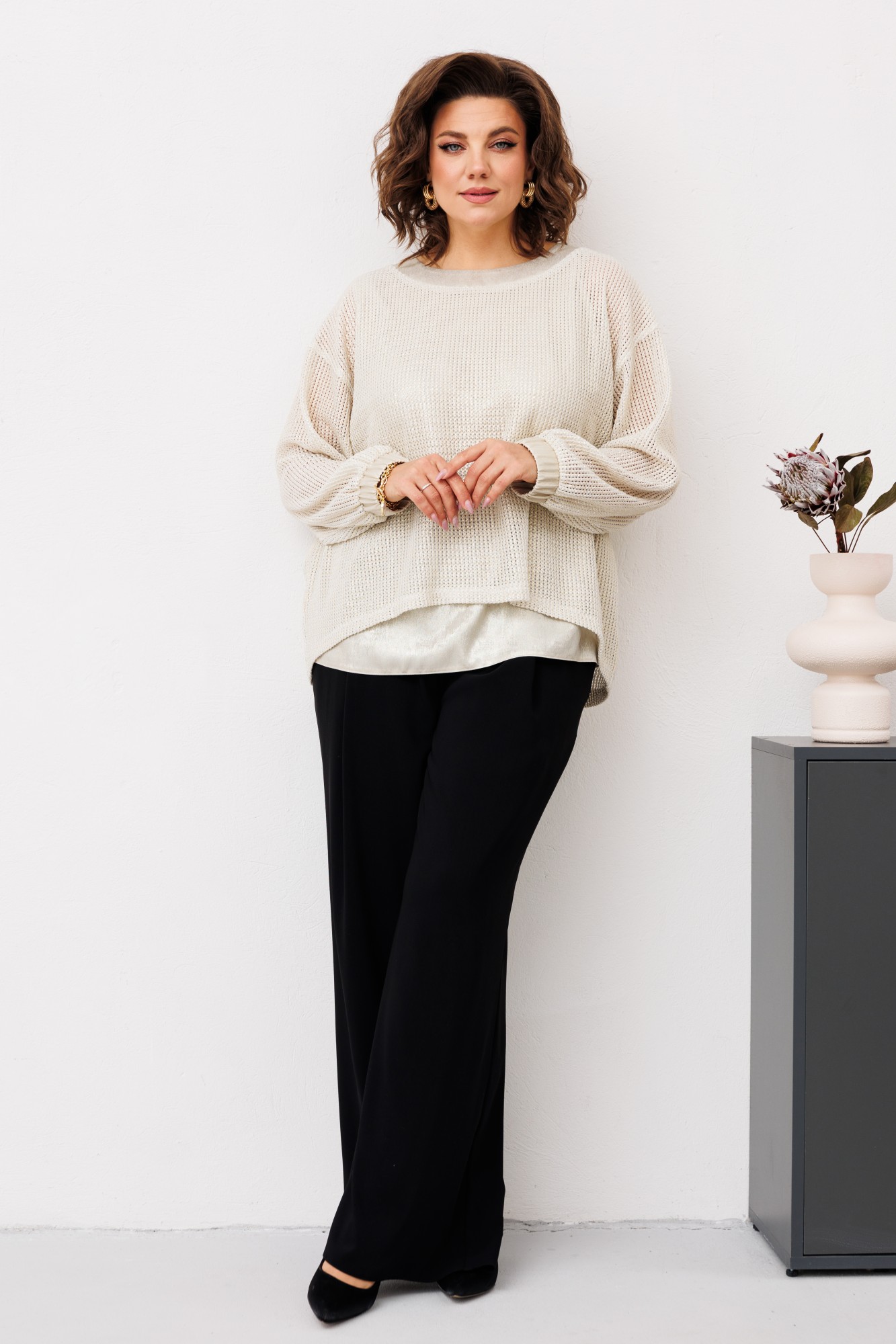 Джемпер: 85% ПЭ, 10% хлопок, 5% спандекс. Топ: 100% ПЭ. Брюки: 85% ПЭ, 15% вискоза.