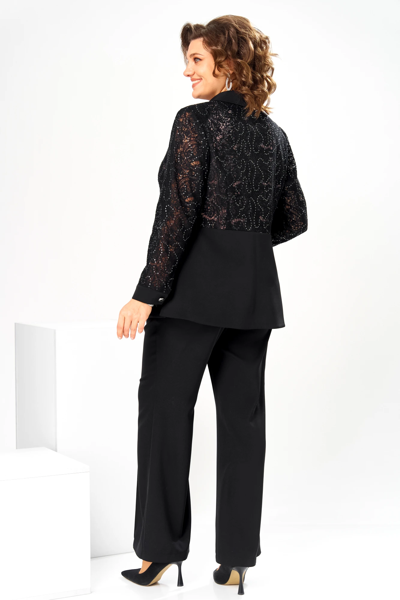 Комплект женский, относится к торжественной нарядной одежде. Комплект женский, 3-х предметный, жакет, топ и брюки. Жакет полу прилегающего силуэта, длиной ниже линии бёдер н6а 9 см. Жакет отрезной по линии талии. Верхняя часть переда из отделочной ткани с 2-мя нагрудными вытачками, нижняя двойная с накладными фигурными карманами с фигурными клапанами, с застёжкой на обмётанную петлю и пришивную пуговицу. Верхняя часть спинки из отделочной ткани, с 2-мя таллиевыми вытачками, нижняя двойная, обтачная. Горловина с v-образным вырезом с втачным воротником пиджачного типа с отложным лацканом. Застёжка центральная ботовая на 3-и обмётанные петли и пришивные пуговицы. Рукав из отделочной ткани, длинный, 2-х шовный, втачной с притачной манжетой с застёжкой на 1-ну обмётанную петлю и 1-ну пришивную пуговицу. Жакет с плечевыми накладками. Топ женский прямого силуэта, длиной до линии бёдер. Перед с 2-мя нагрудными вытачками. Спинка без конструктивных особенностей, цельнокроеная. Боковые швы с разрезами. Горловина круглая, без воротника. Горловина проймы обработаны косой бейкой. Брюки женские прямые, длинные. Передние половинки с карманами в боковых швах , по центру с декоративными защипами шириной 0,2 см. Задние половинки с таллиевыми вытачками. Застёжка центральная на тесьму-молнию. Брюки с притачным поясом с застёжкой на 1-ну обмётанную петлю и 1-ну пришивную пуговицу, по бокам собранным на эластичную тесьму, закреплённую 2-мя отделочными строчками.