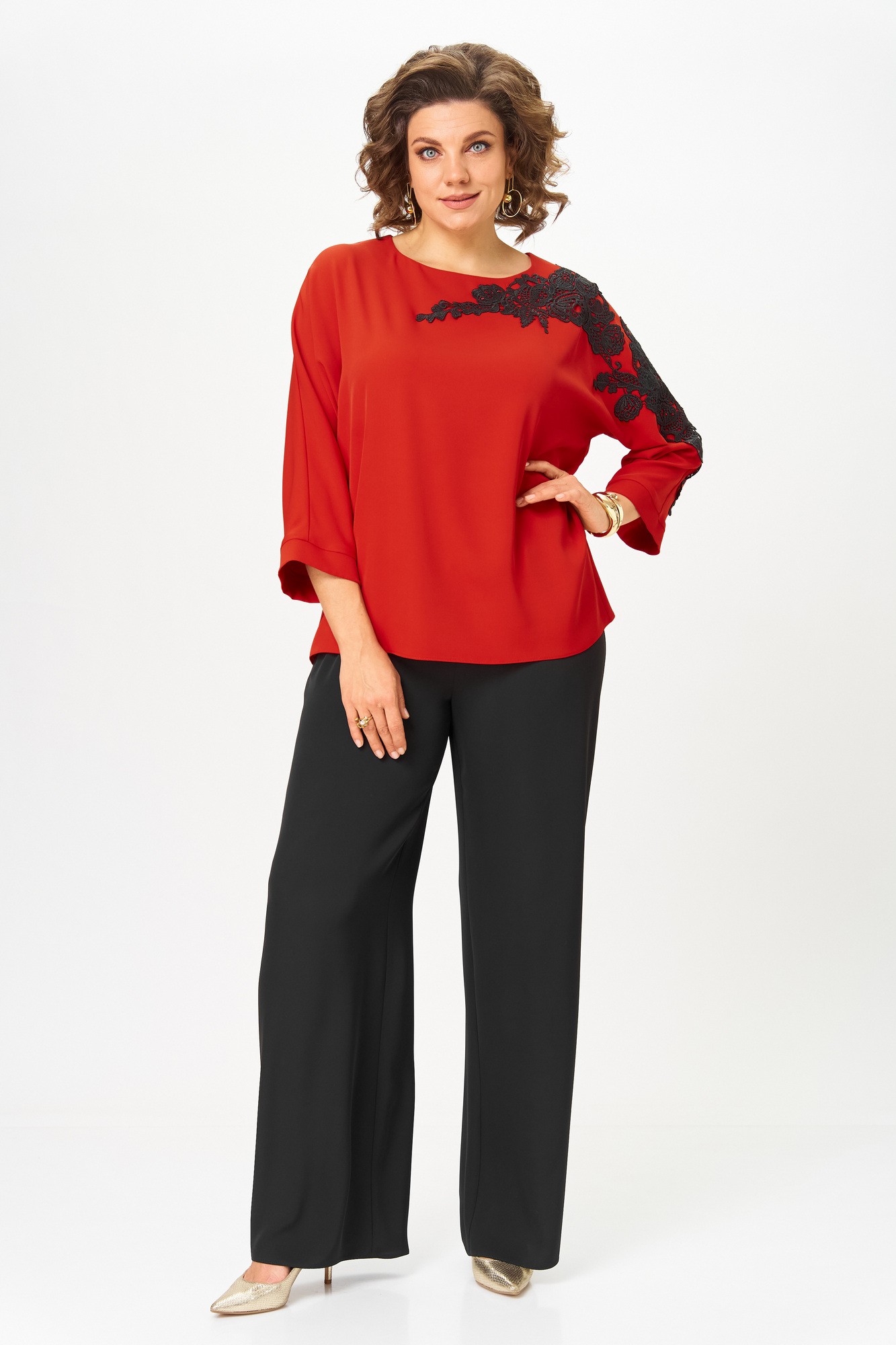 Блузка женская из текстильной ткани с цельнокроеным рукавом. Прямого силуэта. По переду блузки настрочена аппликация. По спинке расположен средний шов. Рукав 3/4, низ рукава с манжетой. Вырез горловины круглый, обработан обтачкой. Блузка застегивается на петлю-пуговицу.