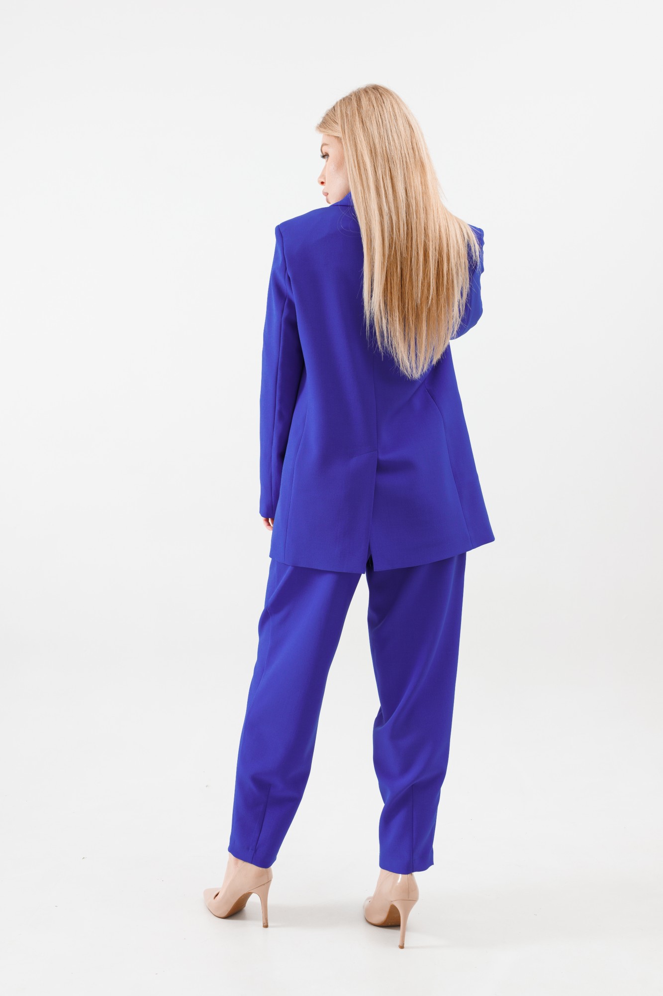 Жакет для стильных женщин, полуприлегающего силуэта из костюмной ткани. Перед с центральной застежкой на одну петлю-пуговицу. По переду боковые функциональные карманы. С левой стороны карман – «обманка». Спинка со средним швом, переходящим в шлицу. Рукава втачные двухшовные. Воротник цельнокроенный, шалевый. Жакет на подкладке. Модные женские брюки – «бананы» свободного кроя, зауженные к низу из костюмной ткани. На переднем полотнище вертикальная складка. На заднем – вытачки. В боковых швах расположены карманы. Брюки с застежкой спереди на молнию и одну петлю-пуговицу.