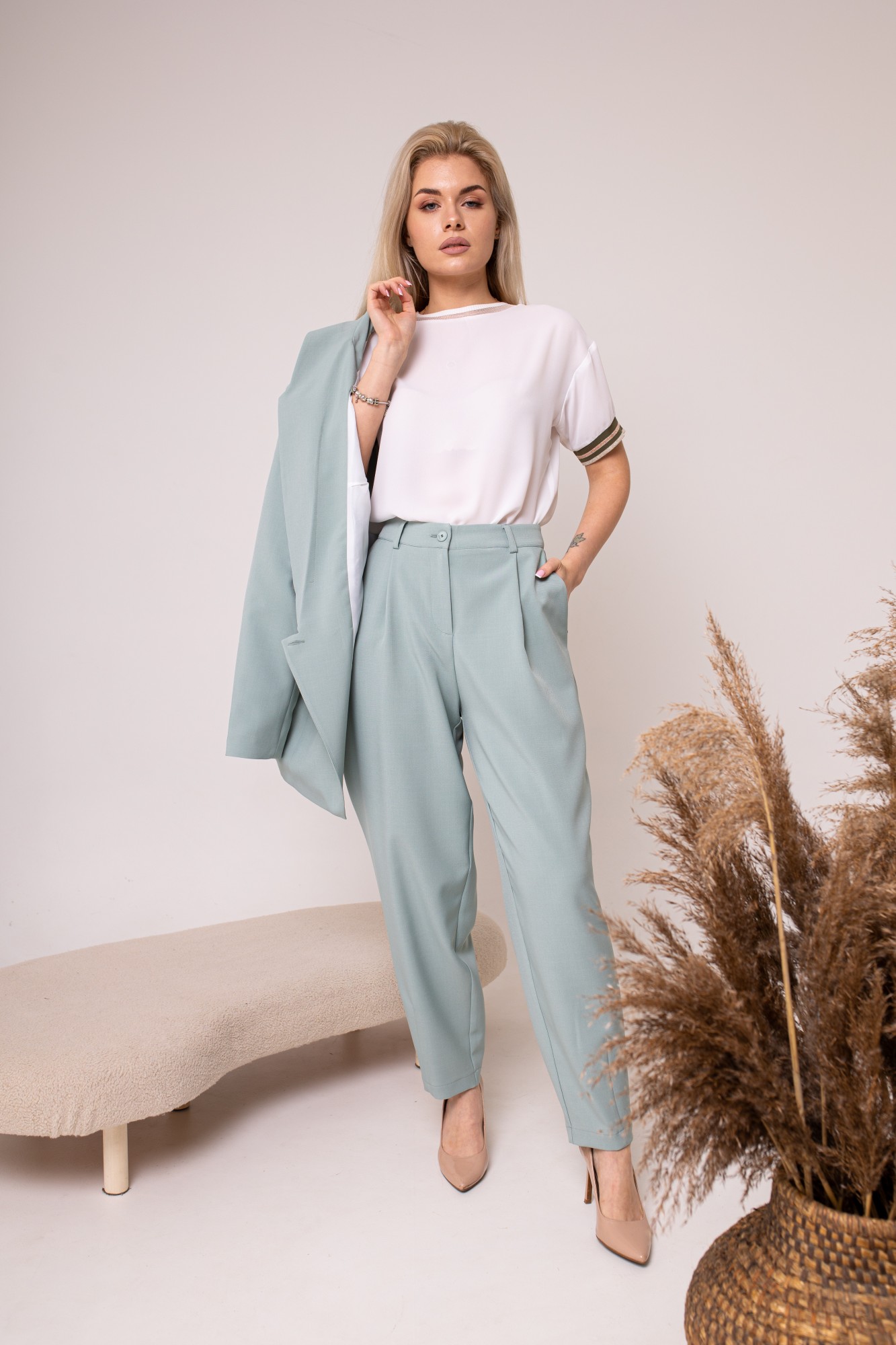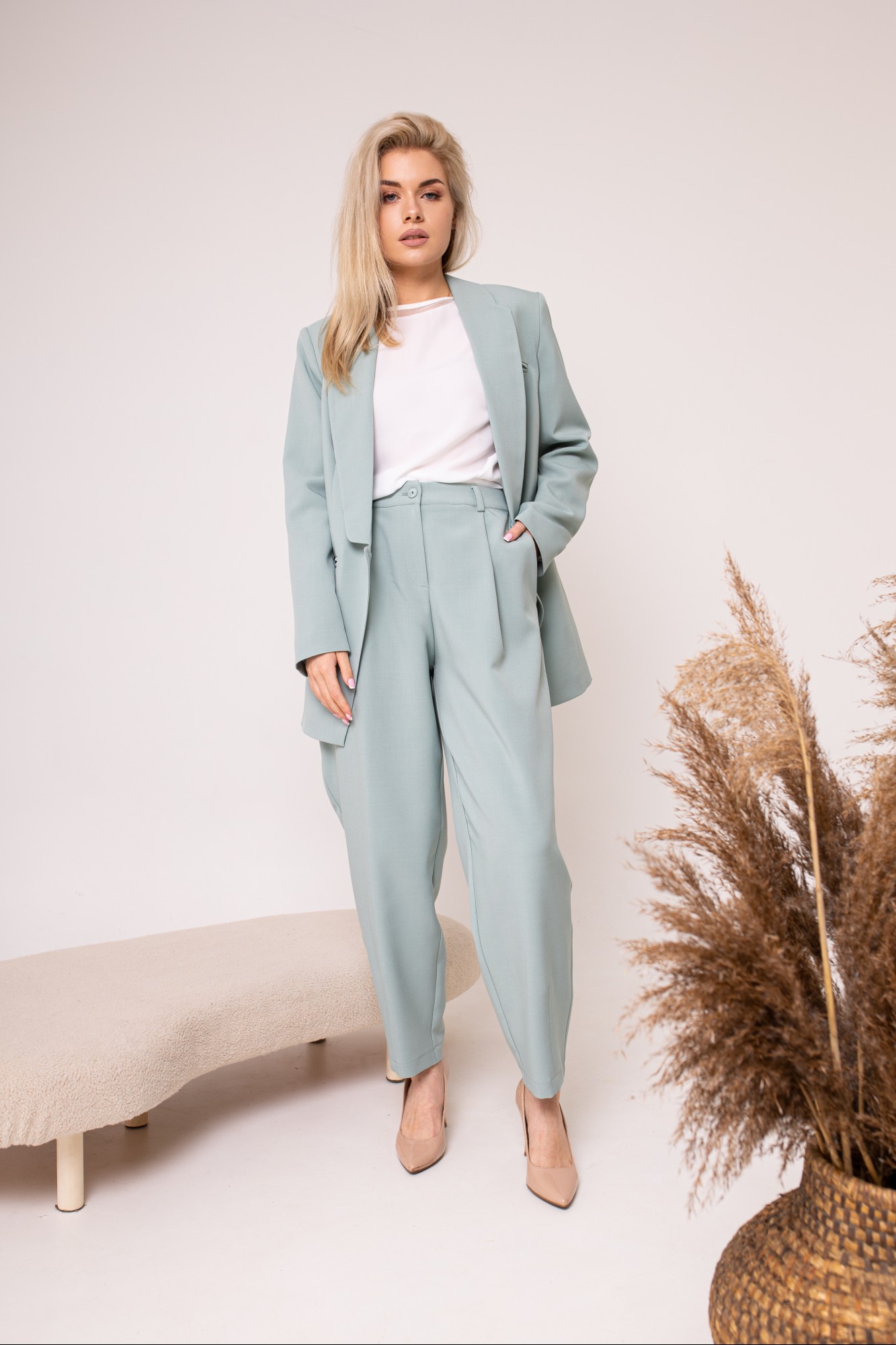Жакет для стильных женщин, полуприлегающего силуэта из костюмной ткани. . Перед с центральной застежкой на одну петлю-пуговицу. По переду боковые функциональные карманы. С левой стороны карман – «обманка». Спинка со средним швом, переходящим в шлицу. Рукава втачные двухшовные. Воротник цельнокроенный, шалевый. Жакет на подкладке. Модные женские брюки – «бананы» свободного кроя, зауженные к низу из костюмной ткани. . На переднем полотнище вертикальная складка. На заднем – вытачки. В боковых швах расположены карманы. Брюки с застежкой спереди на молнию и одну петлю-пуговицу.