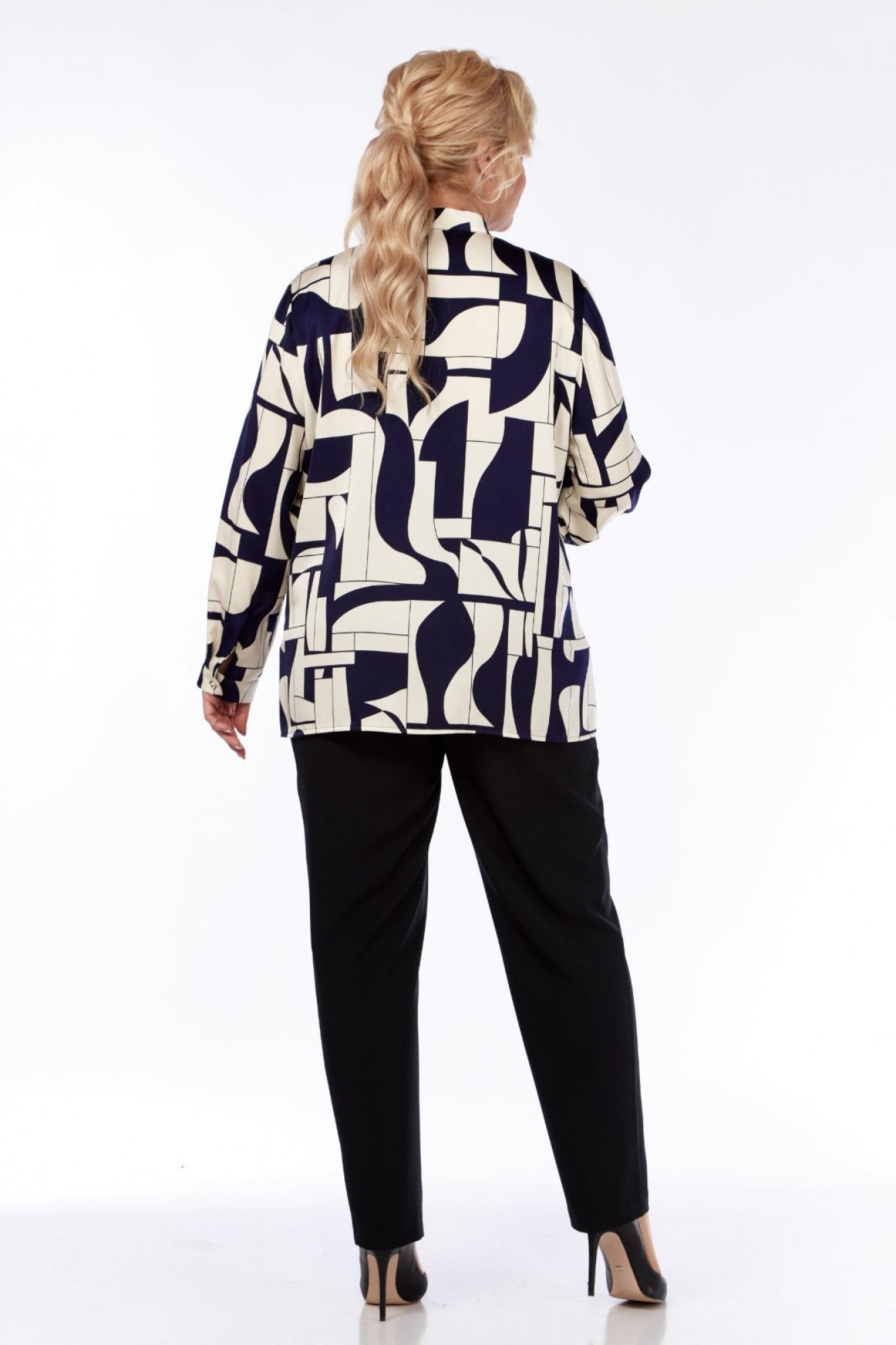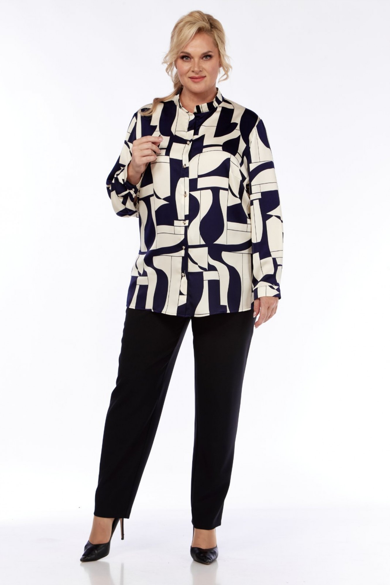 Силуэт полуприлегающий. Рукава втачные, одношовные. Низ рукава со складками и на манжете с застёжкой на пуговицу Воротник - стойка. Перед с нагрудными вытачками и со сквозной застёжкой на пуговицы. Внизу боковых швов выполнены разрезы. Блузка выполнена из лёгкой блузочной ткани. Брюки прилегающие, спереди на молнии. Посадка стандартная. Пояс с резинкой по бокам.