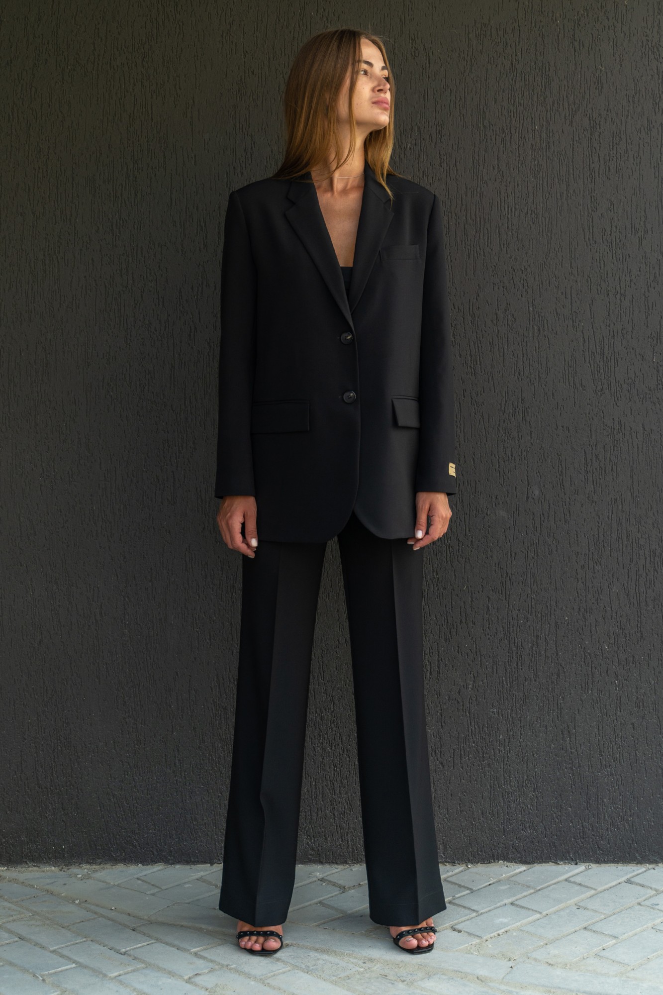Самый актуальный, безупречный брючный костюм. Идеальный крой и посадка, незаменимая базовая вещь. Уверенные линии, лаконичный крой, этот костюм станет идеальным дополнением множества вечерних, деловых и повседневных образов. Жакет свободного силуэта, с цельнокроеными бочками, на подкладке. Воротник пиджачного типа с отложным лацканом, на левой полочке листочка. Спереди прорезные карманы в рамку с клапаном. Спинка со средним швом и высокой отлетной шлицей (40 см.). Рукав втачной, двухшовный, со шлицей и пуговицами. На левом рукаве настрочена декоративная бирка. Стильные женские брюки прямого свободного силуэта. Пояс на резинке, по переду боковые наклонные карманы. Благородство этого костюма просто зашкаливает. Абсолютно современный look, делает образ острым и элегантным, олицетворяя женщину 21 века.