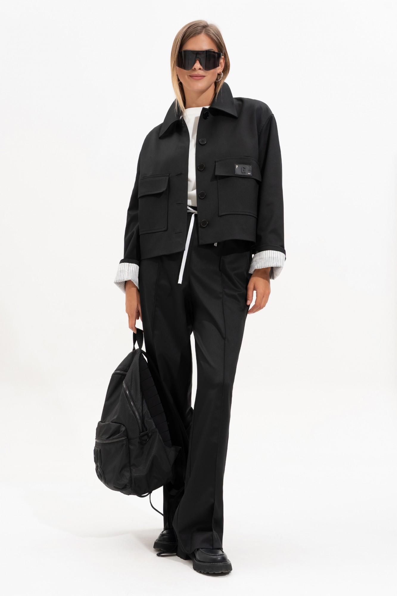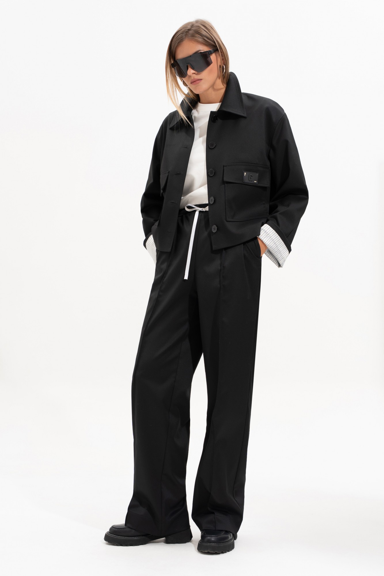 Брюки прямого свободного силуэта, впереди с застроченными кантами. На задней части брюк карман-листочка с пуговицей. Пояс на резинке, с контрастным шнурком, по переду боковые наклонные карманы.