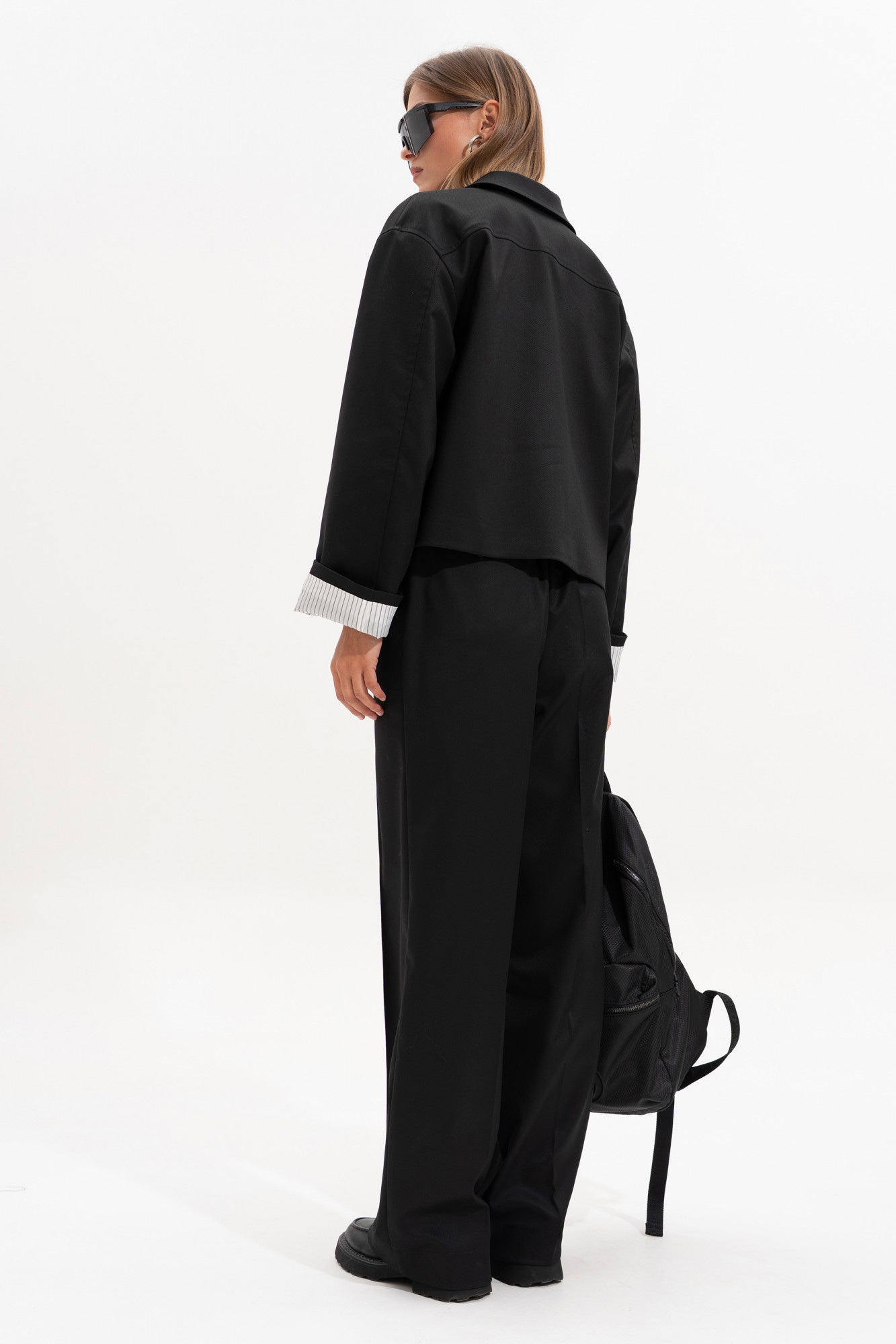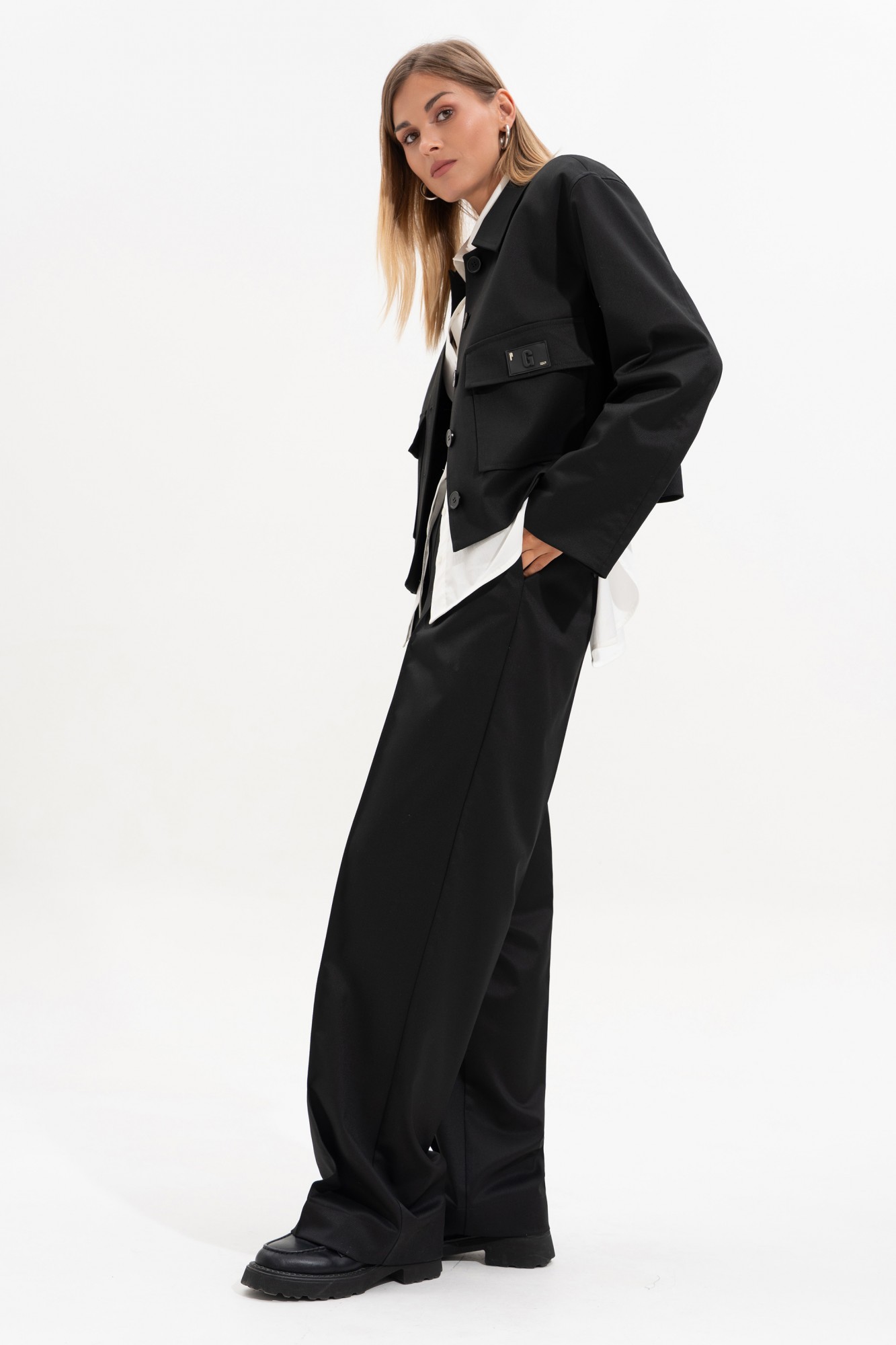 Стильный брючный костюм. Жакет прямого кроя, на поливискозной подкладке, подкладка рукава контрастного цвета - молочная в полоску. Линия плеча слегка спущена, рукав прямой, двухшовный. Воротник стояче-отложной с отрезной стойкой, по переду функциональные накладные карманы с клапанами (на левом клапане настрочена декоративная бирка). Спинка с отрезной кокеткой.
