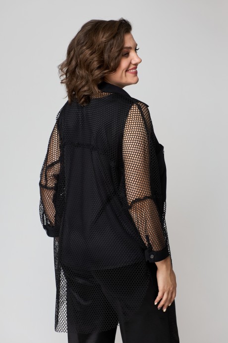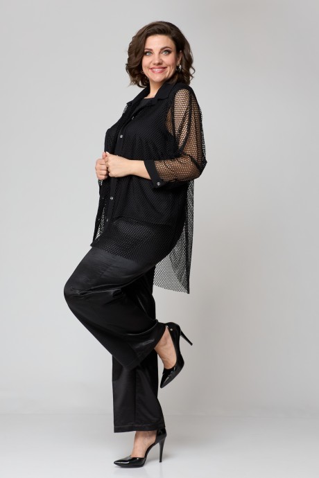 Брюки с поясом, по спинке резинка, застёжка потайная молния и петля-пуговица. Топ с полукруглым вырезом и нагрудными вытачками. Рубашка удлиненная, свободного кроя. Застежка-планка с прорезными петлями на пуговицах. Спинка свободного кроя без талиевых вытачек. По центру спинки кокетка. Воротник рубашечного типа. Низ изделия с фигурными вырезами по боковому шву. Линия плеча спущенная, рукав притачной, по низу рукава манжет с застежкой на пуговицу. Есть накладной карман. Рубашку, топ и брюки можно носить отдельно с любыми другими изделиями