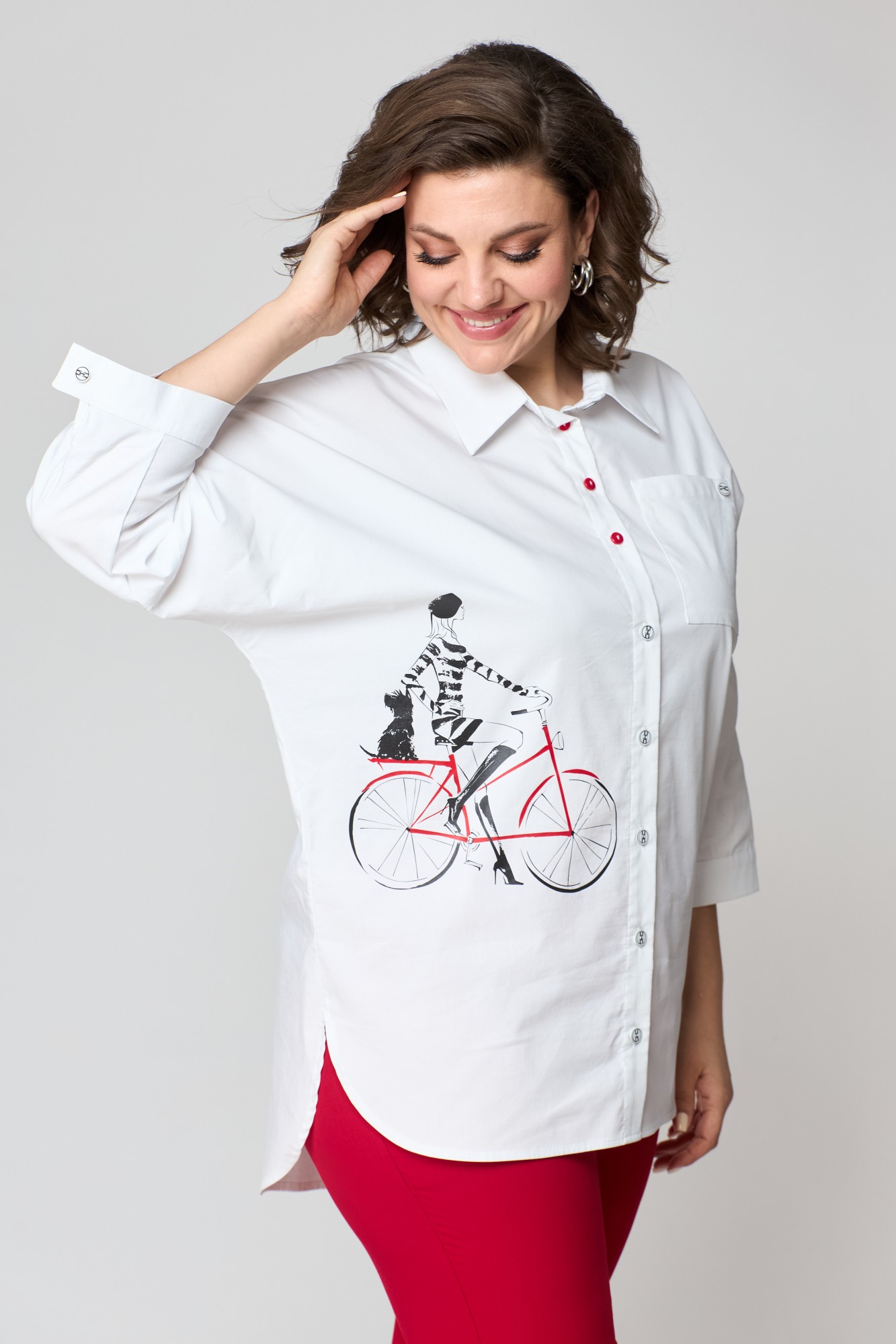 Комплект женский состоит из блузы и брюк. Блузка удлиненная, свободного кроя. Передняя часть блузы (полочка) свободного кроя без талиевых вытачек с накладным карманом. Застежка-планка с прорезными петлями на пуговицах. Спинка свободного кроя без талиевых вытачек. По центру спинки кокетка. Воротник рубашечного типа на стойке. Низ изделия с фигурными вырезами по боковому шву. Украшением изделия служит печать. Линия плеча спущенная, рукав притачной по низу рукава манжет с застежкой на пуговицу. Подойдет для женщин разной возрастной категории и разного телосложения. Можно носить как вместе, так и отдельно. Брюки заужены к низу, на широком поясе, по переду карманы, застёжка - молния и пуговицы. Длина брюк 93 см + пояс 5 см. Длина блузы по центру спинки в 80 см, длина рукава от воротника 60 см. Деликатная стирка при 30 градусах!