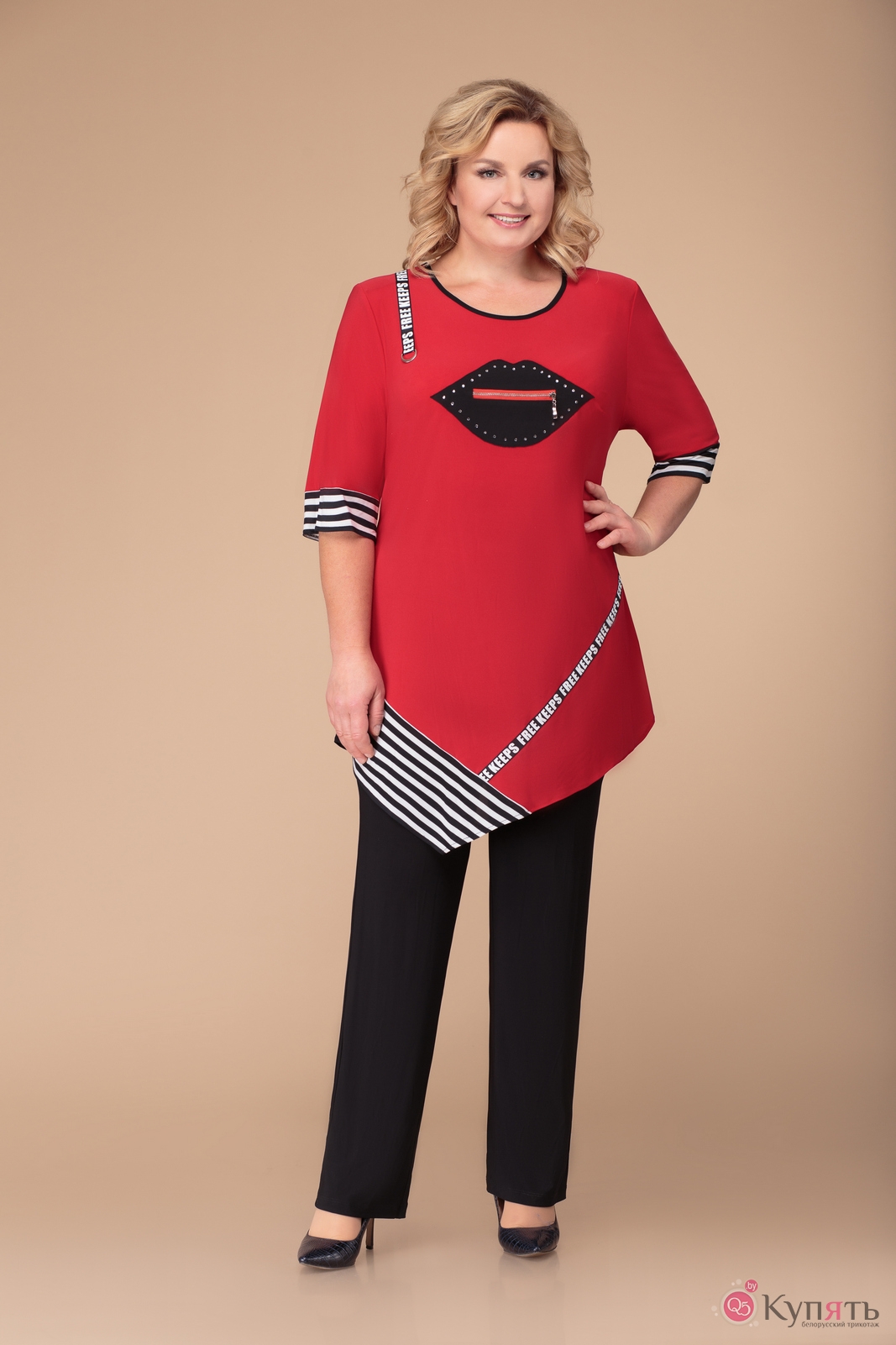 Костюм женский, состоящий из туники и брюк. Туника свободного силуэта с асимметричной линией низа. Рукав втачной длиной до линии локтя. На полочке выполнена аппликация. С правой стороны в области плеча и с левой стороны по низу туники настрочена отделочная тесьма. Манжета рукава и правая нижняя деталь туники выполнены из отделочного материала. Брюки с высокой посадкой. Пояс на резинке.