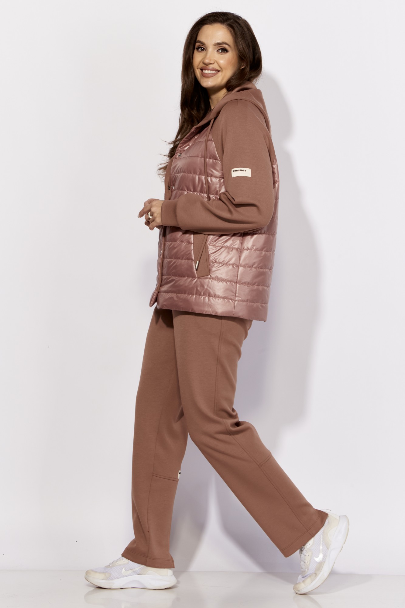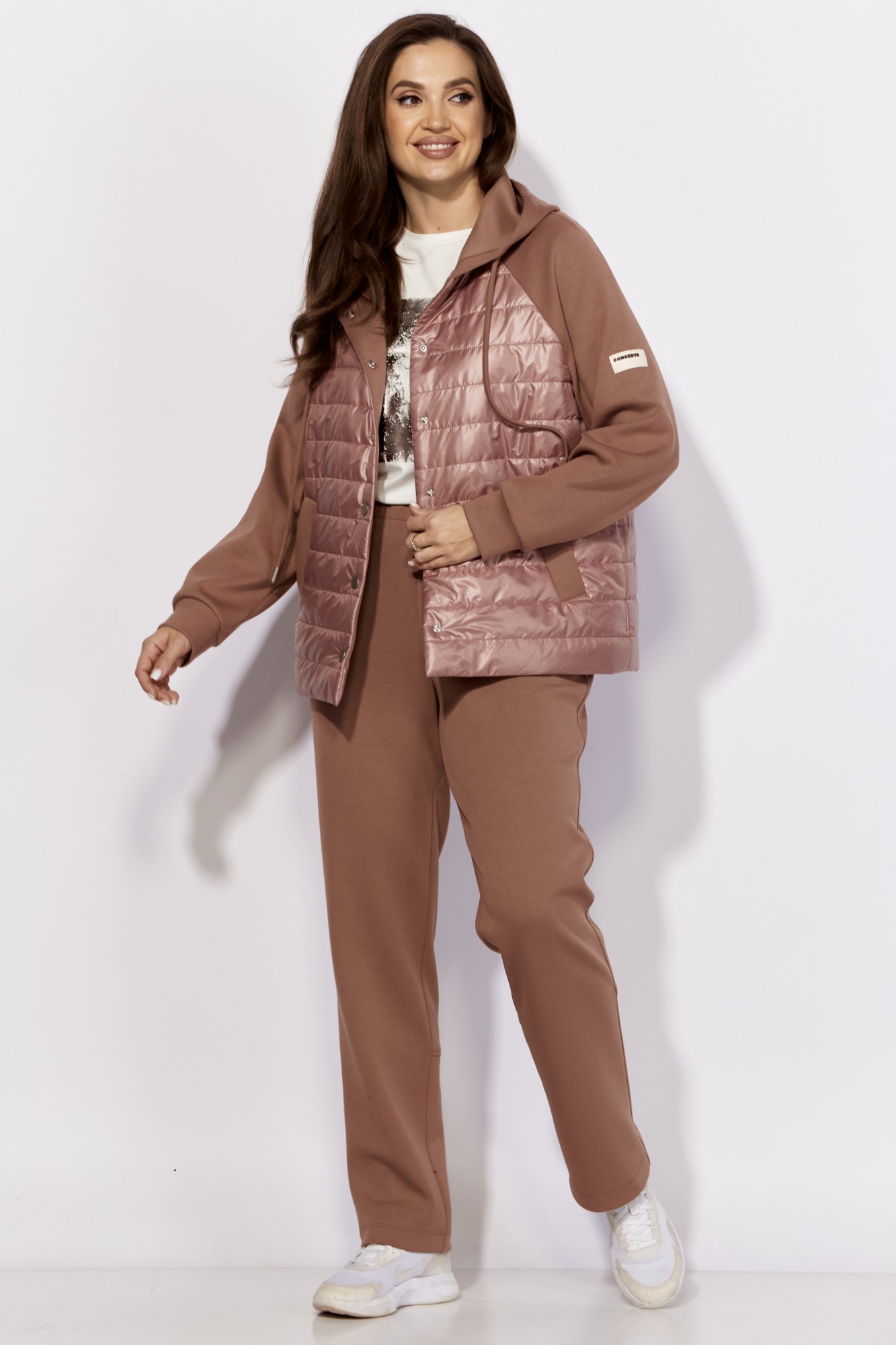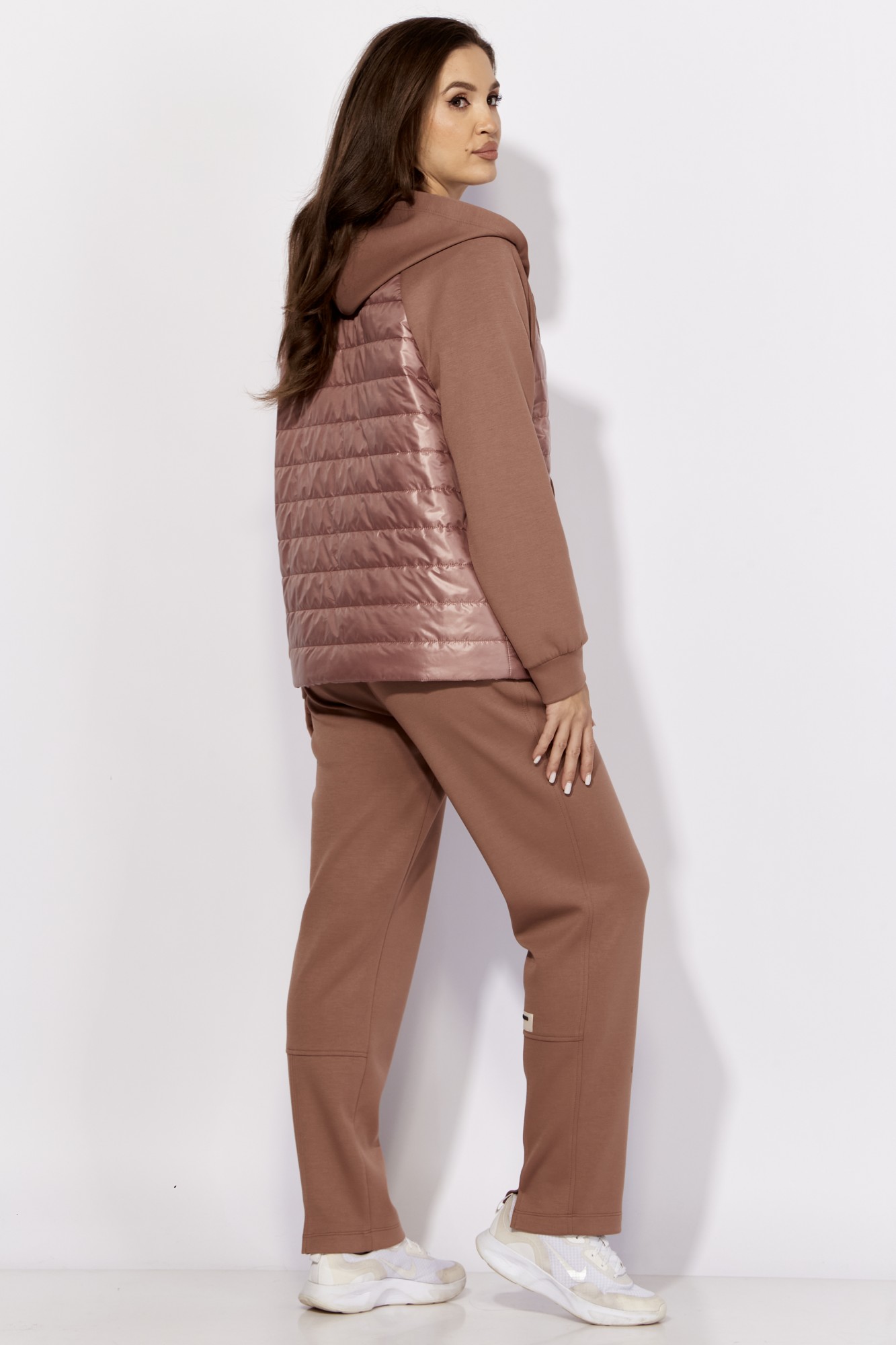 Комплект женский, 2х предметный, состоящий из куртки и брюк. Куртка прямого силуэта, с длинным рукавом, покроя "реглан". По низу рукава притачная манжета. Перед и спинка выполнены из плащевки, стеганой на синтепоне, на подкладке. Спереди карманы и центральная застежка на кнопки. Горловина оформлена капюшоном с кулисой по краю. На рукаве отделочная нашивка. Брюки прямые, с карманами в боковых швах. Сзади, снизу небольшие разрезы в подрезной детали и отделочная нашивка. Пояс притачной, с резинкой по кругу.