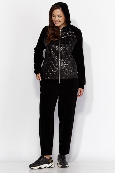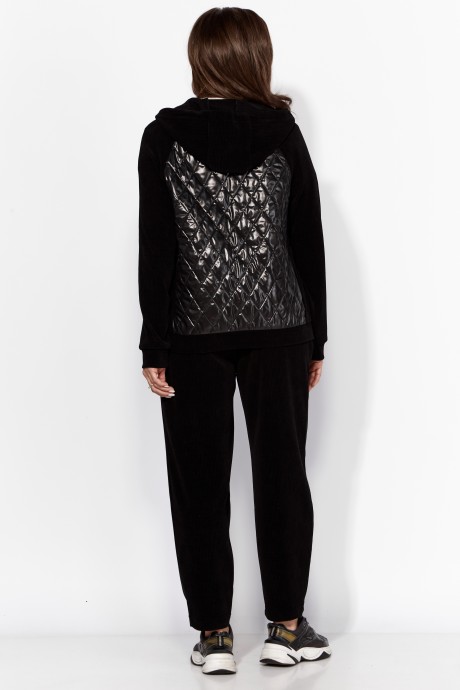 Комплект женский, 2хпредметный, состоящий из куртки и брюк. Куртка прямого силуэта с длинным рукавом. Рукав "реглан" с манжетой по низу. По переду и спинке рельефы из пройм. Спереди, в рельефах, карманы. Застежка центральная , на "молнию". Горловина оформлена капюшоном с кулисой по краю. Низ куртки на манжете. Центральные детали переда и спинки из стежки (плащевка на синтепоне.) Брюки-слаксы, объемные, к низу зауженные. Карманы в боковых швах. Сзади накладной карман с декоративной нашивкой. Пояс цельнокроеный, на резинке.
