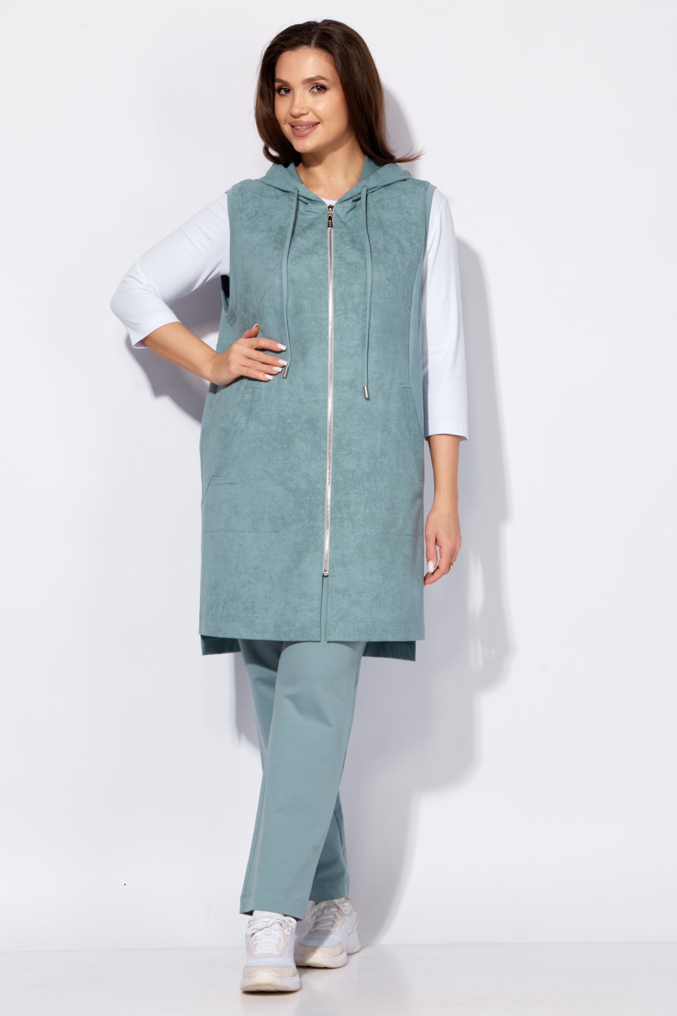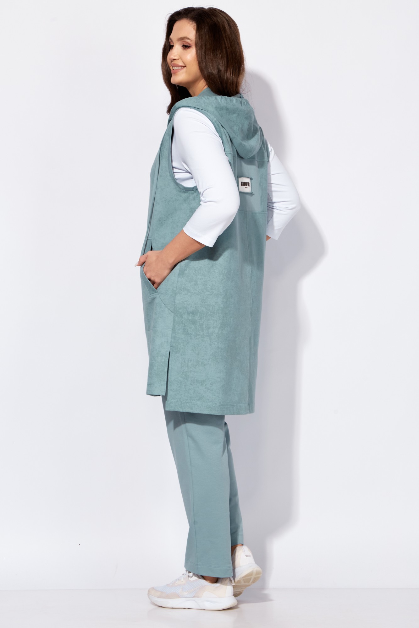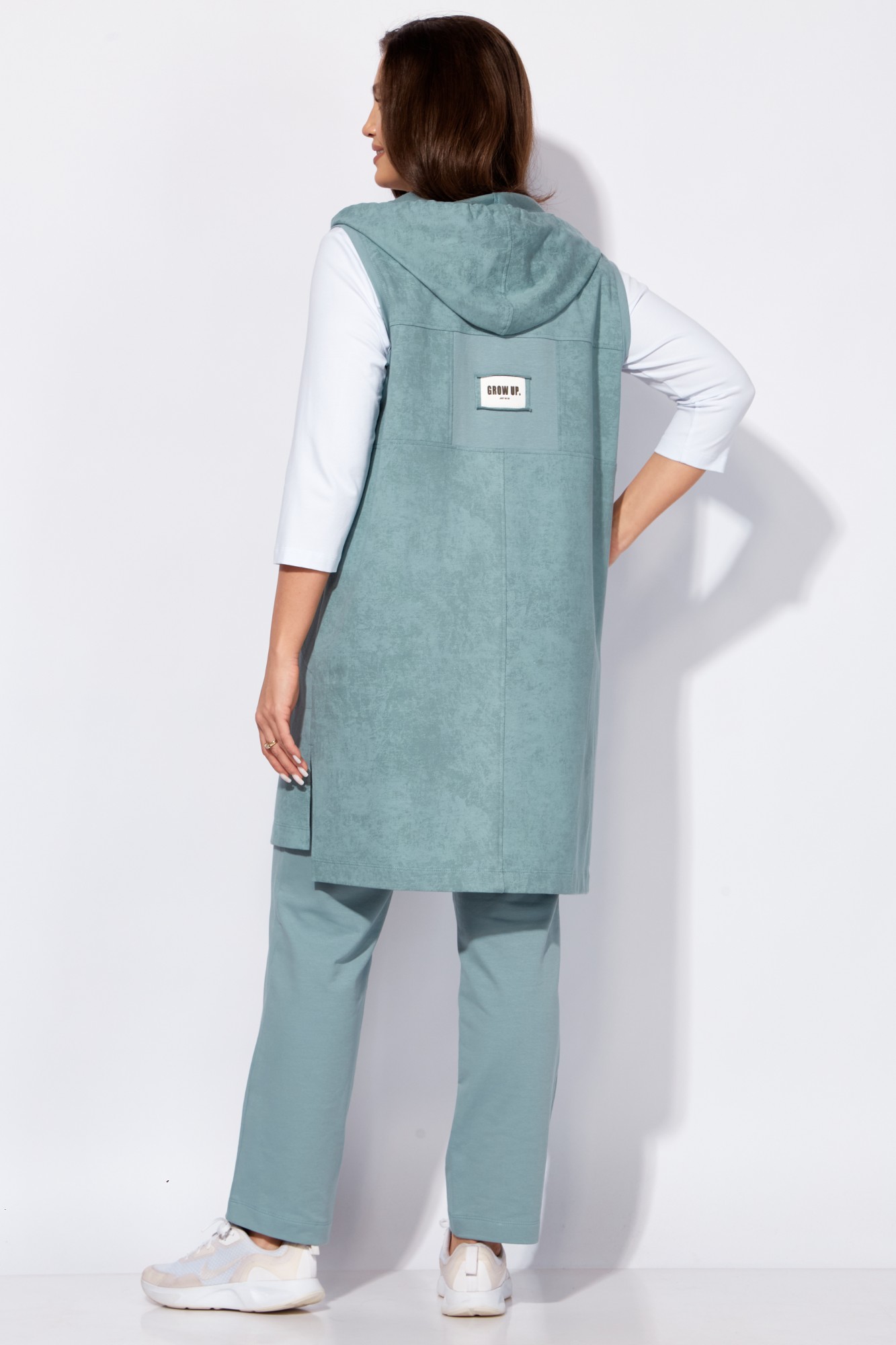 Комплект женский, 3х предметный, состоящий из жилета, брюк и футболки. Жилет прямого силуэта. По переду карманы в фигурных рельефах. По спинке подрезные детали с декоративной нашивкой. Горловина оформлена капюшоном с кулисой. По бокам разрезы. Брюки прямые, с карманами. Пояс притачной с резинкой по кругу. Лонгслив прямого силуэта, с рукавом длинной 3/4.Горловина круглой формы. Перед задекорирован принтом.