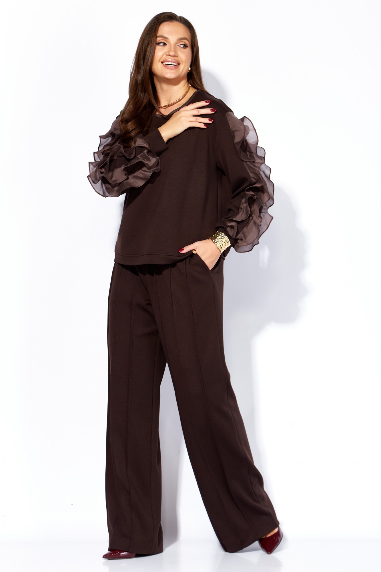 Комплект женский, 2х предметный, состоящий из джемпера и брюк, из трикотажного полотна. Джемпер прямого силуэта, с длинным рукавом. Рукава с чуть спущенной линией плеча, по низу на манжете, задекорирован по центру тремя рядами рюш из отделочной ткани. Вырез горловины круглой формы, с отделочной бейкой по переду. По низу переда подрезная планка. Спинка без особенностей. Брюки прямые, широкие. По переду по три ряда широких, застроченных "на ребро" рельефов и функциональные карманы. Пояс притачной с резинкой по кругу.