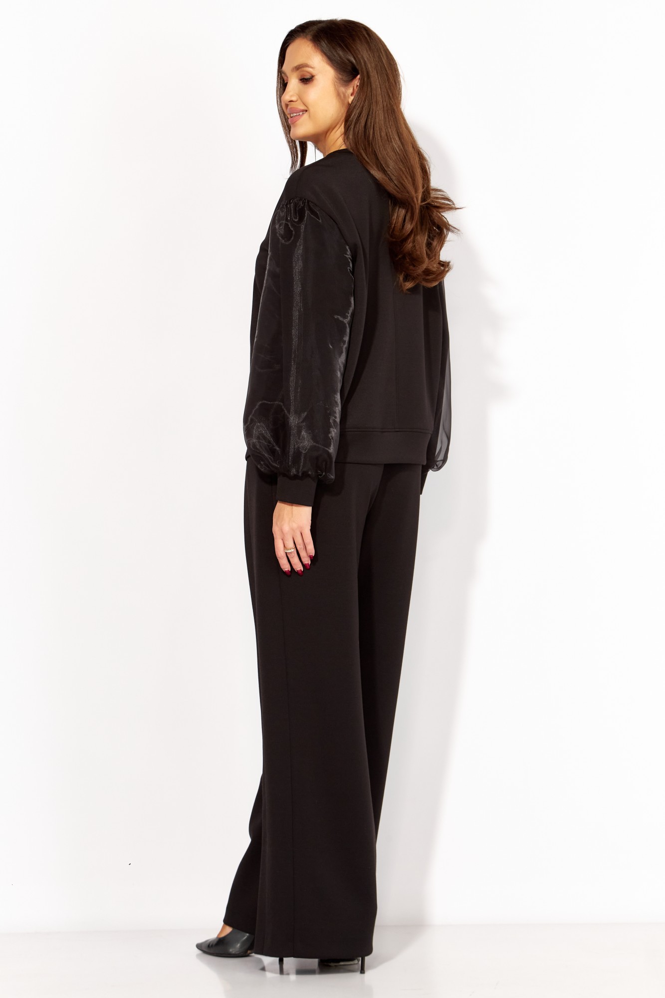 Комплект женский, 2х предметный, состоящий из джемпера и брюк, выполнен из трикотажного полотна"TENSEL" с отделкой органзой. Джемпер прямого силуэта с длинным рукавом. Рукав со спущенной линией плеча, двойной. Нижний-трикотажное полотно, верхний- объемный, со сборкой по окату и низу, из органзы. По низу манжета. Вырез горловины круглой формы с подрезной бейкой. По низу притачная планка с разрезами по бокам. Перед задекорирован ярким принтом. Брюки прямые, широкие. По переду отлетные наклонные складки, по низу с разрезами. От пояса мягкая складка. Карманы в боковых швах. Пояс притачной, с резинкой по кругу.