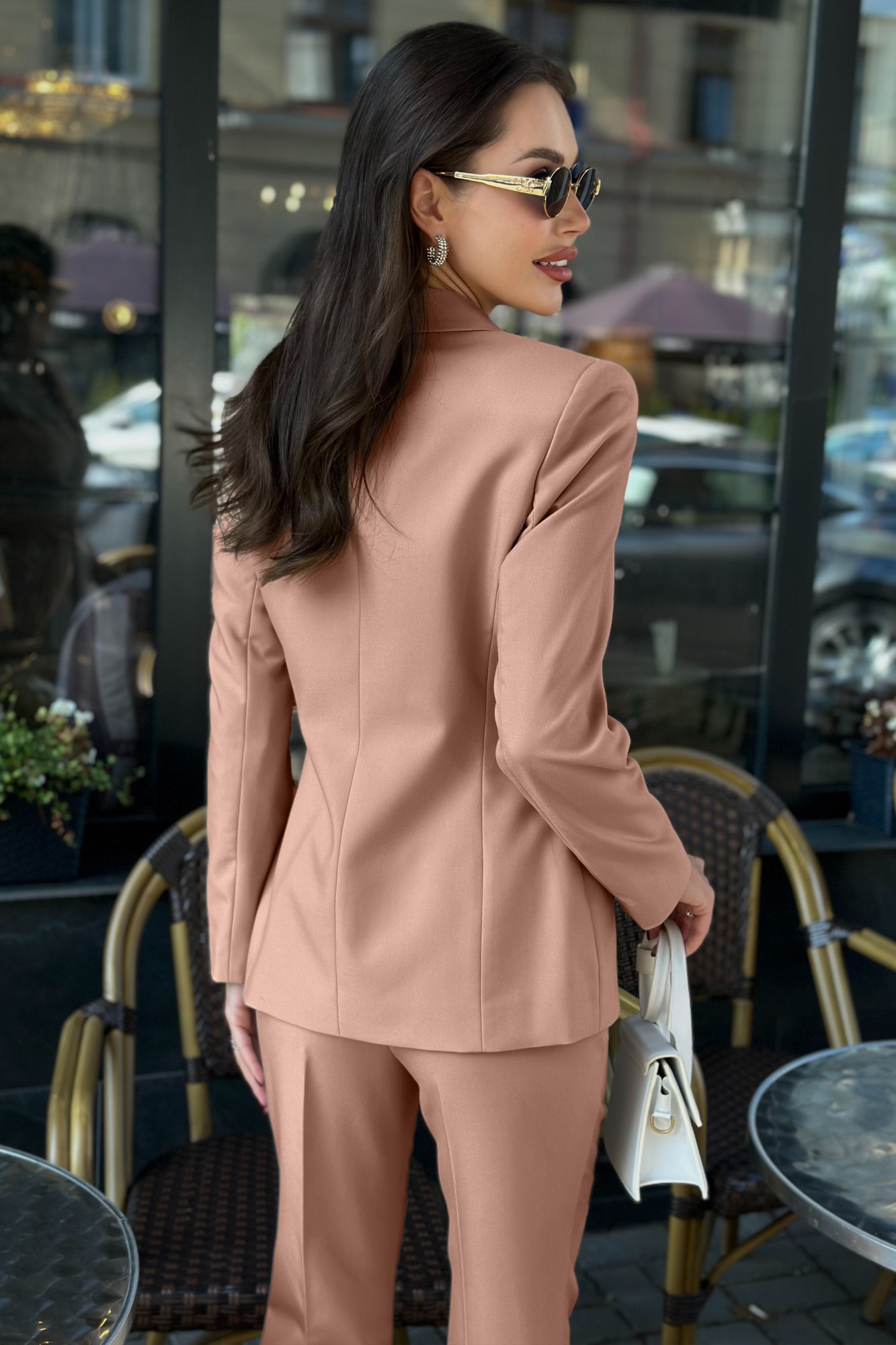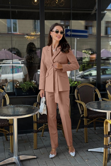 Костюм полуприлегающего силуэта с фантазийной застежкой(лацкан крепится в петле и создает эффект галстука). Элегантный костюм с интересным кроем не оставит Вас равнодушной. Жакет на подкладке с пиджачным воротником с лацканами. По переду вытачки и карманы в рамку, спинка со средним швом и рельефами. Рукав длинный двухшовный. Брюки слегка заужены к низу, на поясе, с застежкой на молнию и петлю и пуговицу. Заутюженные канты по передним и задним полотнищам.