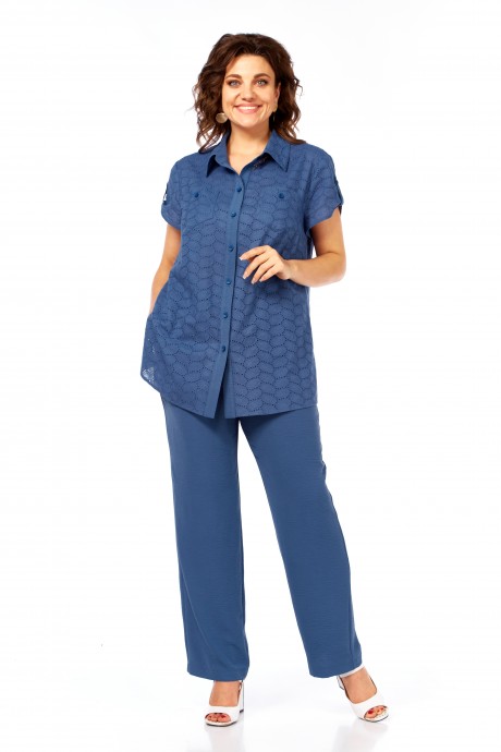 Лёгкий комплект-двойка, состоящий из однотонных брюк и рубашки из хлопка ришелье. Такой комплект подойдёт как для повседневной носки, так и для праздничных мероприятий. Рубашка свободного силуэта, с центральной бортовой застёжкой на семь петель и пуговиц. На переде обработаны нагрудные вытачки, накладные карманы. Спинка с отрезной кокеткой и выходящей из-под неё патой и складкой. В боковых швах обработаны разрезы. Рукав втачной, короткий, присобран патой. Воротник стояче-отложной с отрезной стойкой. Брюки прямые, на притачном поясе с пуговицей и с резинками в районе боковых швов. На передних половинках обработаны функциональные карманы. Фурнитура может незначительно отличаться от представленной на фото.