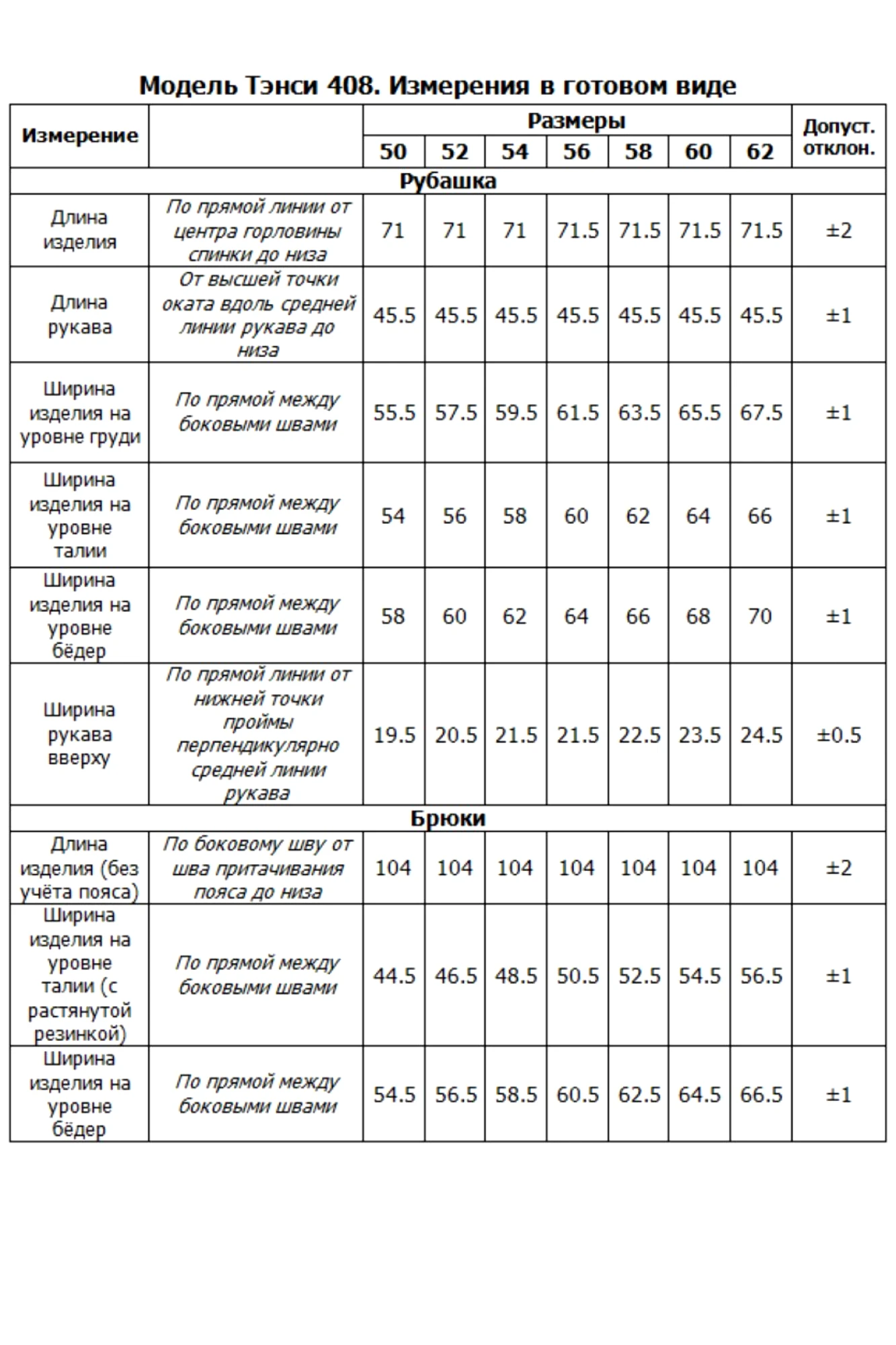 Таблица размеров