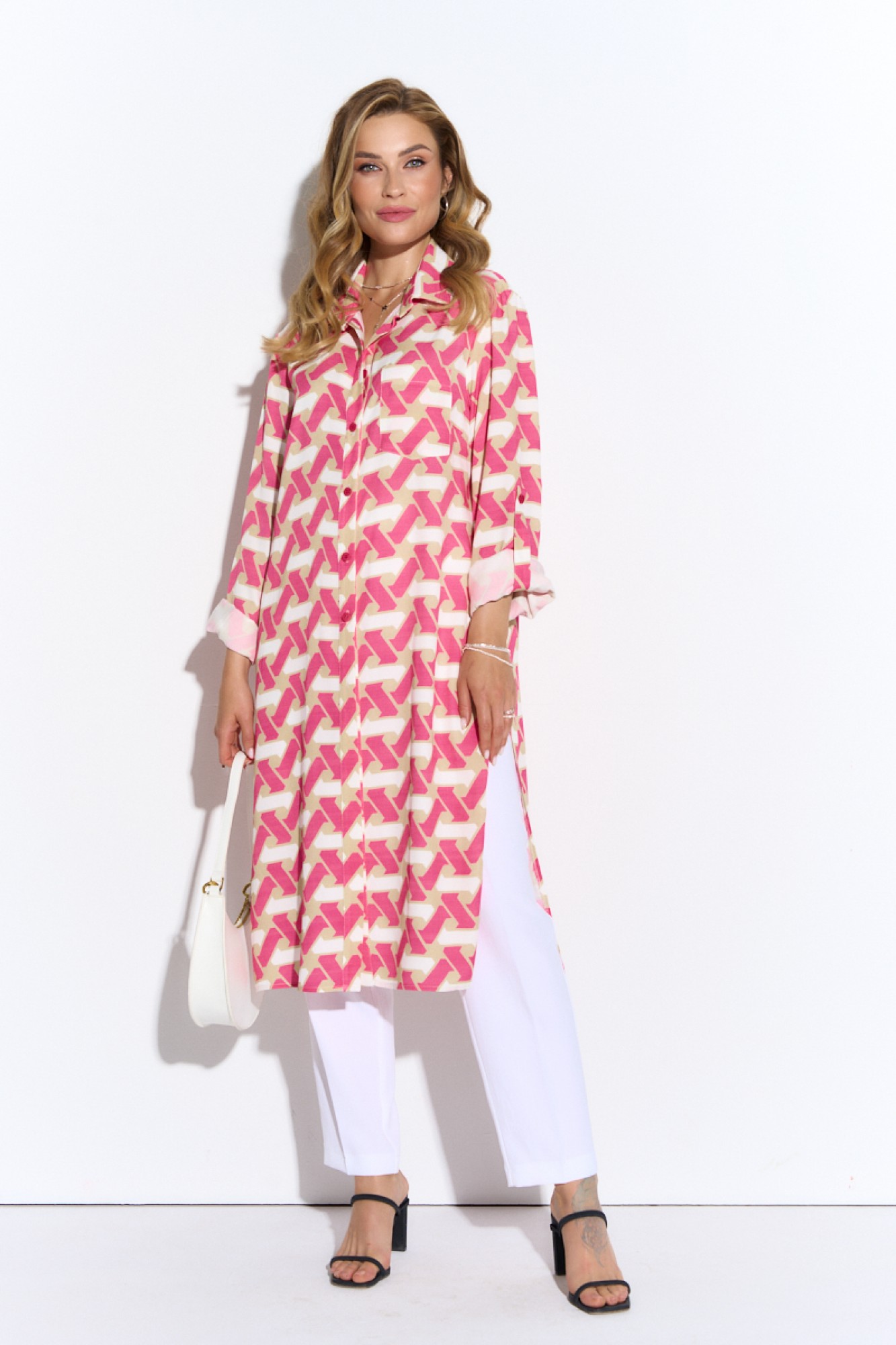 Комплект из блузки и брюк. Удлиненная блузка из вискозы. Рубашечный воротник, втачной длинный рукав на манжете, застежка на пуговицы до низа, высокие разрезы по бокам. Брюки прямые с высокой посадкой, с заутюженными складками, зауженные к низу. На передней половине наклонных карманов с листочками. Вверху брюки на притачном поясе, по бокам вставлена резинка, застежка на «молнию» и пуговицу.