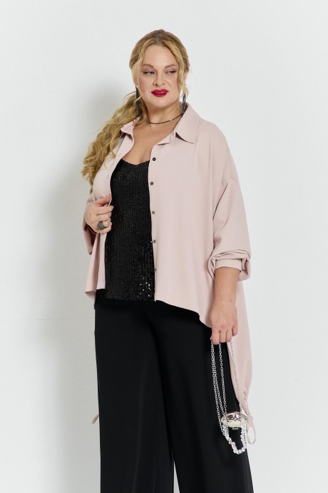 Объёмная блуза с мягкой линией плеча, рубашечным воротником на отрезной стойке, с кулисой по низу спинки. Застёжка на пуговицы, рукава на манжетах без застёжки. Топ из ажурной ткани на подкладке. Спереди нагрудные вытачки. Бретели регулируются по длине. Прямые, широкие брюки с карманами спереди и на поясе с резинкой.