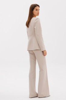 Комплект двухпредметный из жакета и брюк Жакет прилегающего силуэта с глубоким V-м вырезом, застежка центральная на навесные петли. Талия отрезная, Полочка и спинка верхней части с выточками, нижняя часть полочки с выточками и рельефами. Рукав втачной, двухшовный с плечевой накладкой. Жакет на подкладке. Такой жакет максимально подчеркнет линию талии, сделает образ притягательным и женственным. Длина по спинке -65 см, рукав 64 см. Классические расклешенные брюки полуприлегающего силуэта с высокой посадкой, пояс притачной со шлевками, застежка на молнию и петлю-пуговицу, брюки без карманов. Выполнены из премиальной ткани костюмной группы. Визуально удлиняют ноги и делают фигуру более женственной.