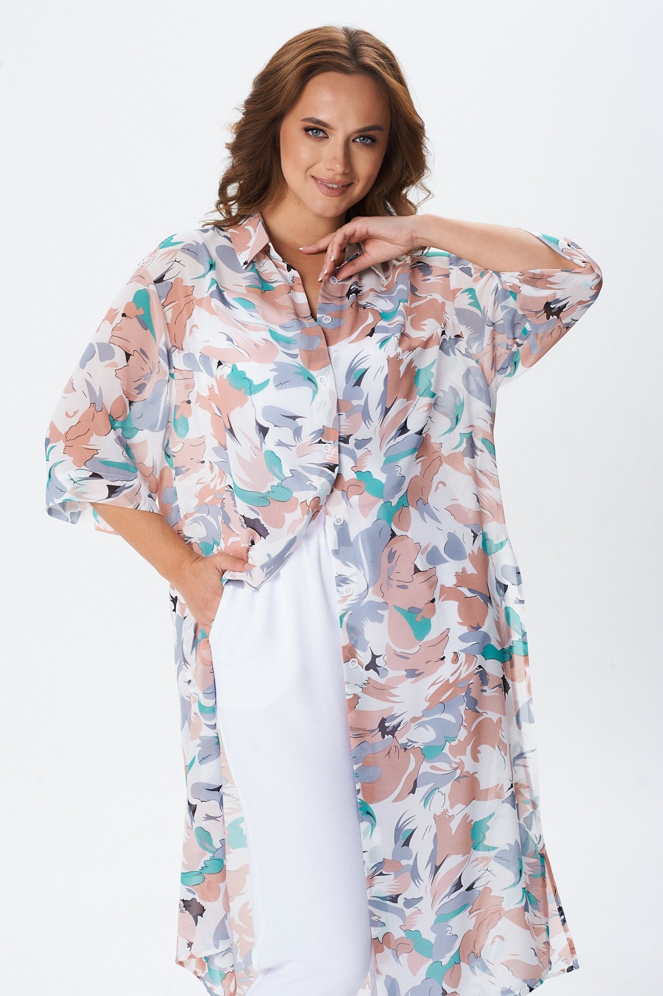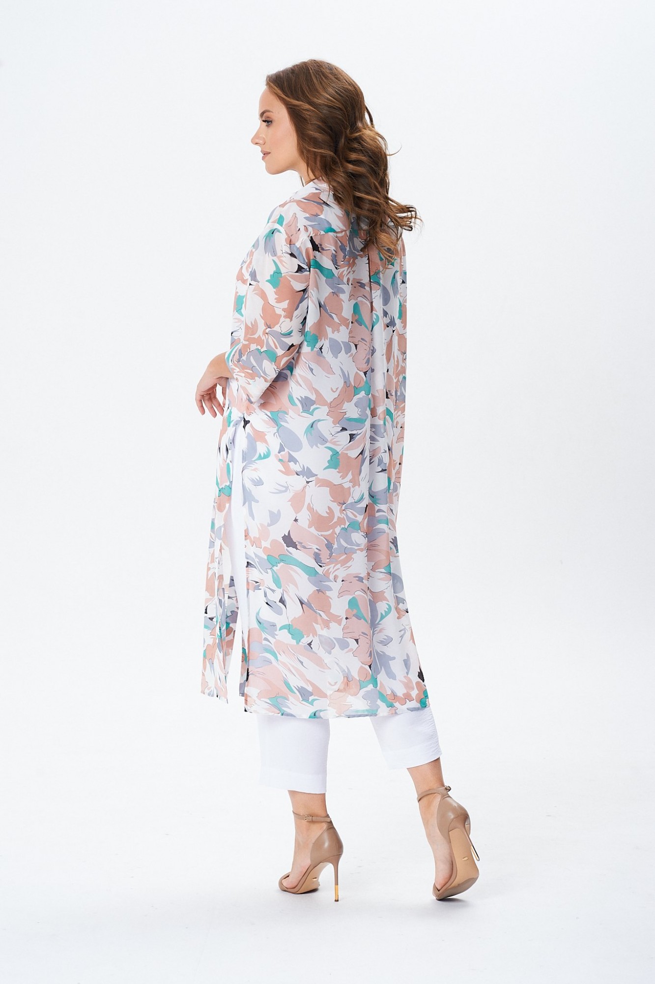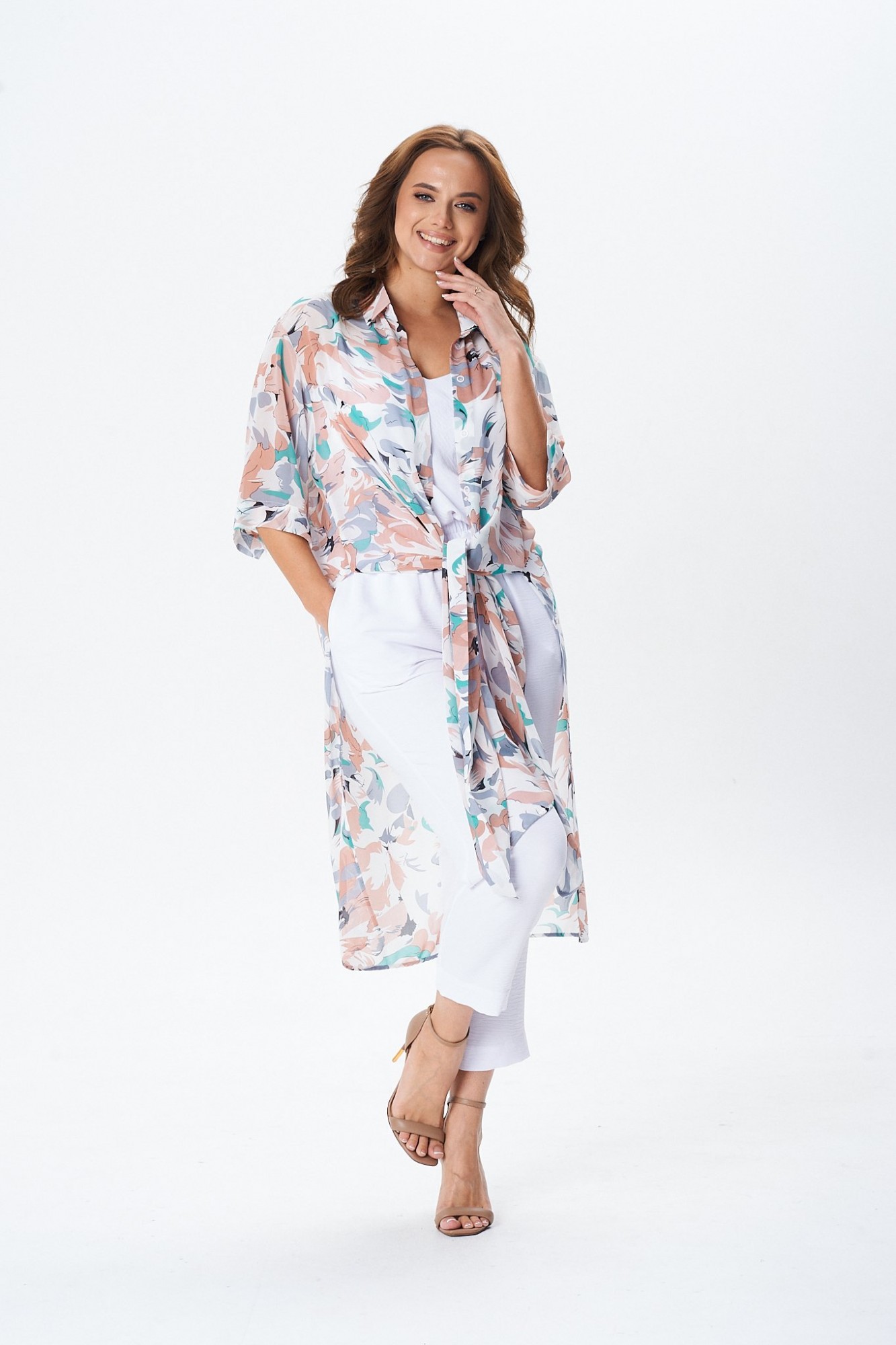 Комплект женский трехпредметный, состоит из шазюбля, брюк и топа. Шазюбль прямого силуэта свободного покроя из плательно-блузочной ткани шифон с принтом. По переду центральная застежка на петли и пуговицы, нагрудные вытачки из проймы, в боковых швах высокие разрезы. По спинке кокетка, складка. Воротник рубашечный на стойке. Рукав втачной, линия плеча спущена. Топ на бретелях прямого покроя. По переду нагрудные вытачки из бокового шва. Брюки на поясе с резинкой, в боковых швах карманы.