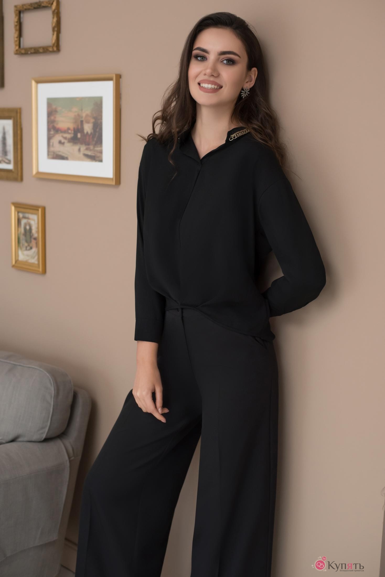 Стильный комплект, прекрасный вариант выглядеть элегантно и женственно.Он подчеркнет чувство стиля и хороший вкус его обладательницы. Костюм женский, состоит из блузки прямого силуэта и брюк-«палаццо» (прямые от бедра). Блузка женская, объёмная, со спущенной линией плеча. По переду заложена складка от горловины до низа, имитирующая по горловине застёжку. По низу переда от центра заложены по 2 встречные складки. Спинка с одной бантовой складкой , идущей от горловины. По низу боковых заложено по 2 односторонних складки, придающих объём по нижней части блузки. Рукава втачные, одношовные, длиной 7/8. Низ рукава обработан притачной манжетой, застёгивающейся на 2 петли и пуговицы. Горловина овальной формы, обработана воротником стойкой, с закруглёнными концами. На стойку нашита декоративная отделка в виде тесьмы (тесьма может быть другой). Брюки «палаццо», прямые от бедра, со стрелками. По переду в боковых швах обработаны карманы с наклонной линией входа. На задней половинке брюк стачаны талевые вытачки. Верхний край брюк обработан поясом-обтачкой. Брюки застёгиваются спереди на тесьму-«молнию» и петлю и пуговицу на поясе. Т