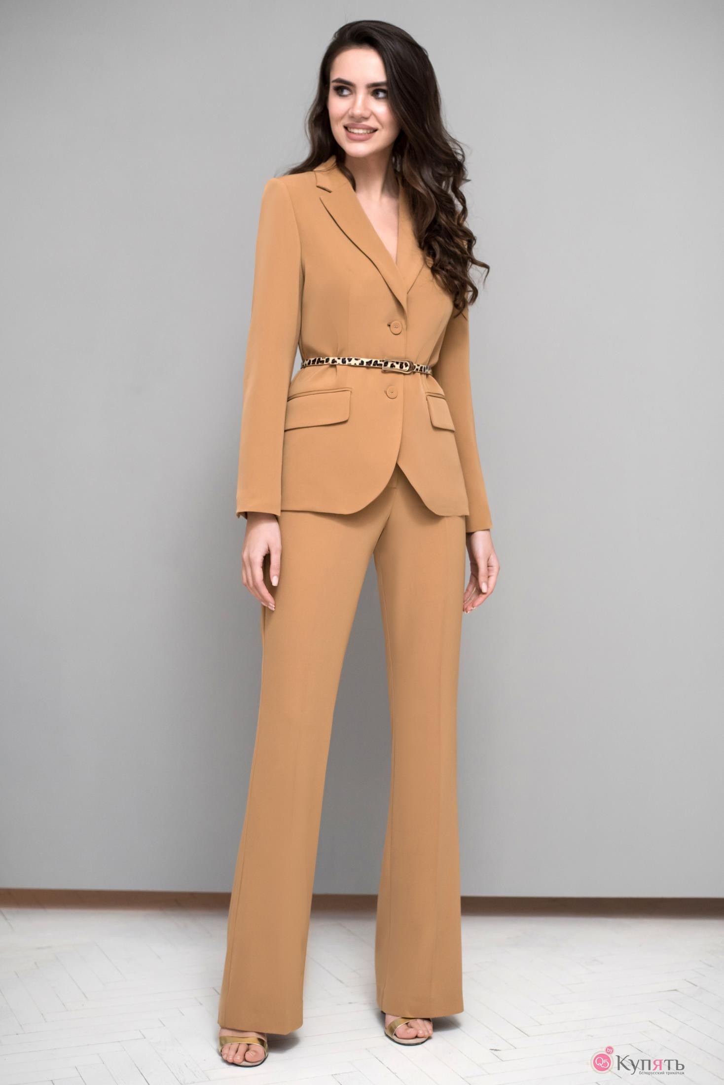 Когда разговор заходит о женственности, нежности и изысканности, то костюм цвета кэмел — это именно тот вариант, который поможет создать незабываемый элегантный образ. Костюм женский двойка. Костюм состоит из жакета с центральной бортовой застёжкой полуприлегающего силуэта на подкладке и расширенных от колена к низу брюк. В комплект к костюму идет застегивающийся пояс. Перед жакета с центральной бортовой застёжкой на 2 петли и пуговицы (форма и дизайн фурнитуры может изменяться) и с талевой вытачкой. Нижняя часть борта закругленной формы. Немного ниже уровня линии талии расположен карман «в рамку» с клапаном. Углы клапана закругленной формы. Спинка со средним швом и рельефами, выходящими из проймы и идущими до низа. Рукава втачные, двухшовные, длинные. По низу локтевого шва обработана шлица, которая застегивается на 3 петли и пуговицы. Плечевой пояс жакета оформлен с плечевыми накладками Горловина обработана воротником пиджачного типа на квадратной горловине. Брюки женские со «стрелками», расширенные от колена к низу. На задних половинках брюк имеются талевые вытачки. Верхний край брюк обработан притачным поясом, по спинке в пояс вставлена резинка для лучшего прилегания к талии. Брюки застегиваются спереди на тесьму-молнию и петлю и пуговицу на поясе. Тип ткани: костюмно-плательная.