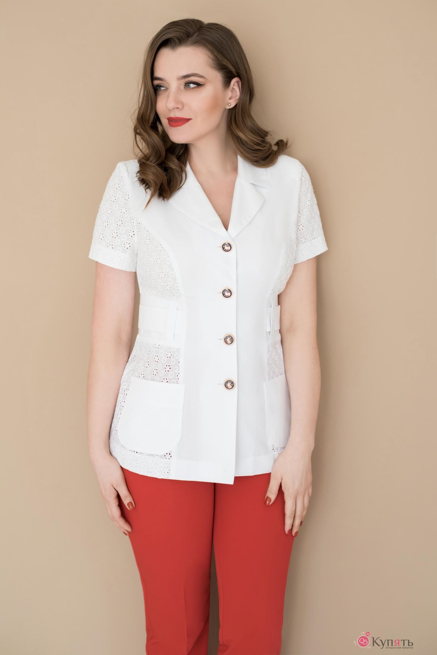 Прекрасный летний костюм, его можно назвать универсальным и практичным. Он уместен как на работе, так и просто для прогулки по городу. Костюм женский состоит из блузки, полуприлегающего силуэта и укороченных брюк. Блузка женская с центральной бортовой застёжкой на 4 петли и пуговицы, и притачным широким поясом на уровне линии талии, от центральных частей переда. Перед с рельефными швами, выходящими из проймы и идущими до низа. Боковая верхняя и нижняя части переда из отделочного материала (рисунок шитья на отделочном материале может изменяться).На притачном поясе спереди притачана шлевка, которая держит хлястик, выходящий из шва притачивания центральной части переда к поясу. По низу блузки обработаны накладные карманы на подкладке. Спинка с притачным поясом на уровне линии талии, средним и рельефными швами, выходящими из проймы и идущими до низа, прерывающимися на уровне пояса. Хлястики на поясе переда, переходят на спинку и застегиваются на петлю и пуговицу. Горловина обработана воротником пиджачного типа. Брюки женские, зауженные к низу. Верхний край брюк обработан притачным поясом, на уровне боковых швов с 52 размера в пояс вставлена резинка. Брюки застегиваются спереди на тесьму-молнию и петлю и пуговицу. По низу брюк прострочена отделочная строчка.