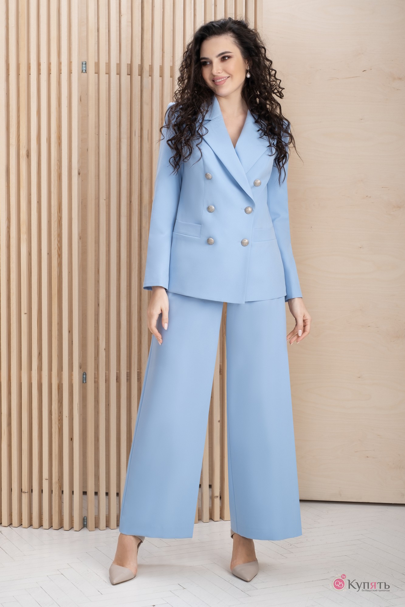 Удобный и изящный костюм двойка, который прекрасно подойдет для работы так и для прогулки с друзьями. Костюм женский, состоит из двуборного жакета полуприлегающего силуэта, на подкладке и брюк-«кюлотов». Костюм предназначен для повседневной носки. Жакет женский с двубортной застёжкой на 4 основных петли и пуговицы, пара верхних пуговиц несут декоративный характер. Перед жакета с отрезной боковой частью, рельефный шов выходит из проймы и идет в боковой шов чуть ниже уровня линии талии. В горизонтальном рельефном шве расположен прорезной карман с листочкой. Спинка со средним швом и рельефными швами, выходящими из проймы и идущими до низа. Рукава втачные, двухшовные, длинные. Горловина обработана воротником пиджачного типа с отрезными лацканами. Концы воротника острые. Брюки - «кюлоты». В боковых швах обработаны карманы с наклонной линией входа. Верхний край брюк обработан притачным широким поясом-кокеткой. Брюки застёгиваются спереди на тесьму-молнию и 2 декоративных пуговицы и петли на поясе-кокетке.Длина жакета по среднему шву спинки – 66см, длина рукава – 61,5см, длина брюк -«кюлотов» по боковому шву с поясом-кокеткой – 97см, длина брюк-«кюлотов» по боковому шву без пояса – 90см, ширина брюк-«кюлотов» по низу - 33-34см.