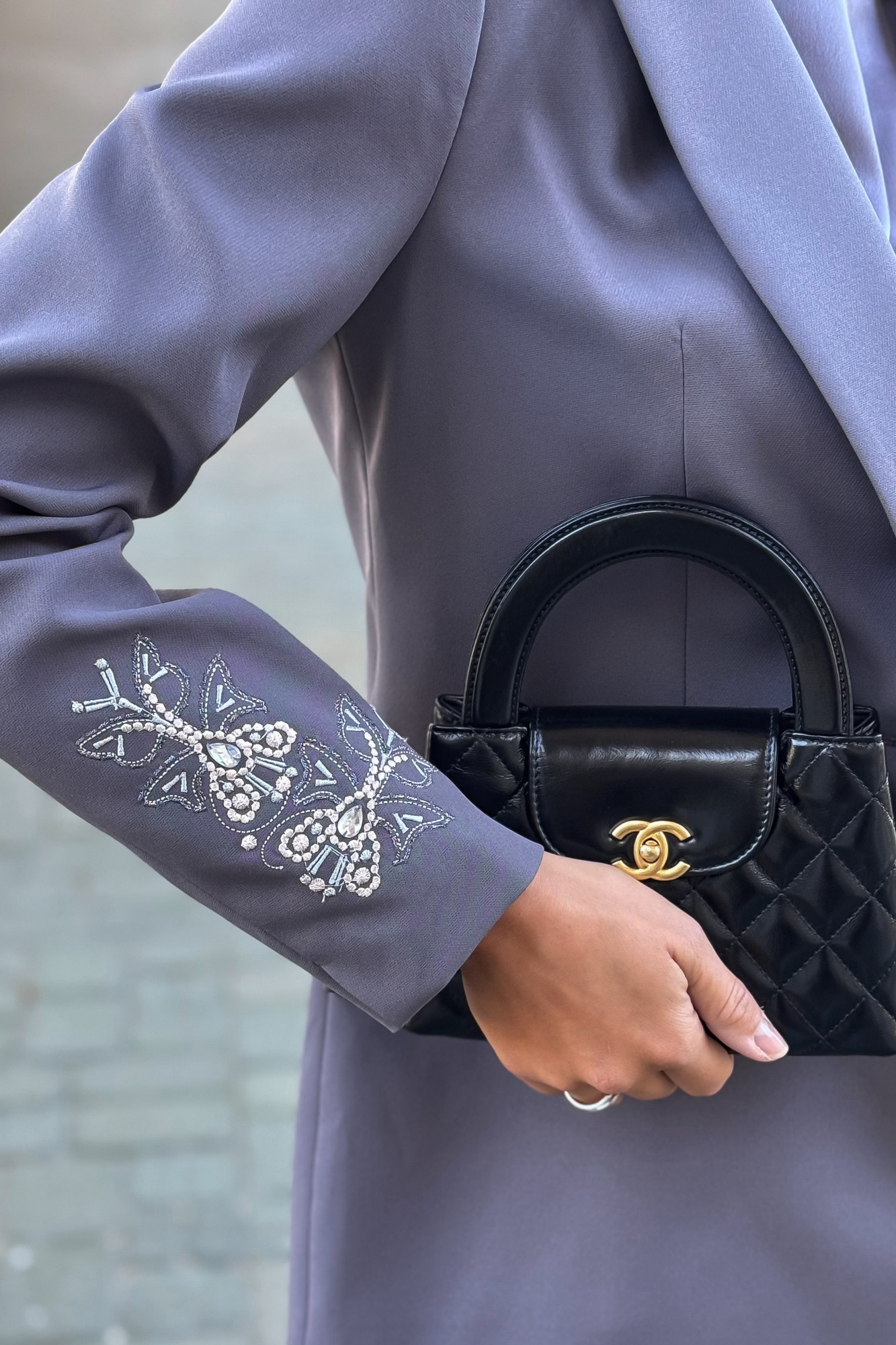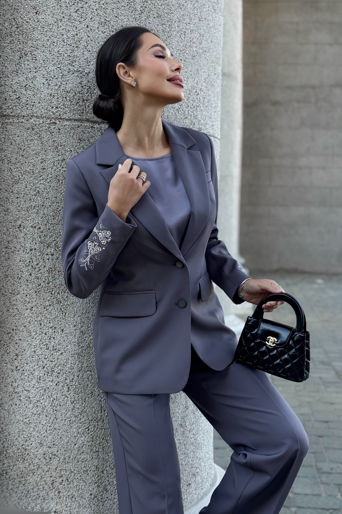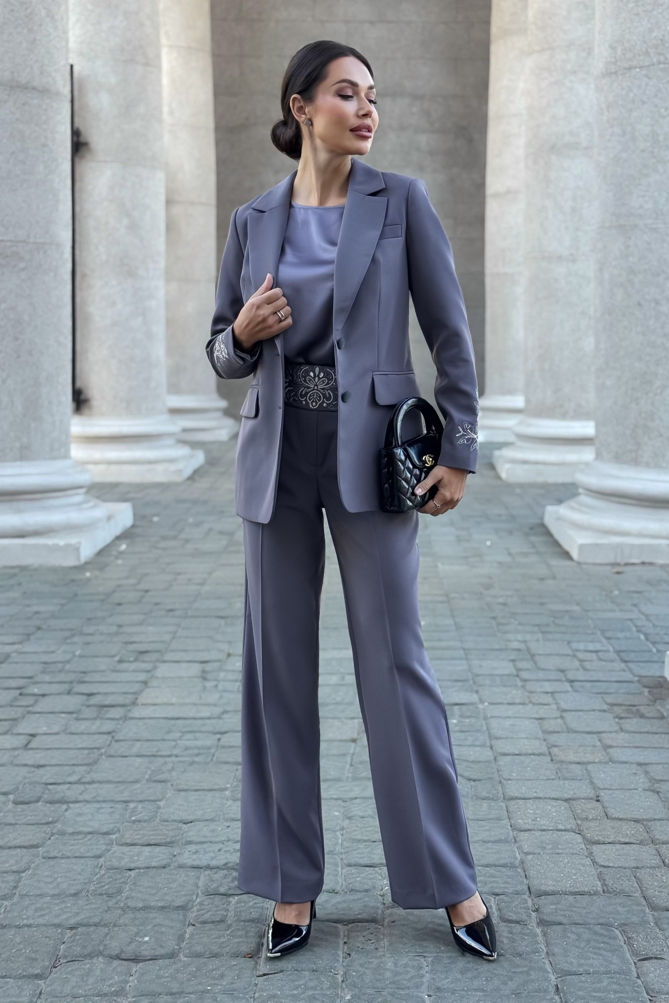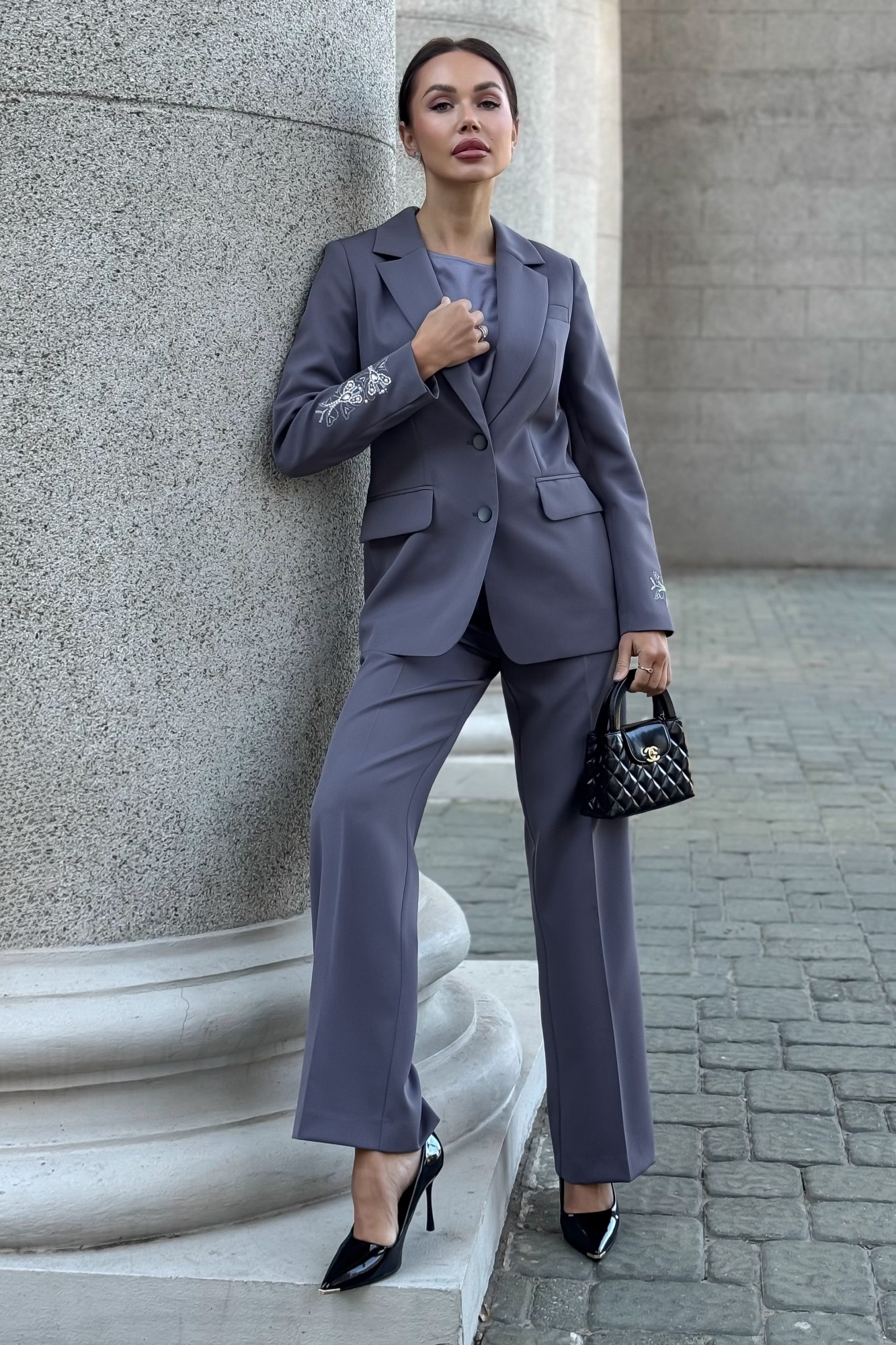 Этот изысканный брючный костюм – воплощение элегантности, загадочности и безупречного вкуса. Лаконичный силуэт, строгие линии и идеальная посадка подчёркивают утончённость образа. Особый акцент в костюме сделан на вышивке – изящный цветочный узор на поясе и манжетах жакета создаёт роскошный контраст, добавляя нотку утончённого блеска. Атласный топ с лёгким переливом гармонично дополняет образ, придавая ему мягкость и женственность. Костюм женский трёхпредметный состоит из удлиненного жакета полуприлегающего силуэта с вышивкой на рукаве, брюк и блузы. В комплект к брюкам идет съемный пояс с вышивкой расшитой декоративными камнями. Жакет женский из костюмно-плательной ткани, удлиненный, полуприлегающего силуэта, на подкладке, с центральной бортовой застежкой на 2 петли и пуговицы. По переду жакет с таллиевой вытачкой, выходящей из горизонтального подреза расположенного чуть ниже линии талии, в котором обработан прорезной карман ""в рамку"" с клапаном. Один угол клапана - закругленный, другой заостренный - идет на продолжение бокового шва. В верхней части переда на левой половинке настрочена листочка, несет декоративную функцию. Спинка с рельефными швами, выходящими из проймы до низа и средним швом. Горловина обработана отложным воротником пиджачного типа. Углы лацкана заостренной формы. Линия борта внизу закругленная. Рукава втачные двухшовные, длинные, с декоративной вышивкой в нижней части. Внизу локтевой шов завершается маленькой шлицей. Жакет с плечевой накладкой. Брюки женские из костюмно-плательной ткани «со стрелками» прямые от колена, длинные с завышенной линией талии, без пояса, на обтачке. В верхней части передних половинок брюк застрочены 2 пары складок. Одна складка является продолжением «стрелки». На задних половинках брюк стачаны 2 пары талиевых вытачек. В боковых швах обработаны карманы с наклонной линией входа. В верхней части брюк по среднему и боковым швам настрочены шлевки для пояса. Верхний край брюк обработан обтачкой. Спереди обработана застежка на тесьму-молнию с гульфиком и откоском. В комплект к брюками идет съемный пояс, застегивающийся на 2 пришивных брючных крючка. Блуза женская из блузочной ткани со спущенной линией плеча, без рукавов, свободного кроя, полуприлегающего силуэта. Перед простой, спинка со средним швом, в верхней части обработан разрез, застегивающийся на 1 навесную петлю и пуговицу. Горловина окантована, по краю проложена отделочная строчка, ширина шва 0,6 см. По краю проймы и разрезу проложена отделочная строчка - 0,2 см. По низу блузки широкая подгибка. Внимание!!! размер и цвет фурнитуры может незначительно отличаться от фото.