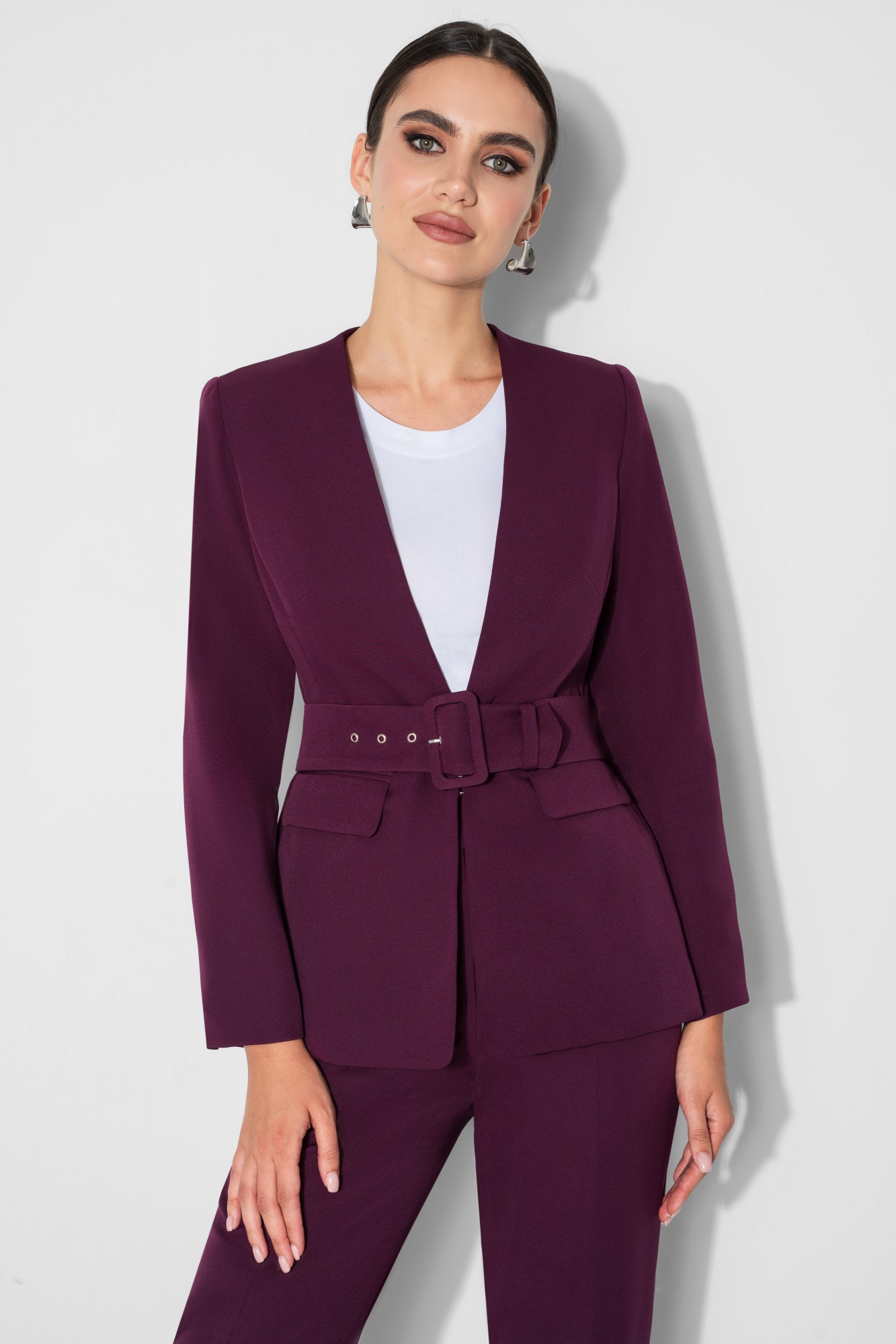 Жакет женский полуприлегающего силуэта с центральной бортовой застежкой встык на два потайных крючка.