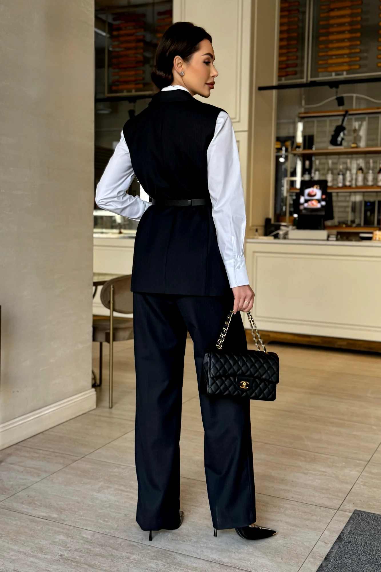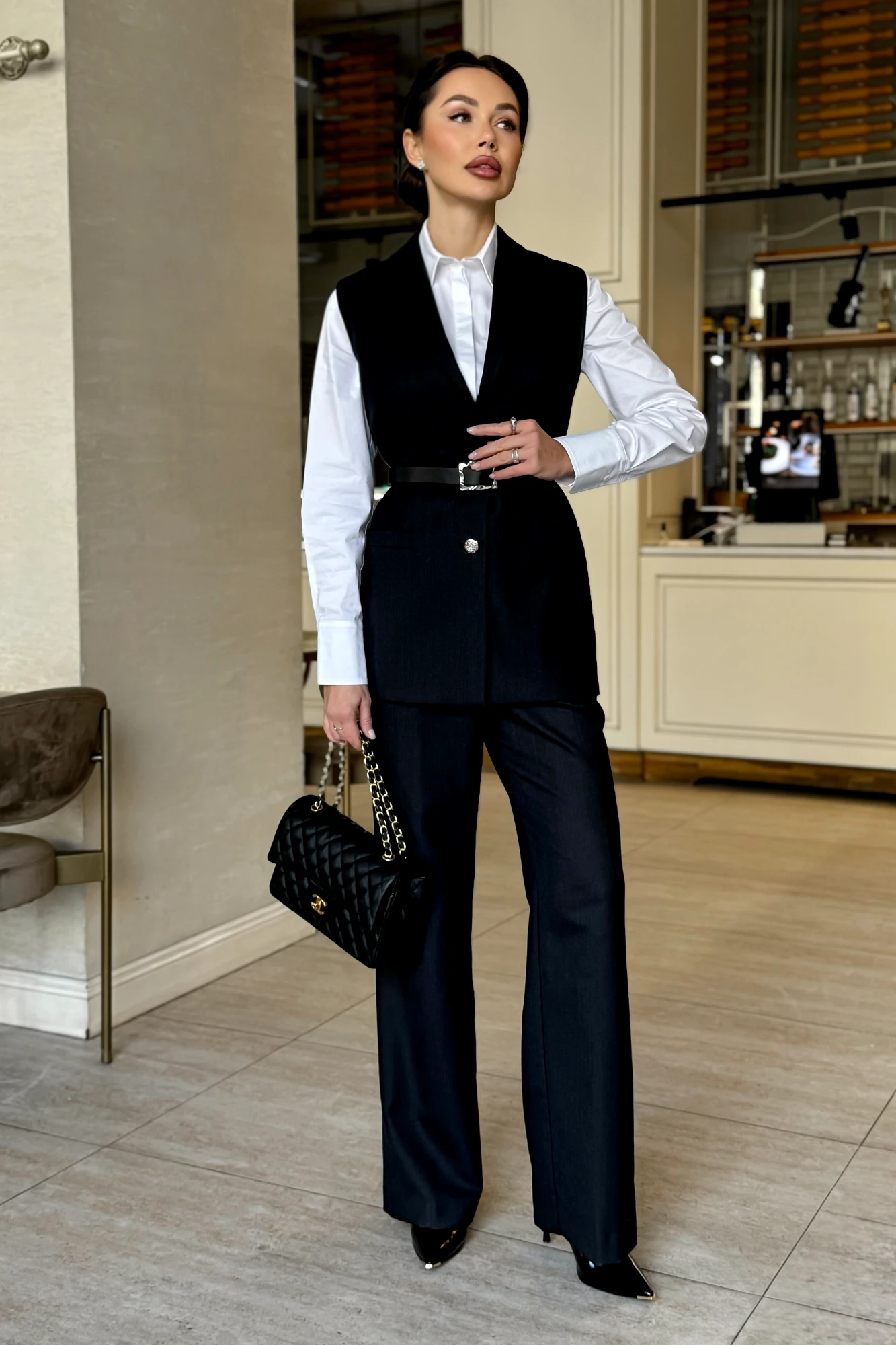 Женский брючный костюм с жилетом URS – это современное воплощение элегантности и делового стиля, которое идеально подойдёт для уверенных женщин, ценящих строгий силуэт и комфорт. Такой костюм двойка с жилетом станет универсальной основой гардероба, позволяя создавать безупречные офисные образы и стильные повседневные комплекты. Костюм женский предназначен для повседневной носки. Костюм состоит из жилета на подкладке полуприлегающего силуэта и прямых брюк, в комплект к костюму идет ремень (фурнитура на изделии может незначительно отличаться от фото). Жилет женский полуприлегающего силуэта с центральной бортовой застежкой на 2 петли и пуговицы (фурнитура на изделии может незначительно отличаться от фото). Перед жилета с карманами с листочками, расположенными немного ниже уровня линии талии, от входа в карман вверх идет вытачка, от проймы до низа идет рельефный шов. Спинка жилета со средним швом и вертикальными рельефами, которые выходят из проймы и идут до низа. Горловина обработана воротником пиджачного типа. Проймы жилета обтачные. Брюки женские прямые. В боковых швах обработаны карманы с наклонной линией входа. На задних половинках стачаны таллиевые вытачки. Верхний край брюк обработан притачной широкой обтачкой со шлевками.