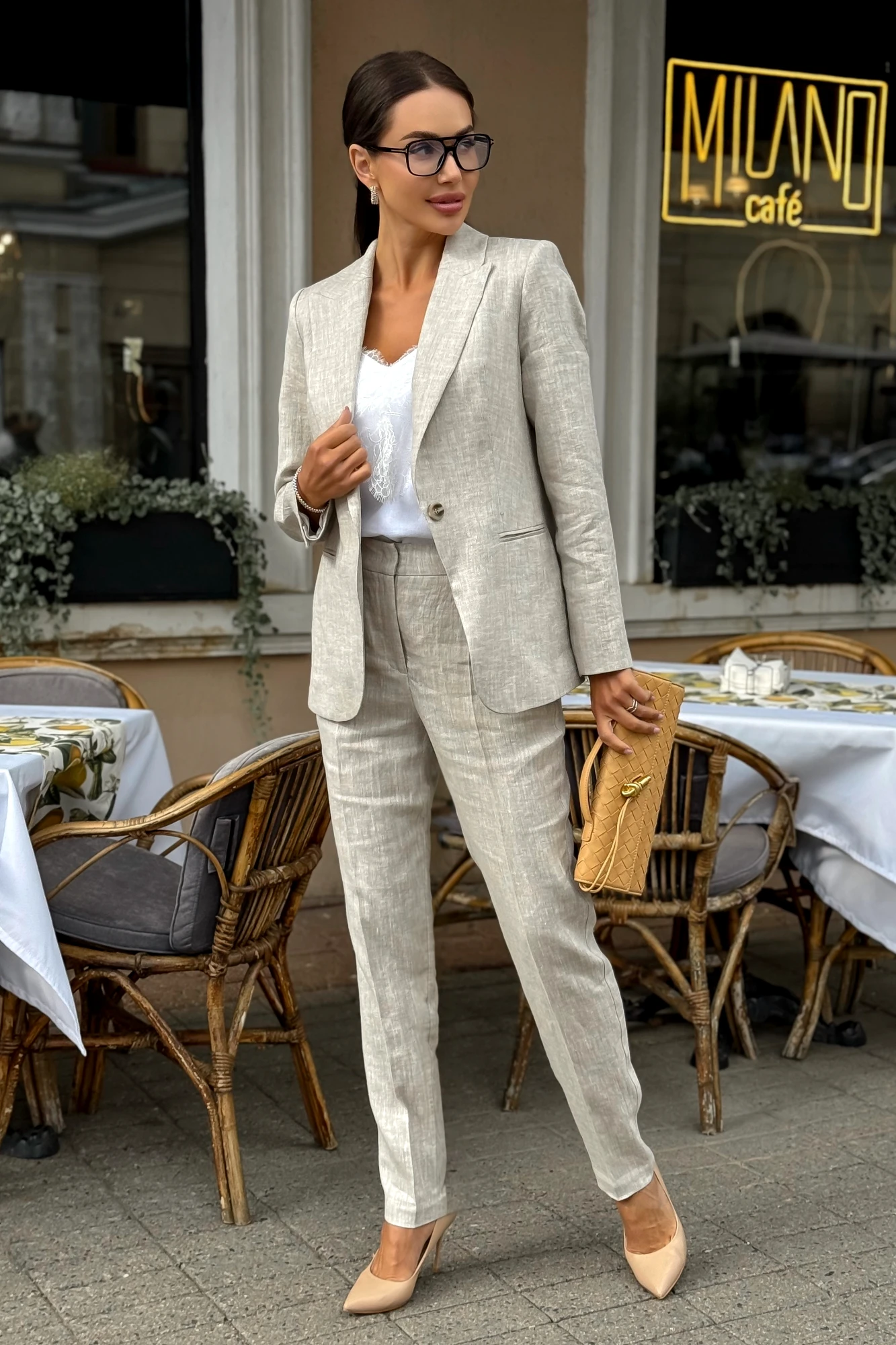 Жакет Длина жакета по среднему шву спинки –66,0 см (±2,0 см), Ширина жакета на уровне глубины проймы – 48,0 см (±1,0 см), Ширина на уровне линии талии – 46,5см (±1,0 см), Ширина на уровне линии бедра – 50,5 см (±1,0 см), Длина рукава – 61,0 см (±1,0 см), Ширина рукава вверху – 16,5 см (±1,0 см), Ширина рукава внизу - 12,0 см (±0,5 см), Длина плеча – 11,5 см (±0,5 см). Брюки Длина брюк по боковому шву с поясом – 101,5см (±2,0 см), Ширина пояса - 4,5см (±0,5 см), Ширина брюк на уровне линии талии – 35,0см (±1,0 см), Ширина брюк на уровне линии бедер – 47,0см (±1,0 см), Ширина брюк по низу – 17,5см (±0,5 см).