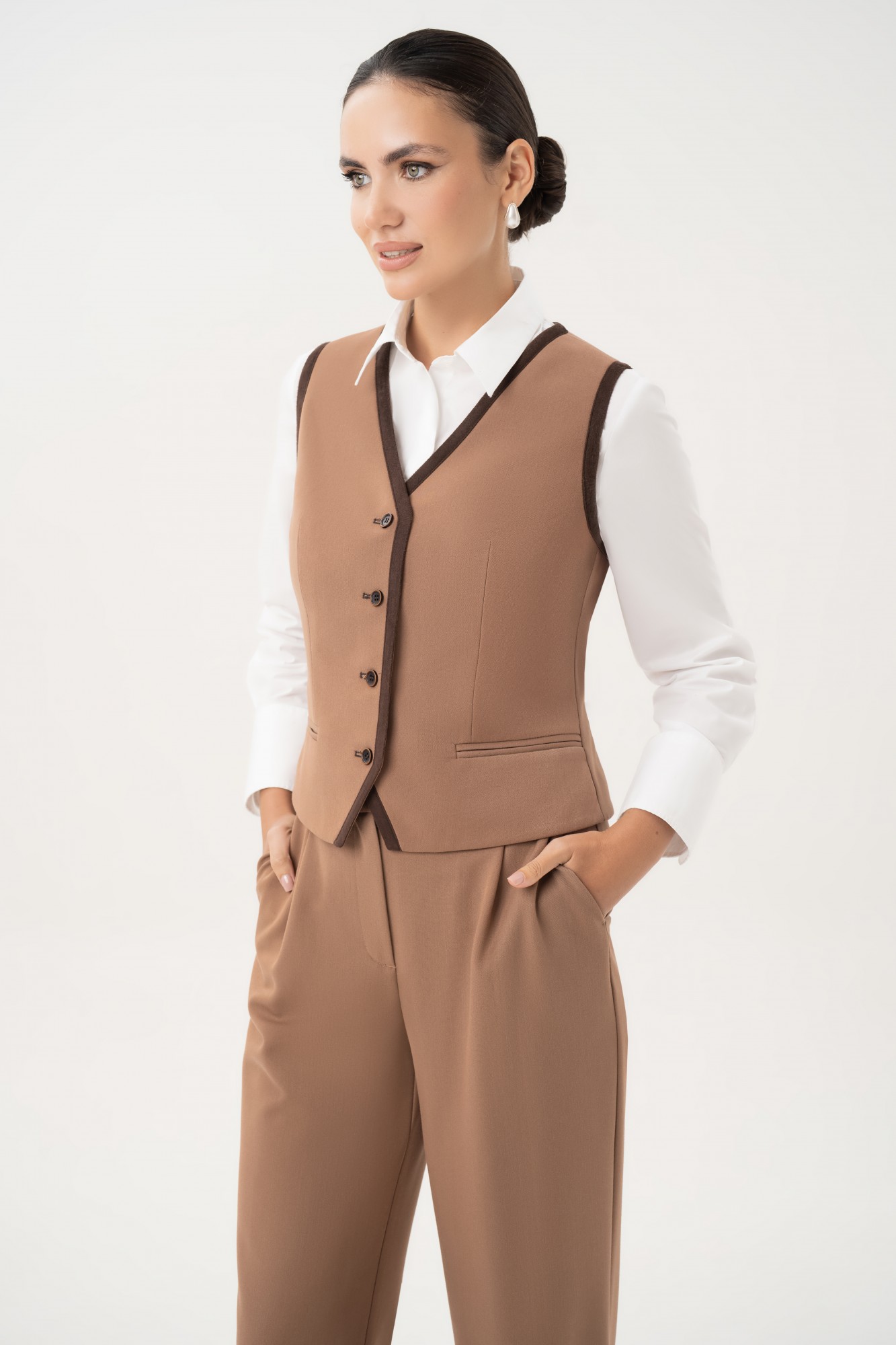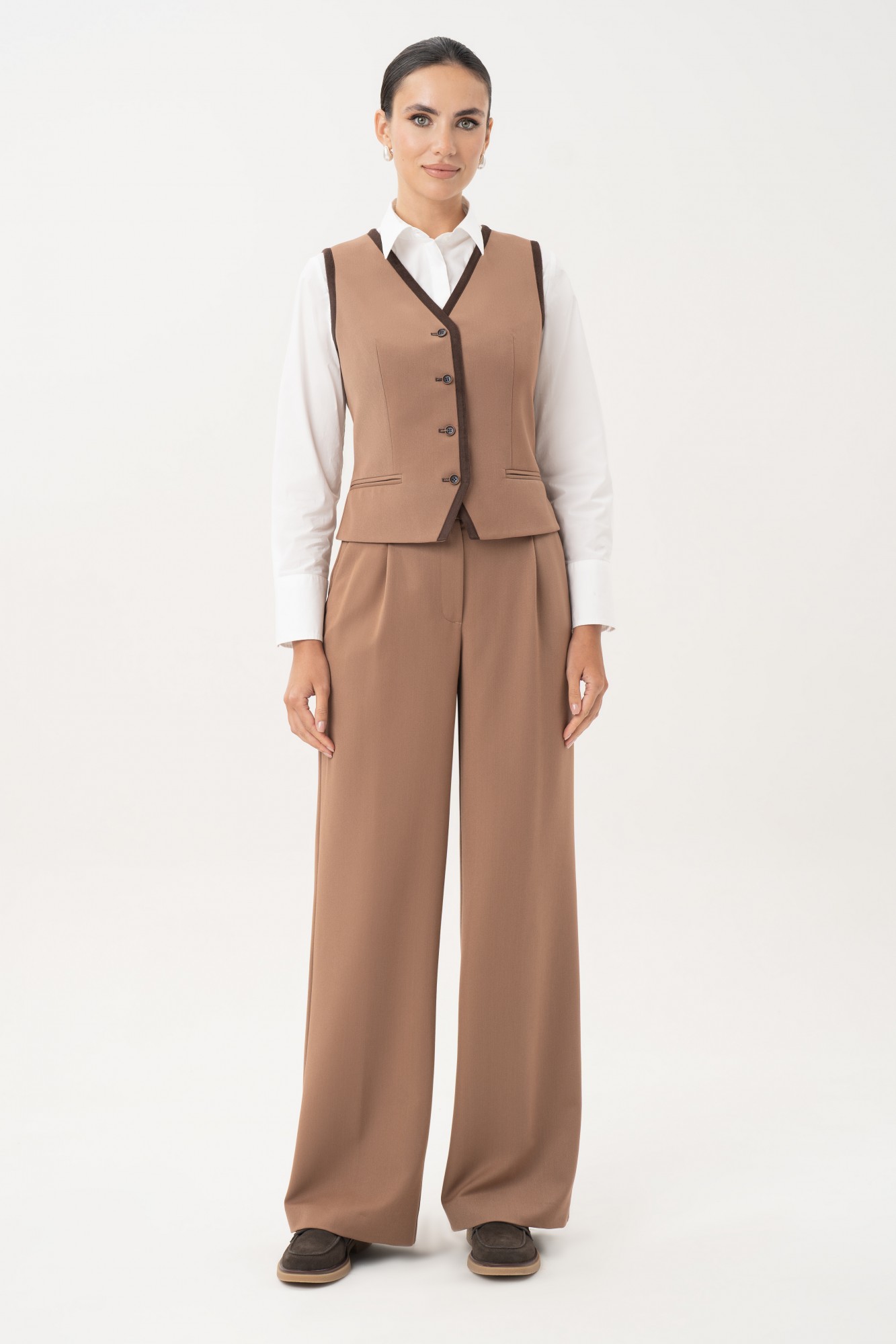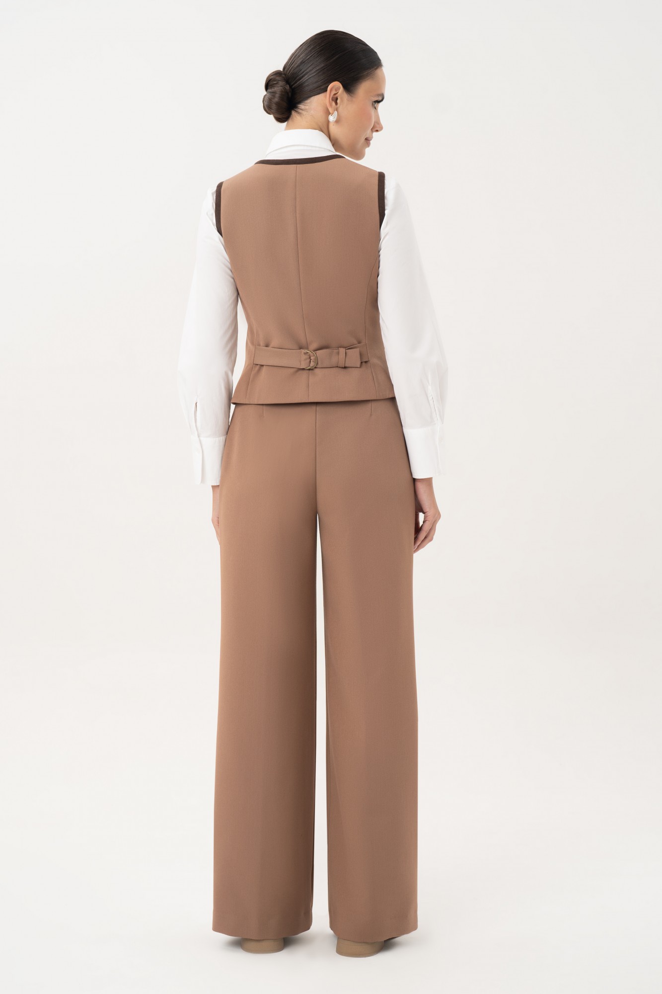 Жилет Длина спинки - 49,0 см (±2,0 см), Ширина спинки - 36,0 см (±0,5 см), Ширина на уровне глубины проймы - 49,0 см (±1,0 см), Ширина на уровне линии талии - 43,5 см (±1,0 см), Длина плеча - 9,2 см (±0,5 см). Брюки Длина по боковому шву с поясом - 112,0 см (±2,0 см), Длина внутреннего шва - 83,5 см (±0,5 см), Ширина на уровне линии талии - 39,0 см (±1,0 см), Ширина на уровне линии бедер - 53,5 см (±1,0 см), Ширина по низу - 34,0 см (±0,5 см), Ширина пояса - 4,0 см.