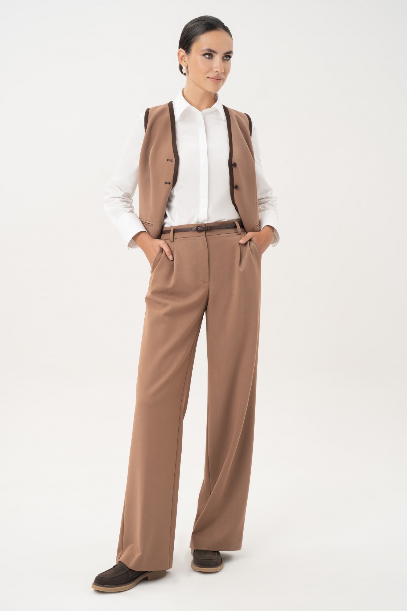 Жилет Длина спинки - 48,5 см (±2,0 см), Ширина спинки - 34,5 см (±0,5 см), Ширина на уровне глубины проймы - 45,0 см (±1,0 см), Ширина на уровне линии талии - 39,5 см (±1,0 см), Длина плеча - 9,2 см (±0,5 см). Брюки Длина по боковому шву с поясом - 111,5 см (±2,0 см), Длина внутреннего шва - 83,0 см (±0,5 см), Ширина на уровне линии талии - 35,0 см (±1,0 см), Ширина на уровне линии бедер - 49,0 см (±1,0 см), Ширина по низу - 31,5 см (±0,5 см), Ширина пояса - 4,0 см.