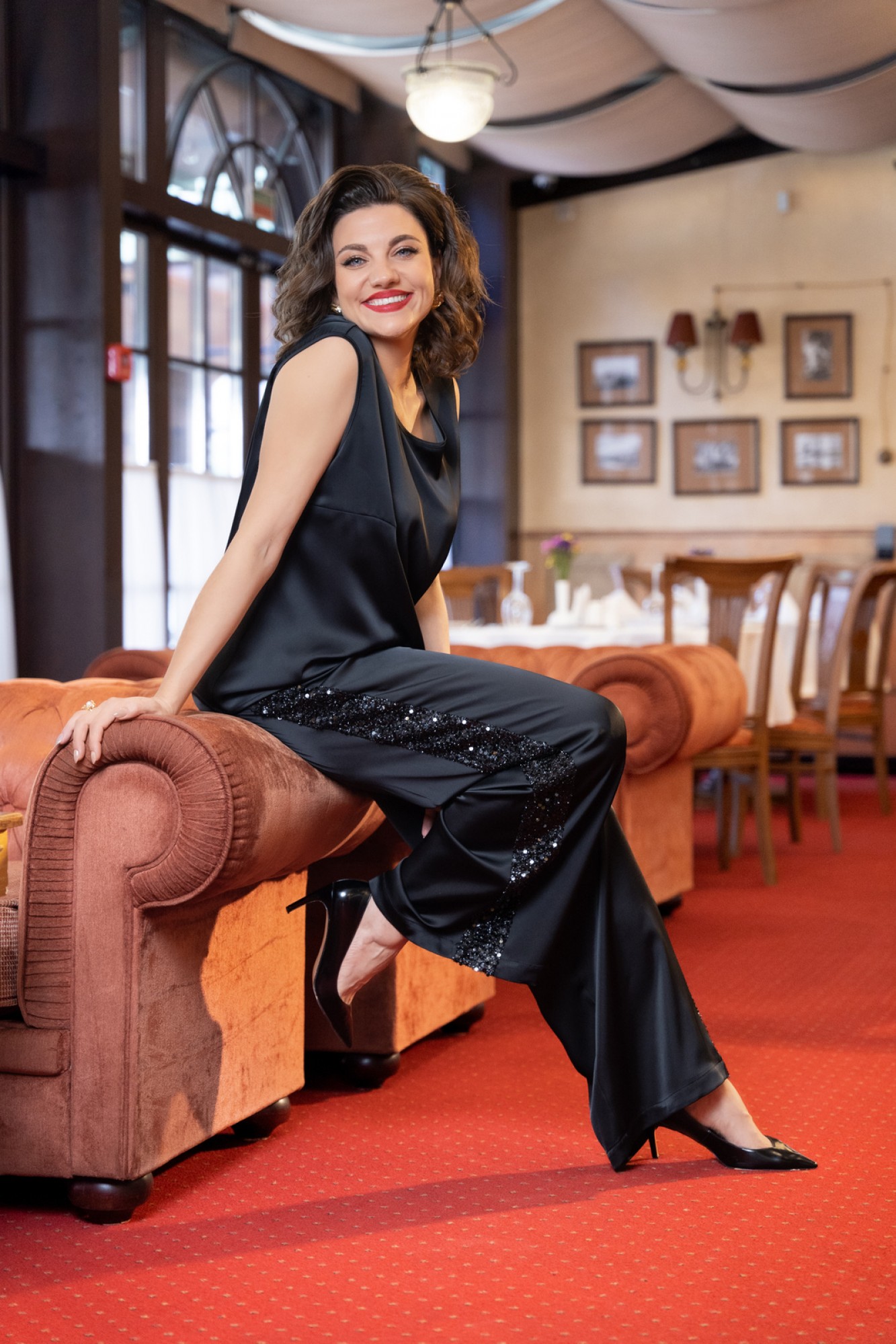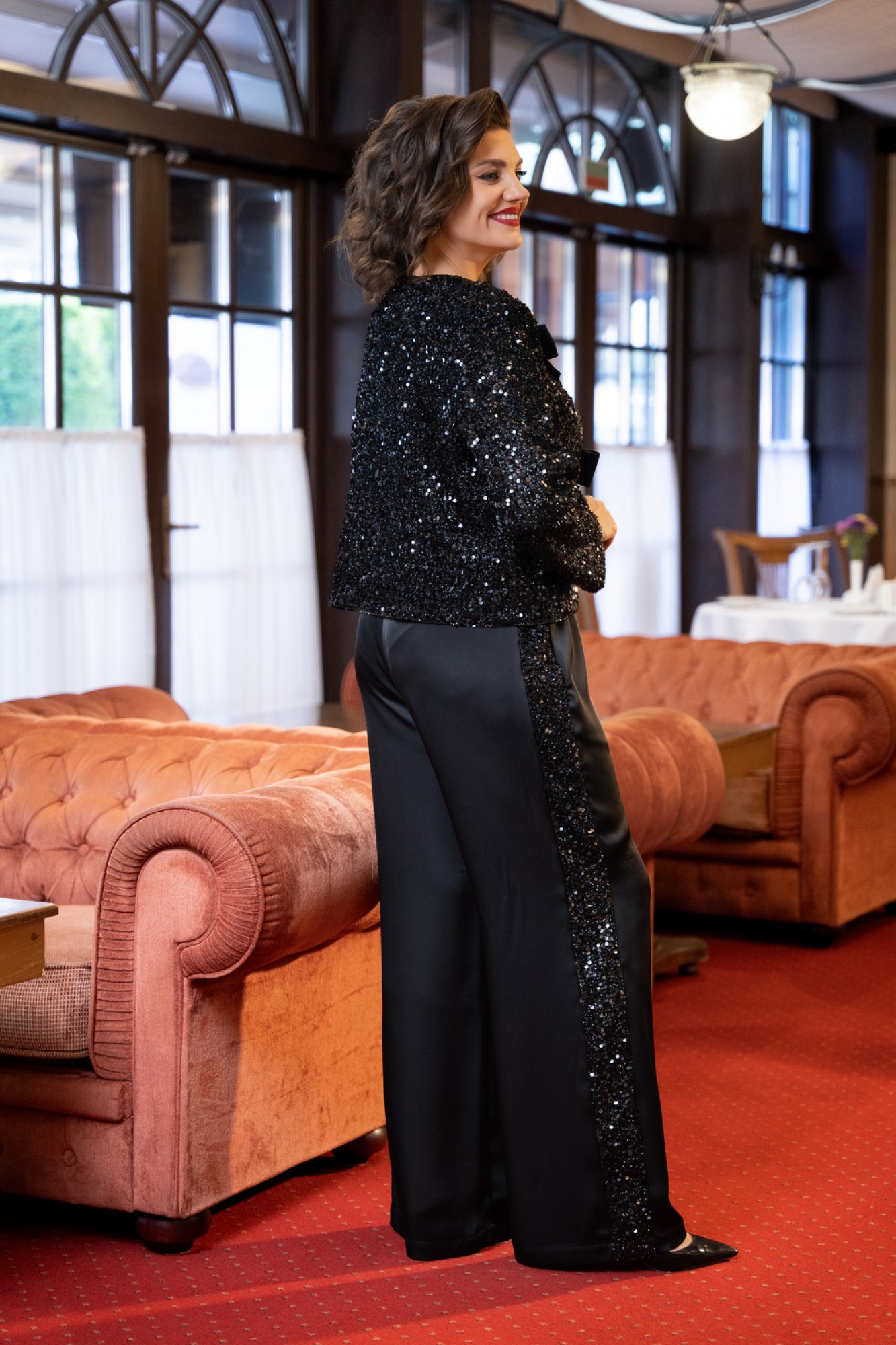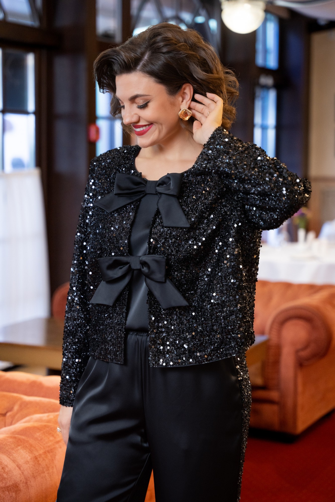 Комплект женский состоит из жакета, топа и брюк. Жакет прямого силуэта свободного покроя с естественной линией плеча на подкладке из атласной ткани. Горловина округлой формы. БАНТЫ СЪЁМНЫЕ! Застежка на съемные декоративные авторские банты с применением потайного крепления на небольшие кнопки, для возможности создания различных образов, как с бантами, так и без них. Топ свободного покроя. Горловина округлой формы. Проймы и горловина окантованы. Брюки свободные расширенного силуэта. По бокам выполнены лампасы из полотна с пайетками. Пояс притачной на резинке. В боковых швах карманы.